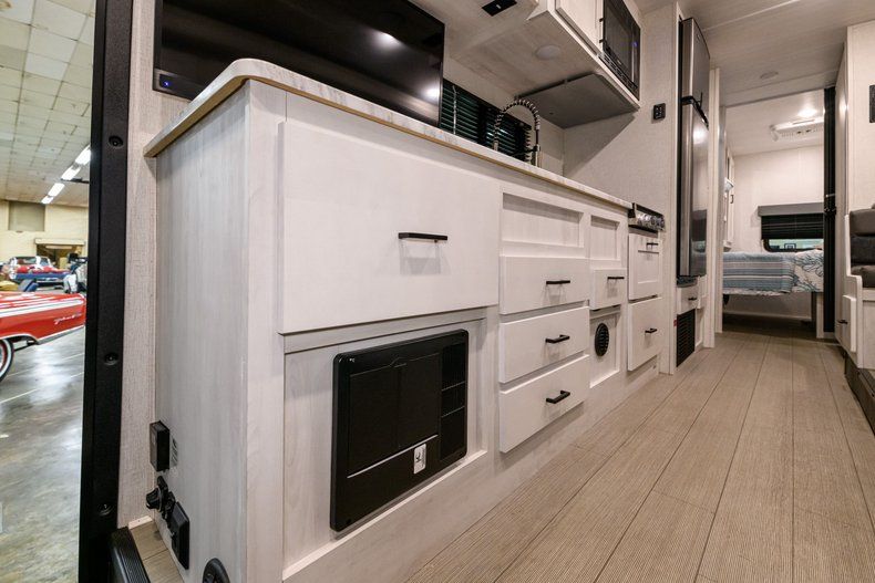 Features include swivel front buckets, walk-through cab, air conditioning, power tinted windows, cruise control and back-up/sideview cameras with monitor. Comfort options include a premium Sony sound system, with Bluetooth, LED interior lighting, flat screen TV and folding couch/bed.