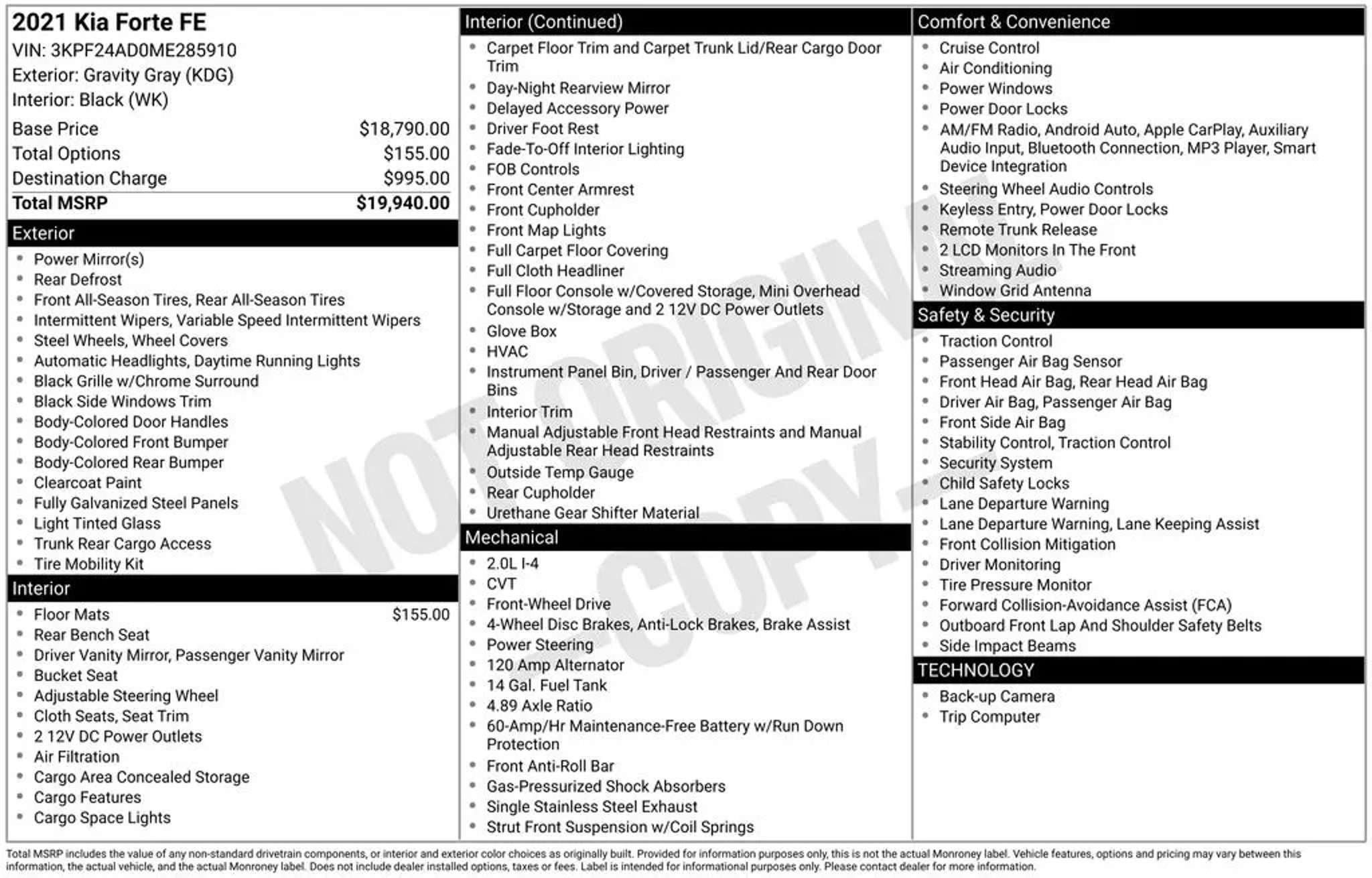 FREE 20 YEAR / 200,000 MILE POWERTRAIN WARRANTY, ONE OWNER, CLEAN CARFAX, BLUETOOTH, APPLE CARPLAY, GOOGLE ANDROID AUTO, STEERING WHEEL AUDIO CONTROLS, BACKUP CAMERA, AUTOMATIC HEADLIGHTS, 4 SPEAKERS, AIR CONDITIONING, BRAKE ASSIST, BUMPERS: BODY-COLOR, DELAY-OFF HEADLIGHTS, DRIVER VANITY MIRROR, DUAL FRONT IMPACT AIRBAGS, DUAL FRONT SIDE IMPACT AIRBAGS, LANE DEPARTURE WARNING SYSTEM, LOW TIRE PRESSURE WARNING, OCCUPANT SENSING AIRBAG, OUTSIDE TEMPERATURE DISPLAY, OVERHEAD CONSOLE, PANIC ALARM, PASSENGER VANITY MIRROR, POWER WINDOWS, REAR WINDOW DEFROSTER, REMOTE KEYLESS ENTRY, SPEED CONTROL, TELESCOPING STEERING WHEEL, TILT STEERING WHEEL, VARIABLY INTERMITTENT WIPERS, WHEELS: 15 STEEL W/WHEEL COVERS.