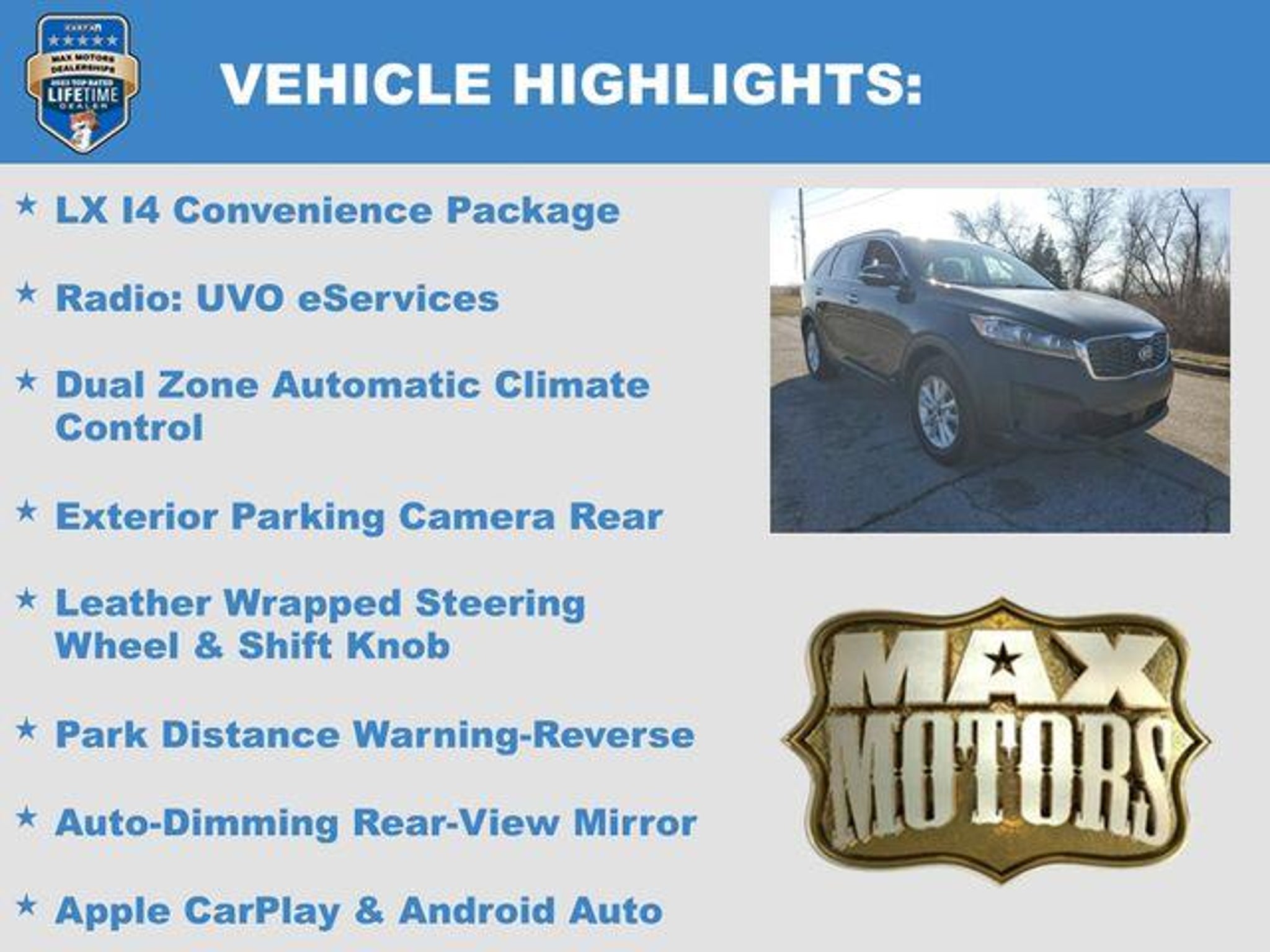Ebony Black 2020 Kia Sorento LX Odometer is 20951 miles below market average! CARFAX One-Owner. 21/26 City/Highway MPG Priced below KBB Fair Purchase Price! AWD, 10-Way Power Adjustable Driver Seat, 17 x 7.0 Alloy Wheels, Apple CarPlay & Android Auto, Auto-Dimming Rear-View Mirror, Dual Zone Automatic Climate Control, Exterior Parking Camera Rear, Heated Front Seats, Leather Wrapped Steering Wheel & Shift Knob, LX I4 Convenience Package, Park Distance Warning-Reverse, Radio: UVO eServices, Roof Rails (Silver). Awards: * JD Power Initial Quality Study (IQS) At Max Motors, our mission is simple: to provide every customer with a honest, transparent, and rewarding automotive experience. For 19 years as a family-owned business, we build strong customer relationships that go beyond a sale. Buying a vehicle is significant, and we ensure the process is smooth and straightforward.