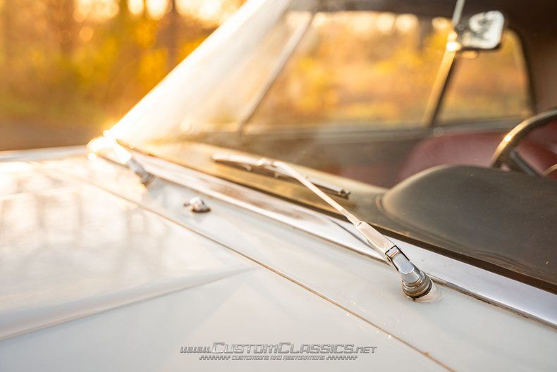 The cabin features red leather upholstery that creates a warm, inviting environment. The original leather has held up remarkably well for its age, with the driver's seat showing stretching and wear from use but remaining free of significant rips or tears. Carpeting throughout displays staining consistent with age and use. Interior door chrome shows surface rust in places. The factory AM/FM radio remains fitted in the dashboard. Like the exterior, the interior presents honestly and offers opportunities for restoration or refurbishment.