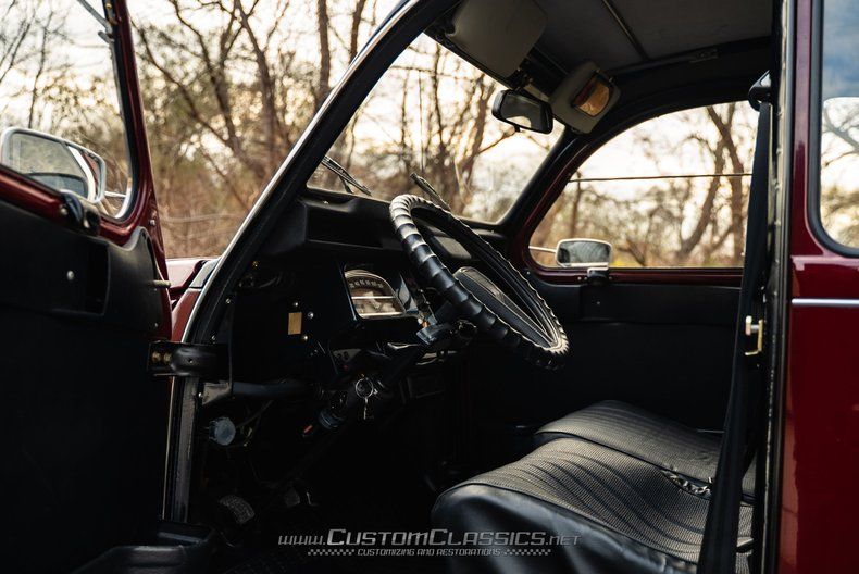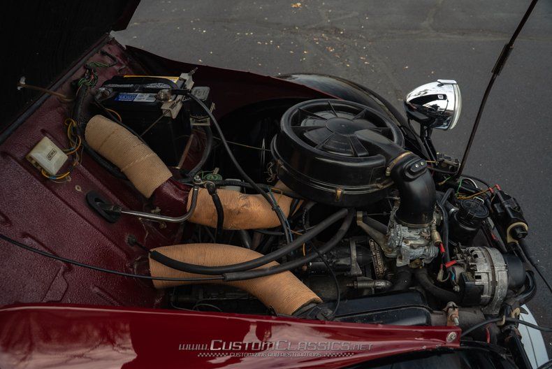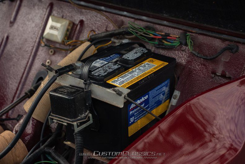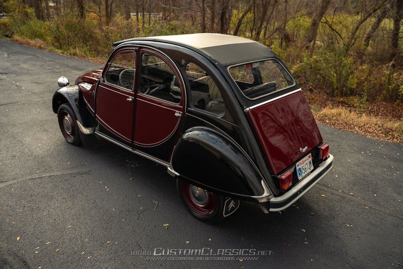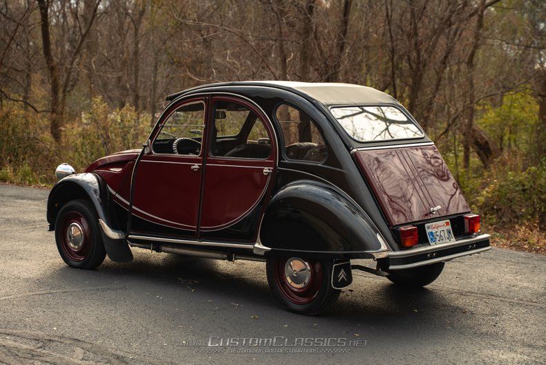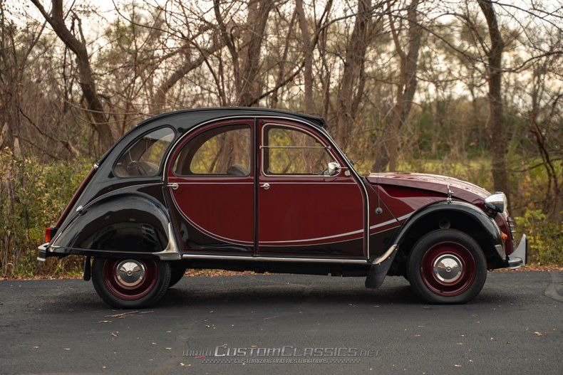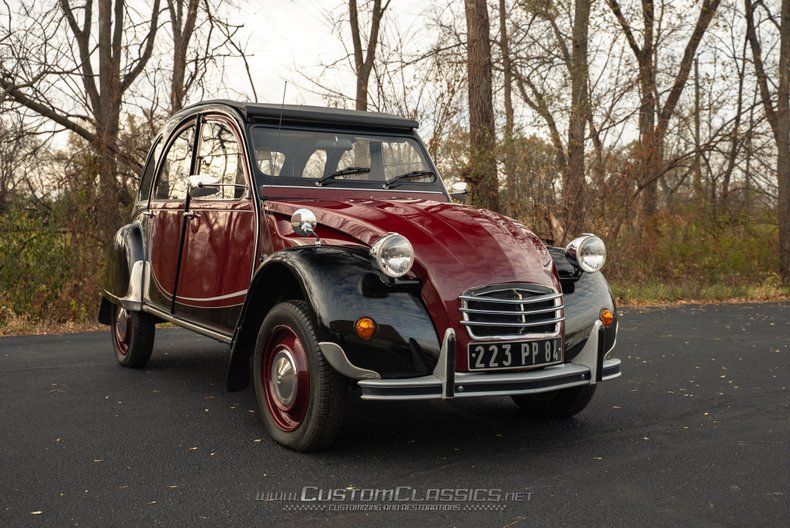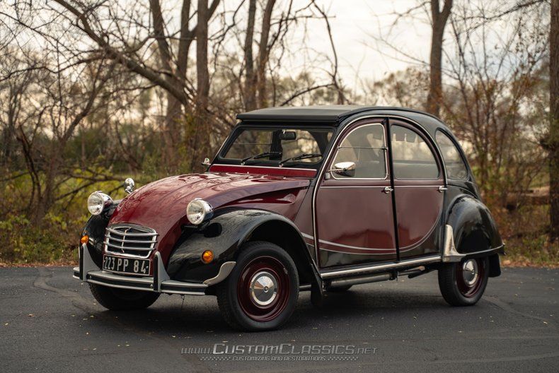 Finished in a striking combination of burgundy and black, this 2CV's color scheme evokes the beloved Charleston special edition that became one of the most sought-after variants. The burgundy body panels contrast beautifully with the black fenders and running boards, creating the distinctive two-tone appearance that made the Charleston so popular. The corrugated hood displays classic 2CV character, while chrome bumpers, headlight bezels, and trim maintain the car's vintage charm. The black canvas soft top rolls back to provide an open-air experience that's quintessentially 2CV.