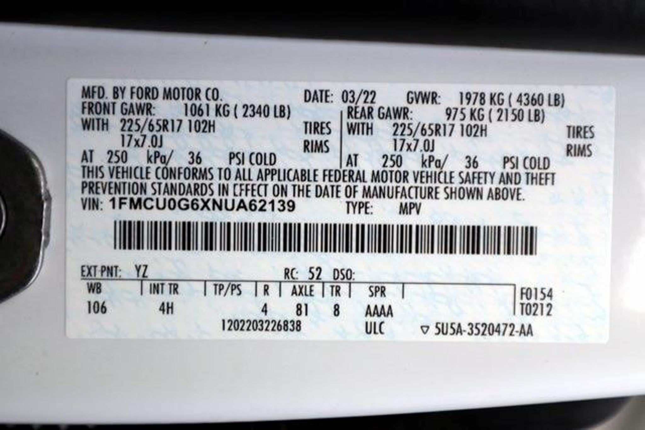 Certified. Backup Camera/ Rearview Camera Bluetooth Collision Avoidance System Collision Warning Alert System Apple Carplay/ Android Auto Keyless Access Voice Recognition Smartphone App Integration USB Port Aux Input Sirius XM Radio Parking Sensors Alloy Wheels ____CAR GURUS____ Aluminum Wheels Climate Package SE Package 3.81 Axle Ratio 4-Wheel Disc Brakes 6 Speakers ABS brakes Air Conditioning Alloy wheels AM/FM radio: SiriusXM AM/FM Stereo Auto High-beam Headlights Brake assist Bumpers: body-color Compass Delay-off headlights Driver door bin Driver vanity mirror Dual front impact airbags Dual front side impact airbags Easy Access Cargo Shade Electronic Stability Control Emergency communication system: SYNC 3 911 Assist Equipment Group 200A Exterior Parking Camera Rear FordPass Connect Four wheel independent suspension Front anti-roll bar Front Bucket Seats Front Center Armrest Front reading lights Fully automatic headlights Illuminated entry Knee airbag Low tire pressure warning Occupant sensing airbag Outside temperature display Overhead airbag Overhead console Panic alarm Passenger door bin Passenger vanity mirror Power door mirrors Power steering Power windows Radio data system Rear anti-roll bar Rear reading lights Rear window defroster Rear window wiper Remote keyless entry Speed control Speed-sensing steering Speed-Sensitive Wipers Split folding rear seat Spoiler Steering wheel mounted audio controls SYNC 3 Communications & Entertainment System Tachometer Telescoping steering wheel Tilt steering wheel Traction control Trip computer Unique Cloth Front Bucket Seats Variably intermittent wipers Wheels: 17 Shadow Silver-Painted Aluminum. CARFAX One-Owner. Odometer is 8340 miles below market average! 28/34 City/Highway MPG 2022 Ford Escape SE SE FWD 8-Speed Automatic 1.5L EcoBoost Equipment Group 200A Ford Gold Certified Certified 3.81 Axle Ratio 4-Wheel Disc Brakes 6 Speakers ABS brakes Air Conditioning Alloy wheels AM/FM radio: SiriusXM AM/FM Stereo Auto High-beam Headlights Brake assist Bumpers: body-color Compass Delay-off headlights Driver door bin Driver vanity mirror Dual front impact airbags Dual front side impact airbags Easy Access Cargo Shade Electronic Stability Control Emergency communication system: SYNC 3 911 Assist Exterior Parking Camera Rear FordPass Connect Four wheel independent suspension Front anti-roll bar Front Bucket Seats Front Center Armrest Front reading lights Fully automatic headlights Illuminated entry Knee airbag Low tire pressure warning Occupant sensing airbag Outside temperature display Overhead airbag Overhead console Panic alarm Passenger door bin Passenger vanity mirror Power door mirrors Power steering Power windows Radio data system Rear anti-roll bar Rear reading lights Rear window defroster Rear window wiper Remote keyless entry Speed control Speed-sensing steering Speed-Sensitive Wipers Split folding rear seat Spoiler Steering wheel mounted audio controls SYNC 3 Communications & Entertainment System Tachometer Telescoping steering wheel Tilt steering wheel Traction control Trip computer Unique Cloth Front Bucket Seats Variably intermittent wipers Wheels: 17 Shadow Silver-Painted Aluminum and Front License Plate Bracket. Ford Gold Certified Details: * 172 Point Inspection * Warranty Deductible: $100 * Limited Warranty: 12 Month/12000 Mile (whichever comes first) after new car warranty expires or from certified purchase date * Vehicle History * Transferable Warranty * Powertrain Limited Warranty: 84 Month/100000 Mile (whichever comes first) from original in-service date * and 22000 FordPass Rewards Points to use toward first two maintenance visits * Roadside Assistance
