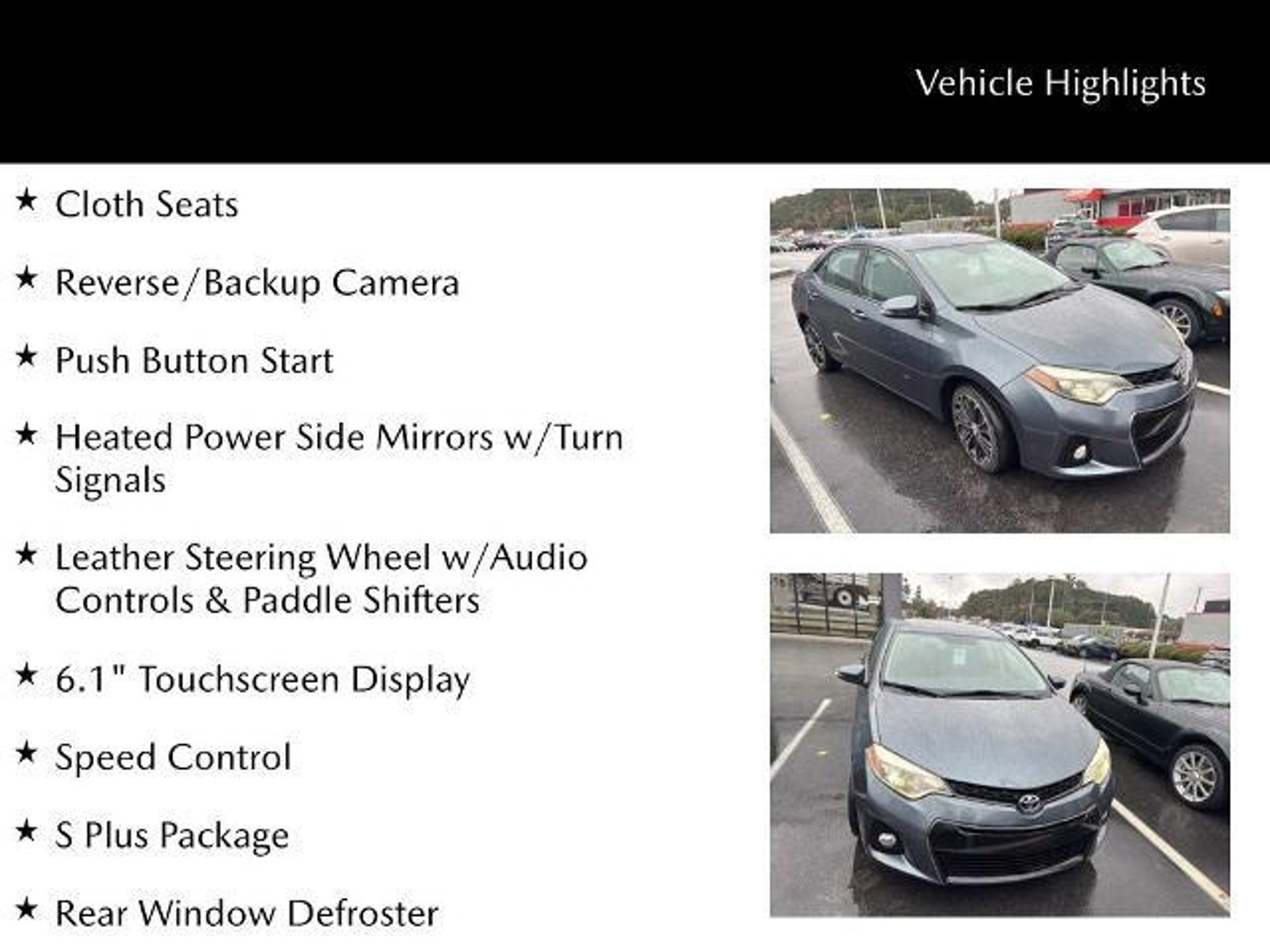 Sporty styling and low-mileage appeal define this 2015 Toyota Corolla S Plus (VIN 2T1BURHE4FC351249) with just 27,436 miles. The S Plus trim enhances its look with a bold front fascia, athletic exterior accents, and a confident on-road presence, making it stand out among compact sedans. Inside, the Corolla offers a comfortable, driver-focused layout with the modern conveniences you need for everyday commuting. Known for its efficiency and ease of ownership, the S Plus delivers a smooth, composed ride ideal for city driving, long trips, and everything in between. With exceptionally low miles for its age and the sport-inspired S Plus design, this Corolla presents a clean, stylish, and reliable choice for drivers seeking value and practicality wrapped in a sportier package. ***ONE PREVIOUS OWNER!!*** Cloth Seats, Reverse/Backup Camera, Push Button Start, 172 Point Inspection completed by our Factory Certified & ASC Trained Technicians, Recent Oil Change, Vehicle Detailed, Heated Power Side Mirrors w/Turn Signals, Leather Steering Wheel w/Audio Controls & Paddle Shifters, 6.1 Touchscreen Display, Speed Control, 17 x 7.0 Alloy Wheels, Automatic Temperature Control, Front Fog Lights, Power Windows, Rear Window Defroster, Remote Keyless Entry, S Plus Package, Spoiler, Steering Wheel Mounted Audio Controls. Savannah, GA ? J.C. Lewis Mazda Smart Choices Start Here At J.C. Lewis Mazda, we know today?s drivers are informed, connected, and always looking for smart value. That?s why we include over 20 high-resolution photos and a full walkaround video with every vehicle ? so you can evaluate the details before ever stepping on the lot. Whether you?re a tech-forward professional, a college student, or simply someone who appreciates smart engineering, Mazda delivers the perfect balance of innovation, efficiency, and driving enjoyment. We?ll gladly provide a complimentary AutoCheck or CARFAX report for full transparency. Visit us at 10101 Abercorn St in Savannah, GA or call (912) 299-3862 ? and experience a dealership that?s as forward-thinking as you are.