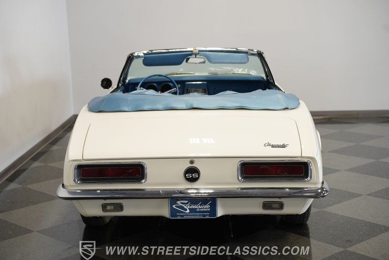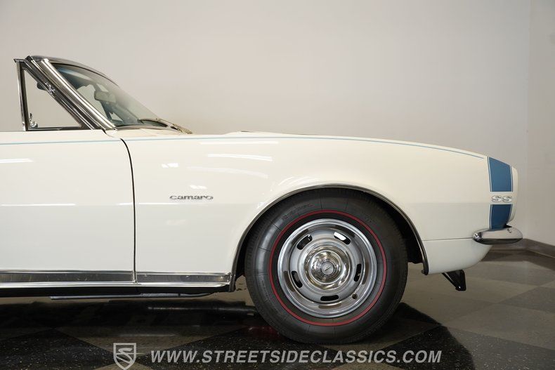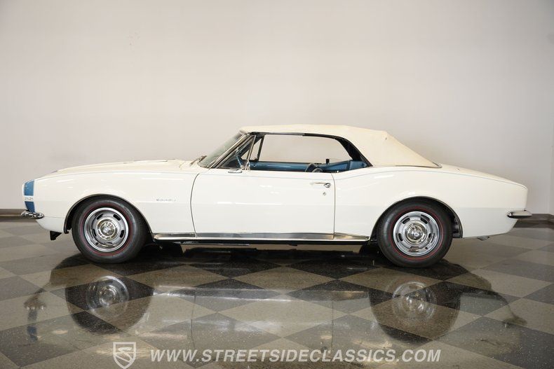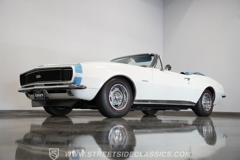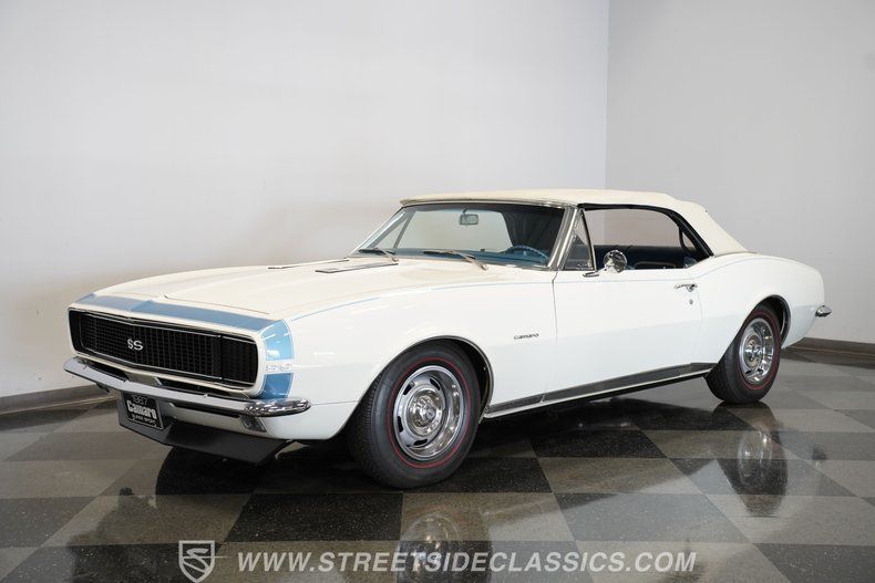 Step back in time with the 1967 Chevrolet Camaro RS/SS Convertible Tribute, a true icon of American muscle and style. This classic car embodies the spirit of the open road and the thrill of cruising with the top down on a sunny day. It's more than just a vehicle-it's a statement, a memory maker, and a collector's dream. With its stunning white paint accented by baby-blue pinstriping and a matching blue vinyl interior, this Camaro captures the essence of '60s muscle car culture. Experience the blend of vintage charm and spirited performance that only a '67 Camaro can deliver.