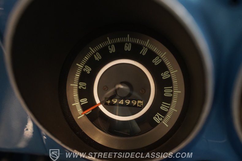 Inside, the Camaro's interior offers a pleasing blend of comfort and style. The front and rear seats feature blue vinyl with white trim, echoing the exterior's baby-blue pinstriping for a cohesive look. The door panels and carpet are in great shape, with factory gauges and metal trim maintaining authenticity. The SS steering wheel and center console with shifter add to the driving experience, while the original radio and vent controls keep the cabin true to its roots. This interior invites you to enjoy every drive in classic comfort.