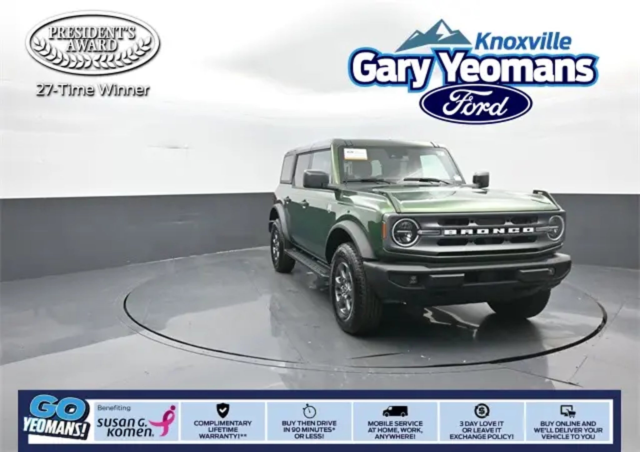 Certified. 2024 Ford Bronco Big Bend Green Metallic 4WD 2.3L EcoBoost I-4 **INCLUDED FEATURES & OPTIONS: Equipment Group 222A Mid Package (2-Door Intelligent Access w/Lock/Unlock, Ambient Footwell Lighting, Auto-Dimming Interior Rear-View Mirror, Connected Navigation, Dr & Pass Illuminated Sliding Visor Vanity Mirrors, Dual Smart Charging USB Ports, Dual-Zone Electronic Automatic Temperature Control, Front Row Heated Seats, Power Outlet - Back Side of Center Floor Console, and Rear Parking Sensors), Ford Blue Certified Certified, 4-Wheel Disc Brakes, 7 Speakers, ABS brakes, Air Conditioning, Alloy wheels, AM/FM radio: SiriusXM with 360L, AM/FM Stereo, Auto High-Beam Headlamps, Auto High-beam Headlights, BLIS Blind Spot Information System, Brake assist, Carbonized Gray Molded-In-Clr Hard Top w/o Headliner, Compass, Delay-off headlights, Driver door bin, Driver vanity mirror, Dual front impact airbags, Dual front side impact airbags, Electronic Stability Control, Emergency communication system: 911 Assist, Exterior Parking Camera Rear, Front anti-roll bar, Front Bucket Seats, Front Center Armrest, Front fog lights, Front reading lights, Front Row Top Panels Storage Bag, Front wheel independent suspension, Fully automatic headlights, Heated door mirrors, Illuminated entry, Integrated roll-over protection, Lane-Keeping System, Leather Shift Knob, Low tire pressure warning, Marine Grade Vinyl Bucket Seats, Occupant sensing airbag, Outside temperature display, Overhead airbag, Overhead console, Panic alarm, Passenger door bin, Passenger vanity mirror, Powder Coated Tube Step, Power door mirrors, Power steering, Power windows, Pre-Collision Assist w/Automatic Emergency Braking, Radio data system, Rear-View Camera, Rear-Window Defroster & Washer, Remote keyless entry, Security system, SiriusXM Radio w/360L, Speed control, Split folding rear seat, Steering wheel mounted audio controls, SYNC 4, Tachometer, Telescoping steering wheel, Tilt steering wheel, Traction control, Trip computer, Variably intermittent wipers, and Wheels: 17 Carbonized Gray-Painted Aluminum. Ford Blue Certified Details: * 139 Point Inspection * Limited Warranty: 3 Month/4,000 Mile (whichever comes first) after new car warranty expires or from certified purchase date * Transferable Warranty * and 11,000 FordPass Rewards Points to use toward first maintenance visit * Warranty Deductible: $100 * Vehicle History * Roadside Assistance At Gary Yeomans Ford Knoxville we offer Market Based Pricing, so please call to check on the availability of this vehicle.