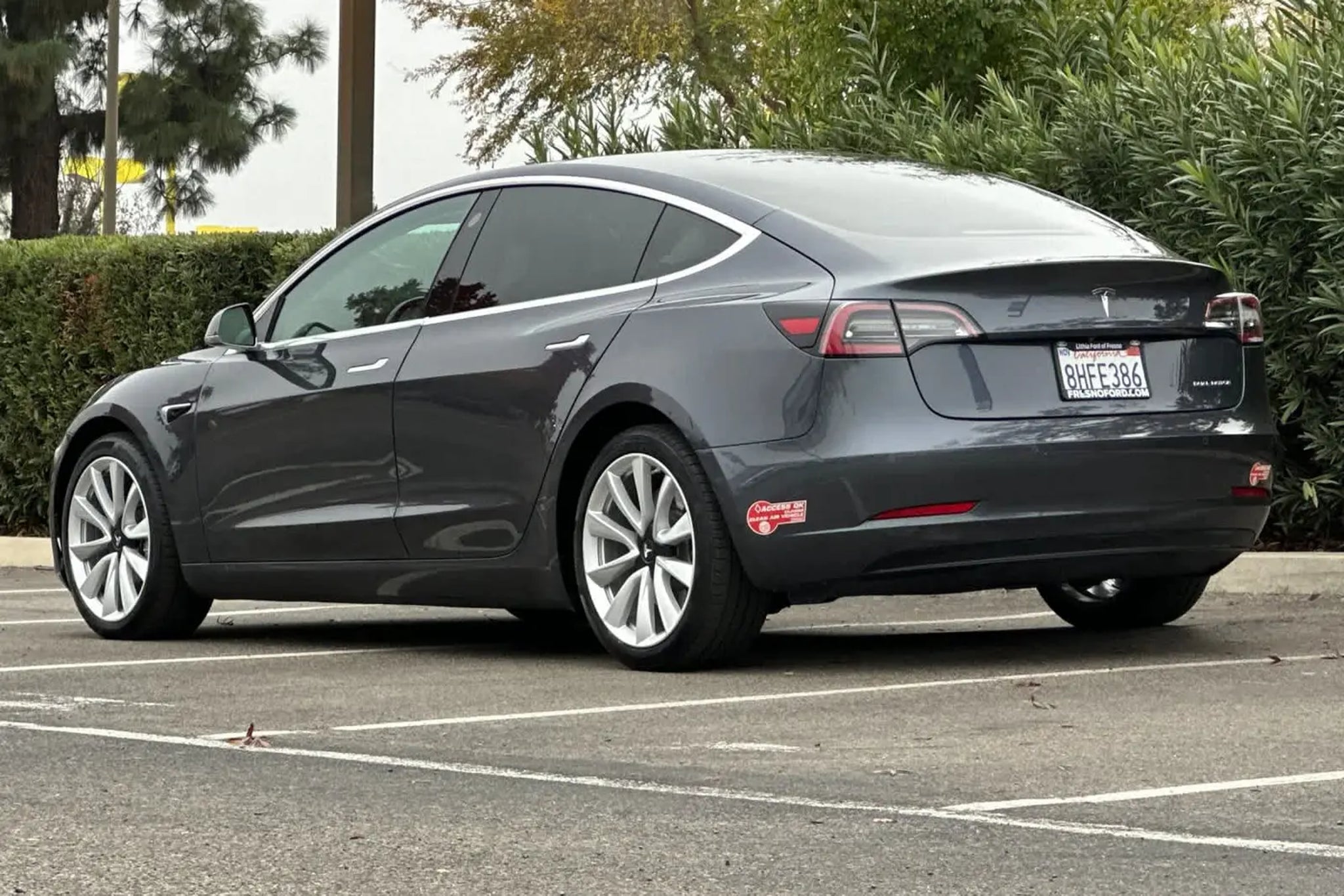 ??For more information on this vehicle please call Lithia Ford Lincoln of Fresno @ 559.777.6952??? Lithia Ford and Lincoln of Fresno is pleased to offer this Gray 2018 Tesla Model 3 for purchase, this vehicle is well equipped with many features including: 15 Speakers, 4-Wheel Disc Brakes, ABS brakes, Air Conditioning, Alloy wheels, Auto High-beam Headlights, Auto-dimming door mirrors, Auto-dimming Rear-View mirror, Automatic temperature control, Brake assist, Bumpers: body-color, Compass, Delay-off headlights, Driver door bin, Driver vanity mirror, Dual front impact airbags, Dual front side impact airbags, Electronic Stability Control, Exterior Parking Camera Rear, Four wheel independent suspension, Front anti-roll bar, Front Bucket Seats, Front Center Armrest, Front dual zone A/C, Front fog lights, Front reading lights, Fully automatic headlights, Garage door transmitter: Homelink, Genuine wood dashboard insert, Heated door mirrors, Heated Front Bucket Seats, Heated front seats, Heated rear seats, Illuminated entry, Knee airbag, Lane Departure Warning System, Low tire pressure warning, Memory seat, Navigation System, Occupant sensing airbag, Outside temperature display, Overhead airbag, Passenger door bin, Passenger vanity mirror, Power door mirrors, Power driver seat, Power passenger seat, Power steering, Power windows, Radio data system, Radio: FM w/Premium Audio System, Rear reading lights, Rear seat center armrest, Rear window defroster, Remote keyless entry, Security system, Speed control, Speed-sensing steering, Split folding rear seat, Steering wheel memory, Steering wheel mounted A/C controls, Steering wheel mounted audio controls, Synthetic Leather Seat Trim, Telescoping steering wheel, Tilt steering wheel, Traction control, Trip computer, Variably intermittent wipers, and Wheels: 18 Aero. AWD Electric Motor 1-Speed Automatic Recent Arrival! 120/112 City/Highway MPG Visit Us at Lithia Ford Lincoln of Fresno, where our goal is to always exceed your expectations. The moment you walk into our showroom, our knowledgeable and courteous team will help you find a new or used vehicle in youll love.