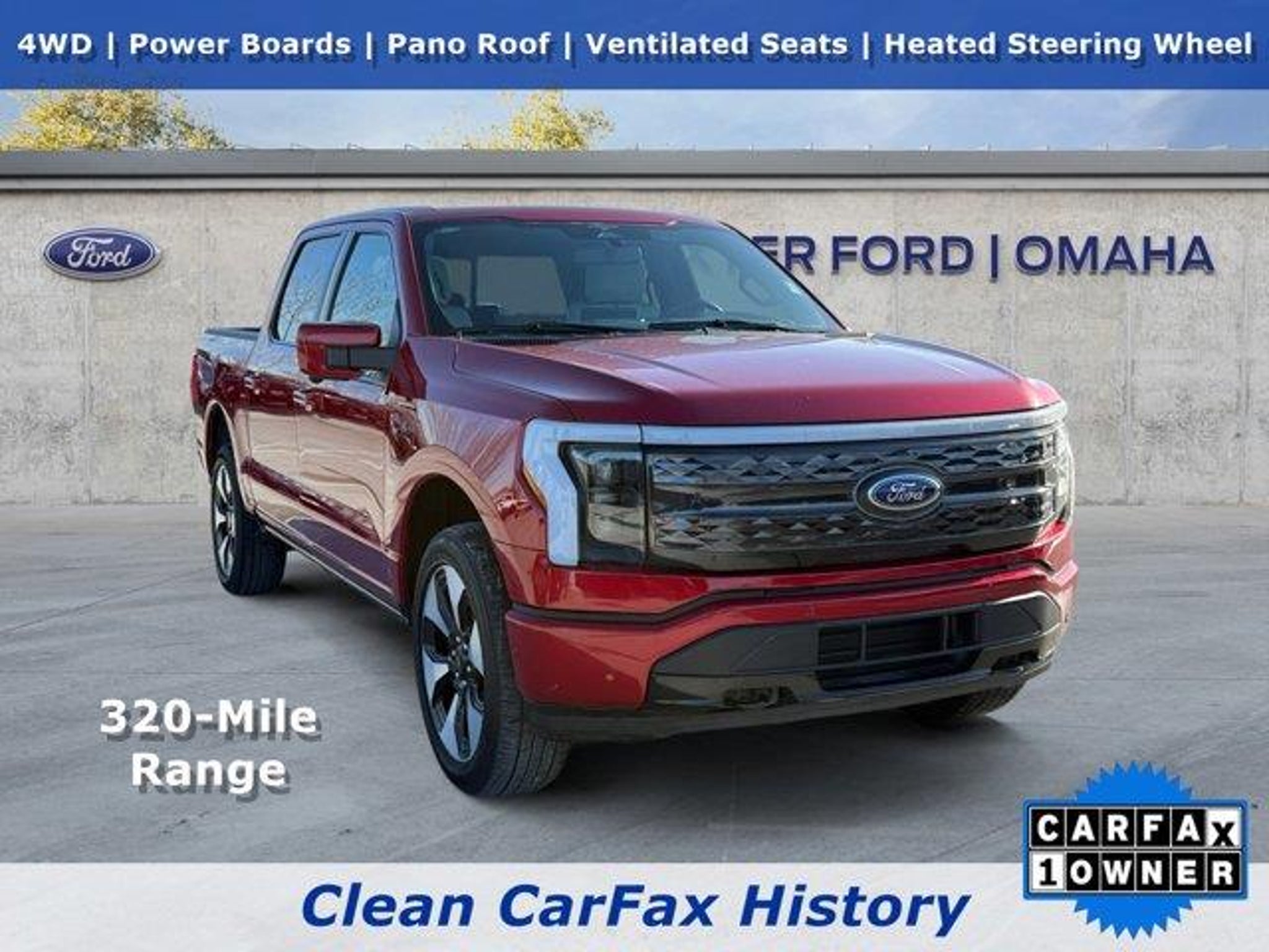 This 2023 Ford F-150 Lightning Platinum is the future of trucking, combining legendary F-Series capability with all-electric performance. This 1-owner CARFAX Lightning has been well maintained and offers instant torque, smooth acceleration, and the freedom of skipping the gas pump altogether perfect for drivers ready to save money and embrace cutting-edge technology.Step inside the Platinum cabin and you're greeted with true luxury, featuring PREMIUM LEATHER INTERIOR, a massive 15.5-INCH TOUCHSCREEN, and a panoramic TWIN-PANEL MOONROOF that floods the interior with natural light. Advanced connectivity, intuitive controls, and refined materials make every drive quiet, comfortable, and confidently upscale.Safety and innovation go hand in hand with Ford Co-Pilot360 technology, including ADAPTIVE CRUISE CONTROL, lane-keeping features, blind-spot monitoring, and a 360-degree camera system. With impressive electric range, rapid charging capability, and smart onboard power features, this Lightning is as practical for work as it is impressive on the road.This Lightning is Ford Gold Certified, meaning it has passed a meticulous 172-point inspection and includes a Ford-backed 12-Month, 12,000-Mile LIMITED COMPREHENSIVE WARRANTY (whichever occurs first), along with the remaining factory 8-Year/100,000-Mile electric vehicle component coverage and Ford-Pass Reward Points for added value and peace of mind. Best of all, it's backed by NO DOC FEES, NO HANDOFFS, NO HASSLES, AND NO SURPRISES.If you're ready to experience premium luxury, all-electric power, and serious long-term savings, this F-150 Lightning Platinum is ready for you. Stop by BAXTER FORD of OMAHA today and take this next-generation truck for a test drive, you'll see why electric has never made more sense.18 Speakers, Adjustable Pedals, Auto High-Beam Headlights, Auto Tilt-Away Steering Wheel, Auto-Dimming Rear-View Mirror, Automatic Temperature Control, Driver Memory Settings, Emergency Communication System: SYNC 4 911 Assist, Equipment Group 710A Standard, Front Dual-Zone A/C, Fully Automatic Headlights, Heated Front Seats, HEATED REAR SEATS [2nd Row], HEATED STEERING WHEEL, HomeLink Universal Garage Door Opener, Moonroof (Sunroof), Navigation System (1-year Trial Included), Pedal Memory, Power Driver Seat, Power Passenger Seat, Radio data system, Radio: B&O Unleashed Sound System by Bang & Olufsen, Rain Sensing Wipers, Rear Window Defroster, Remote Keyless Entry, Steering Wheel Memory, Steering Wheel Mounted Audio Controls, SYNC 4A w/Enhanced Voice Recogn