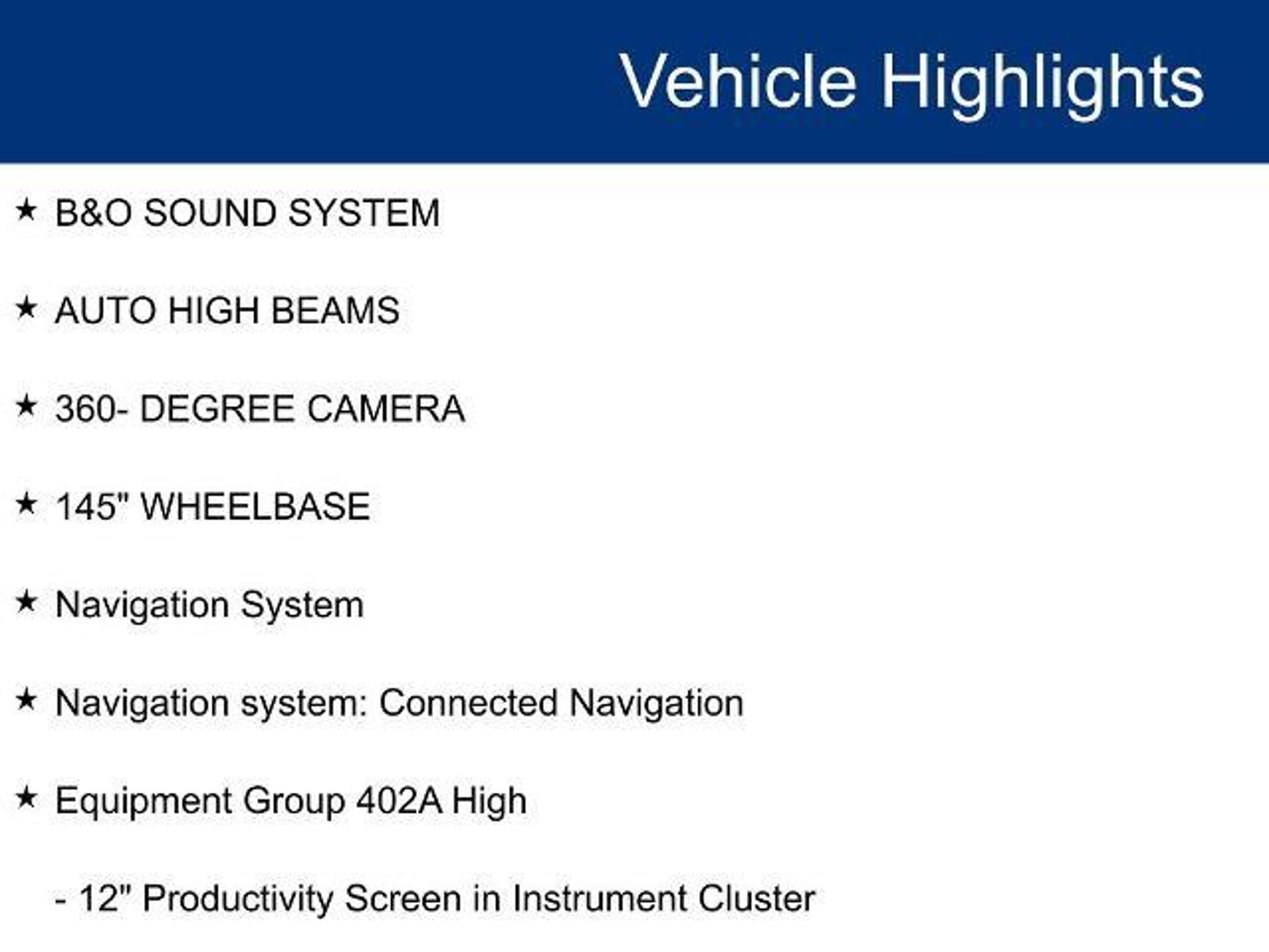 PANORAMIC ROOF / DUAL SUNROOFS / TWIN PANEL MOONROOF, POWER MOONROOF / SUNROOF / POWER TILT SLIDING ROOF, VOICE ACTIVATED NAVIGATION, NAVIGATION / GPS / NAV, FORD CO-PILOT360, BLIS / BLIND SPOT MONITORING / BLIND SIDE ALERT, DYNAMIC RADAR CRUISE CONTROL / ADAPTIVE CRUISE CONTROL / SMART CRUISE CONTROL, LANE DEPARTURE WARNING, LANE DEPARTURE ALERT / LANE KEEPING ALERT, REARVIEW CAMERA / BACK UP CAMERA / REVERSE CAMERA, REAR VIEW CAMERA WDYNAMIC GUIDELINES, ANDROID AUTO & APPLE CARPLAY, LEATHER SEATS, HEATED & COOLED FRONT ROW SEATS, HEATED FRONT ROW SEATS, HEATED SECOND ROW SEATS, POWER WINDOWS & LOCKS, FOUR WHEEL DRIVE / 4WD / 4X4, STEERING WHEEL AUDIO CONTROLS, CRUISE CONTROL, SYNC 4, WIRELESS CHARGING, REMOTE START, REAR CROSS TRAFFIC ALERT, PUSH-BUTTON START, POWER TAILGATE LOCK, POWER SLIDING REAR WINDOW, BLUETOOTH AUDIO STREAMING, HEATED STEERING WHEEL, DUAL ZONE A/C CONTROLS, BLUETOOTH, BACK UP SENSORS, B&O SOUND SYSTEM, AUTO HIGH BEAMS, 360- DEGREE CAMERA, 145 WHEELBASE, 12 Productivity Screen in Instrument Cluster, 2nd Row Heated Seats, 360 Degree Camera, 4-Wheel Disc Brakes, ABS brakes, Advanced Security Pack, Air Conditioning, Auto High-beam Headlights, Automatic temperature control, Brake assist, Compass, Connected Built-In Navigation, Delay-off headlights, Electronic Locking w/3.73 Axle Ratio, Electronic Stability Control, Equipment Group 402A High, Evasive Steering Assist, Exterior Parking Camera Rear, Ford Co-Pilot360 Assist 2.0, Front Bucket Seats, Front Center Armrest, Front dual zone A/C, Front reading lights, Fully automatic headlights, GVWR: 7,050 lbs Payload Package, Heated front seats, Heated Steering Wheel, Intelligent Adaptive Cruise Control w/Stop & Go, Intersection Assist, LED Projector w/Dynamic Bending Headlamps, Low tire pressure warning, Navigation System, Navigation system: Connected Navigation, Panic alarm, Passenger door bin, Power Glass Sideview Mirr w/Body-Color Skull Caps, Power passenger seat, Power steering, Power Tilt/Telescoping Steering Column w/Memory, Power windows, Power-Adjustable Pedals w/Memory, Power-Sliding Rear Window, Pro Trailer Backup Assist & Pro Trailer Hitch Assist, Radio: B&O Sound System by Bang & Olufsen, Rain-Sensing Wipers, Rear window defroster, Remote keyless entry, Speed control, Speed Sign Recognition, Speed-sensing steering, Split folding rear seat, Steering wheel mounted audio controls, Traction control, Twin Panel Moonroof, Unique Tremor Leather-Trimmed Bucket Seats, Universal Garage Door Opener, Variably intermittent wipers, Wireless Char
