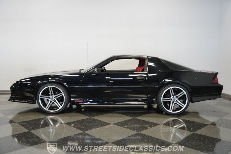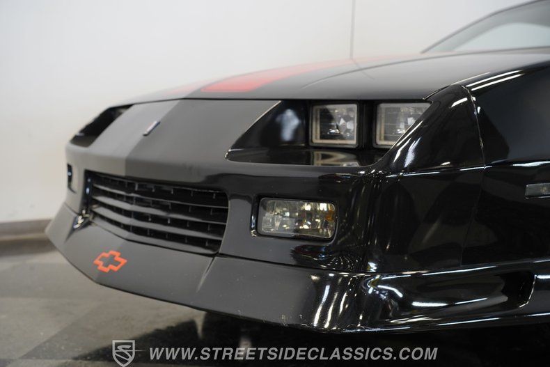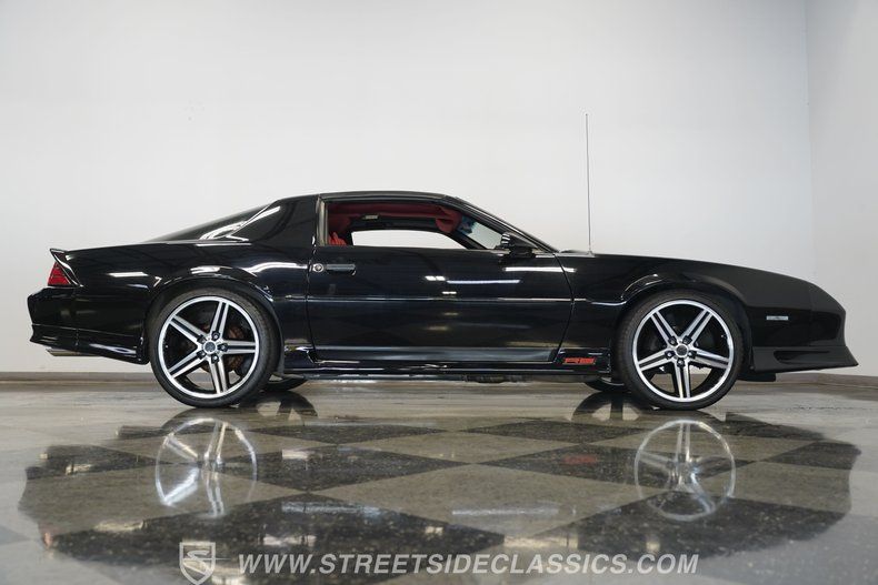 305 V8 Engine 700R4 Automatic Transmission Electronic Fuel Injection (TBI) 37,881 Believed to be Actual Miles Power Disc Front Brakes 10 Bolt Rear Axle Stock Suspension Black Paint Red Stripes 20-Inch IROC Wheels T-Tops Additional Touchscreen Radio Flame Red Interior with Bucket Seats Floor Shifter Center Console Factory AM/FM/Cassette Player Power Windows 25th Anniversary Dash Plaque