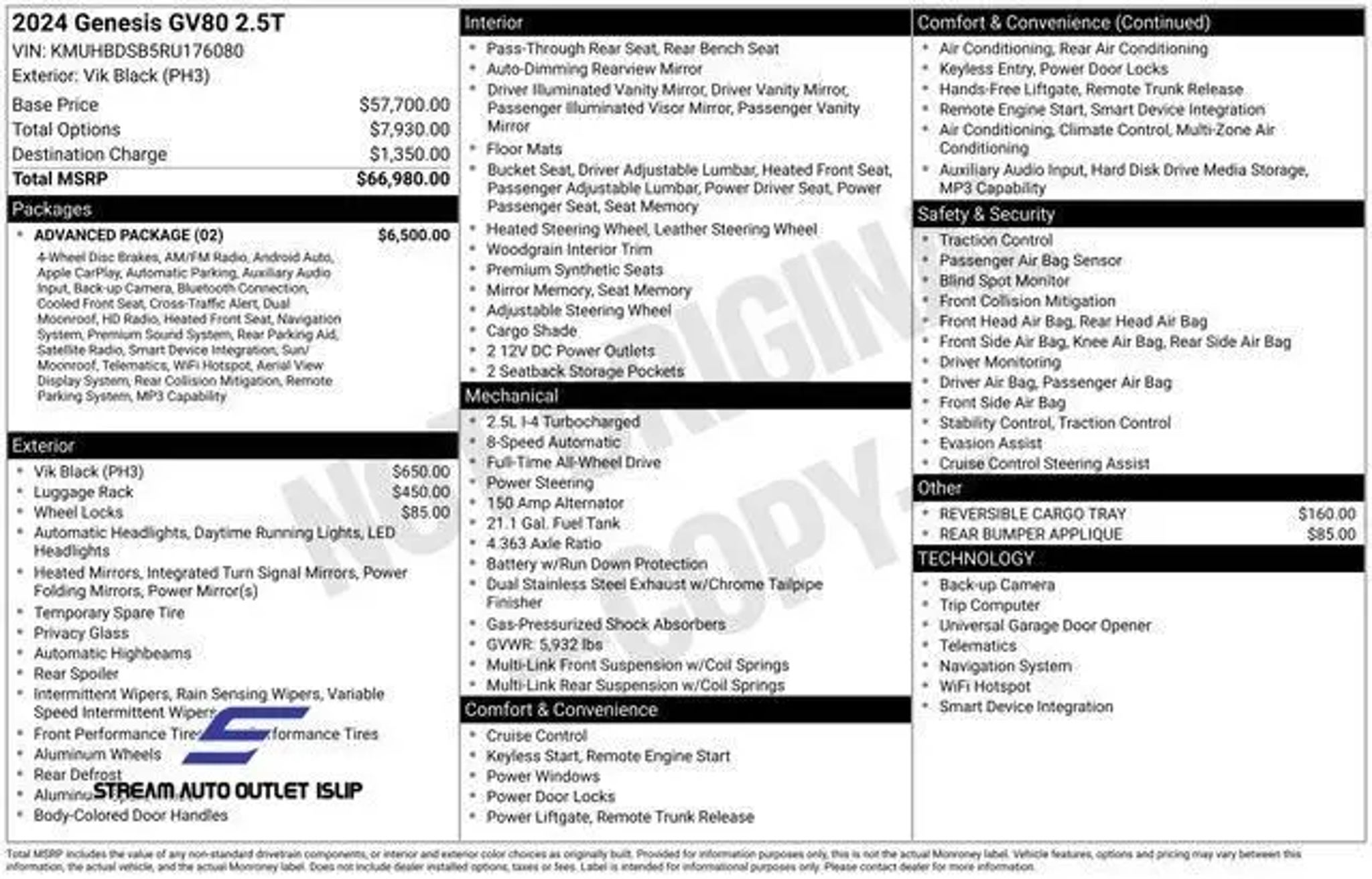 CARFAX One-Owner. 2024 Genesis GV80 Vik Black Odometer is 26323 miles below market average! Priced below KBB Fair Purchase Price! Welcome to Stream Auto Outlet Islip"”where everyone drives. With 400 vehicles available and financing options for all credit types, we make approvals simple for customers with ITINs, new credit, bad credit, or no SSN. Our team is known for getting deals done and helping drivers across Long Island get into reliable, high-quality vehicles every day. No stress. No judgment. Just straightforward car buying.