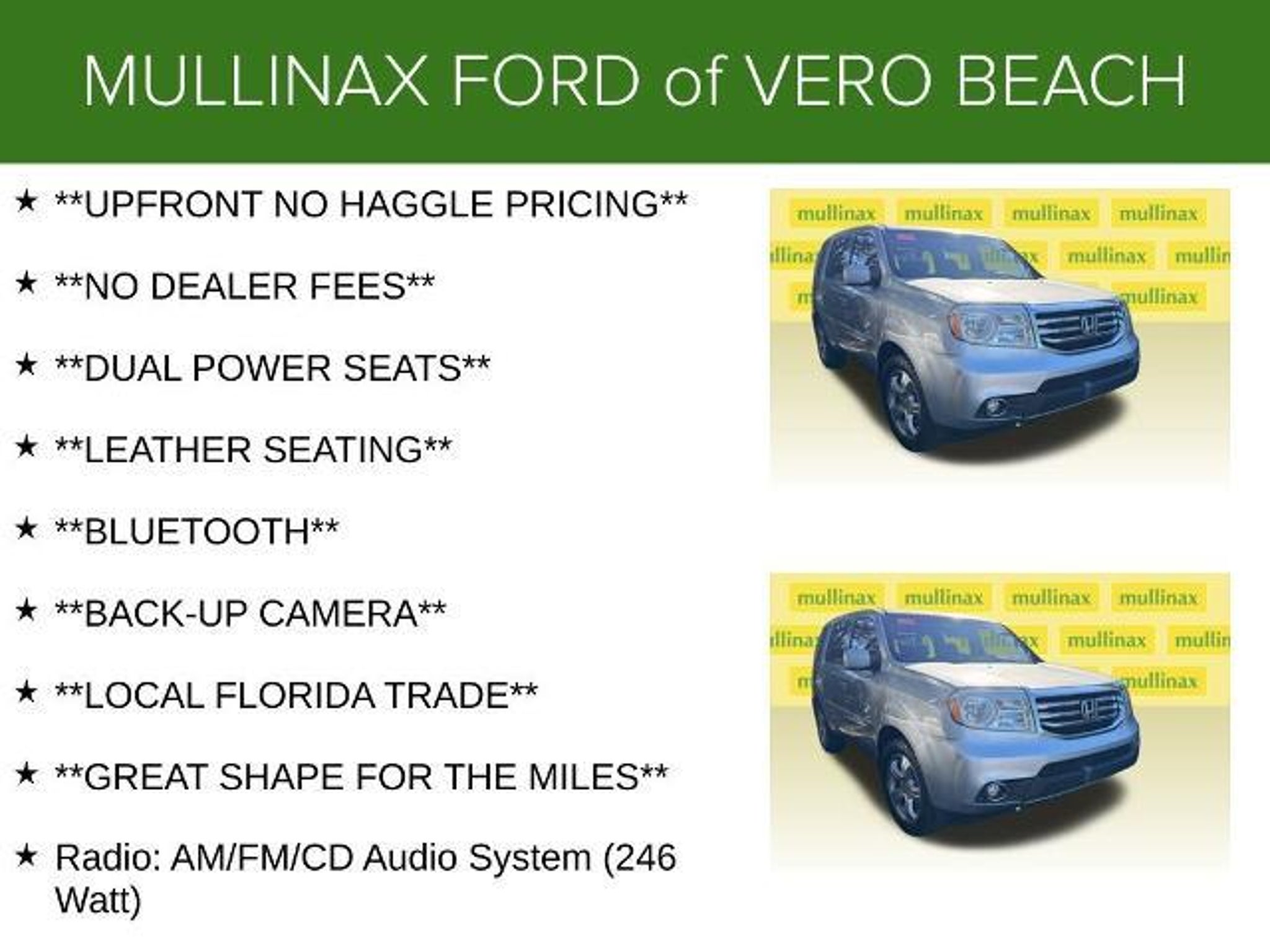 **UPFRONT NO HAGGLE PRICING**, **NO DEALER FEES**, **DUAL POWER SEATS**, **LEATHER SEATING**, **BLUETOOTH**, **BACK-UP CAMERA**, **LOCAL FLORIDA TRADE**, **GREAT SHAPE FOR THE MILES**, Heated front seats, Power moonroof, Radio: AM/FM/CD Audio System (246 Watt), XM Radio. 4WD 3.5L V6 24V SOHC i-VTEC Odometer is 9000 miles below market average! Clean CARFAX. Mullinax Bronze vehicles are sold AS IS, all repairs are the responsibility of the customer. You will get the reassurance of a 5 DAY/300-MILE RETURN POLICY, if you don't like it, bring it back! Mullinax has 4,000 vehicles to choose from! ALL VEHICLES ARE GUARANTEED 1 KEY and MAY NOT HAVE FLOORMATS UNLESS CPO or NEW. **WHY MULLINAX: UpFront Discounted Pricing SINCE 1970; No Dealer Fee; Hassle/Haggle FREE; âWE PRICE OUR CARS, NOT OUR CUSTOMER!â