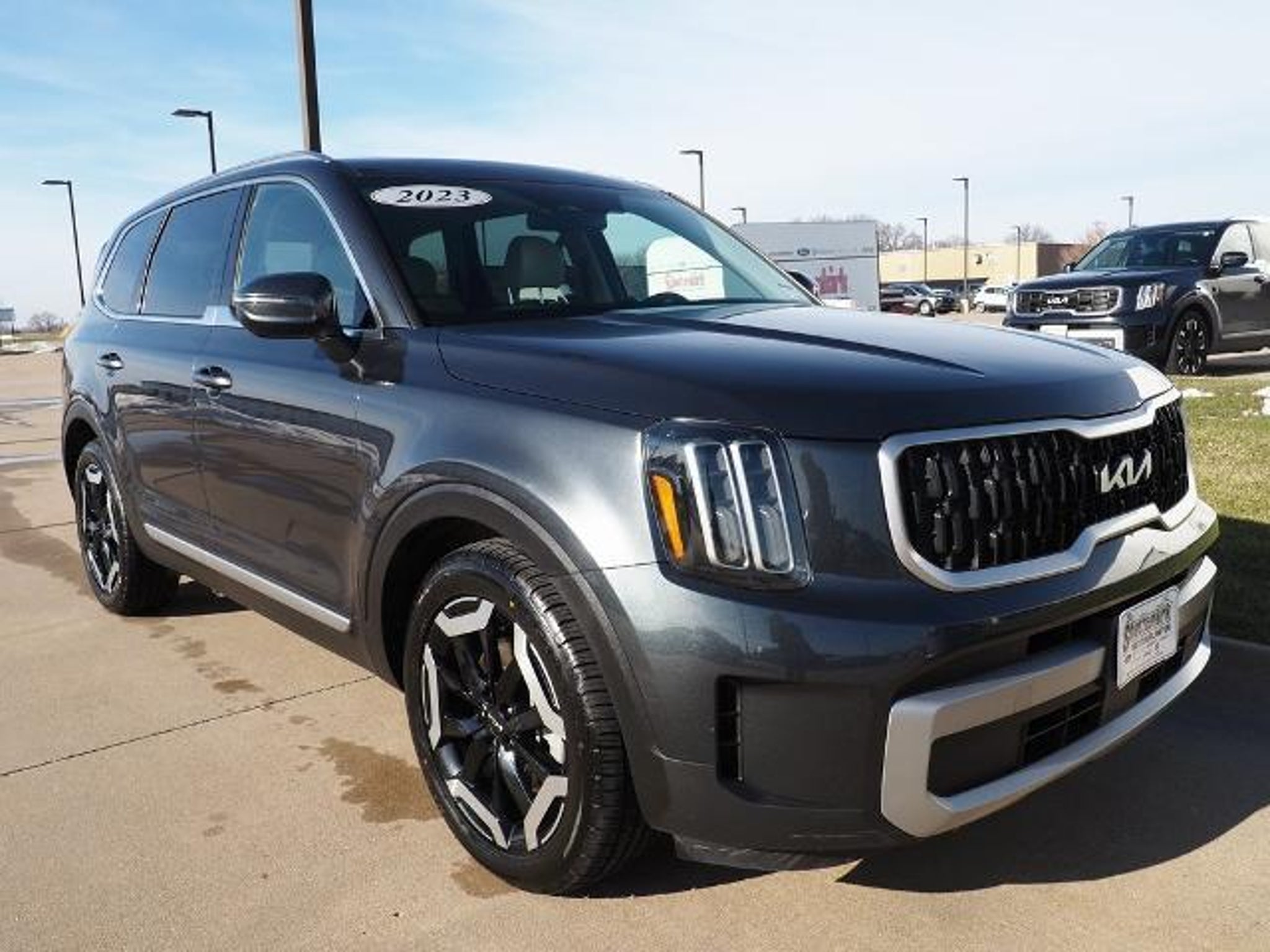 CARFAX One-Owner. Clean CARFAX. 2023 Kia Telluride EX Gravity Gray 4D Sport Utility 3.8L V6 DGI DOHC Dual CVVT 8-Speed Automatic AWD EX This vehicle comes well equipped with 3.648 Axle Ratio, 3rd row seats: split-bench, 4-Wheel Disc Brakes, 6 Speakers, ABS brakes, Air Conditioning, Alloy wheels, AM/FM radio: SiriusXM, Apple CarPlay & Android Auto, Auto High-beam Headlights, Auto-dimming Rear-View mirror, Automatic temperature control, Brake assist, Bumpers: body-color, Carpet Floor Mats, Compass, Delay-off headlights, Driver door bin, Driver vanity mirror, Dual front impact airbags, Dual front side impact airbags, Electronic Stability Control, Emergency communication system: 911 Connect, Exterior Parking Camera Rear, Four wheel independent suspension, Front anti-roll bar, Front Bucket Seats, Front Center Armrest, Front dual zone A/C, Front reading lights, Fully automatic headlights, Heated & Ventilated Front Bucket Seats, Heated door mirrors, Heated front seats, Heated steering wheel, Illuminated entry, Knee airbag, Leather Seat Trim, Leather Shift Knob, Leather steering wheel, Low tire pressure warning, Navigation System, Occupant sensing airbag, Outside temperature display, Overhead airbag, Overhead console, Panic alarm, Passenger door bin, Passenger vanity mirror, Power door mirrors, Power driver seat, Power Liftgate, Power moonroof, Power passenger seat, Power steering, Power windows, Radio data system, Radio: AM/FM Display Audio System, Rear air conditioning, Rear anti-roll bar, Rear audio controls, Rear reading lights, Rear seat center armrest, Rear side impact airbag, Rear window defroster, Rear window wiper, Reclining 3rd row seat, Remote keyless entry, Roof rack: rails only, Security system, Smart Key w/ Push Button and Remote Start, Speed control, Speed-sensing steering, Split folding rear seat, Spoiler, Steering wheel mounted audio controls, Tachometer, Telescoping steering wheel, Tilt steering wheel, Traction control, Trip computer, Turn signal indicator mirrors, Variably intermittent wipers, Ventilated front seats, and Wheels: 20 x 7.5 Black Finish. 6 Months / 6,000 mile Powertrain and Air Conditioning Coverage, DENT REPAIR, WINDSHIELD REPAIR, TIRE AND WHEEL REPAIR AND PAINT PROTECTION AND NITROGEN IN YOUR TIRES all for $895.00. See salesperson for details. Powertrain coverage starts on date of purchase, Shottenkirk West Burlington services drivers in Burlington, West Burlington, Mt. Pleasant, Fort Madison, Wever, Middletown, New London, Danville, Mediapolis, Wapello, Columbus Junction, Mu