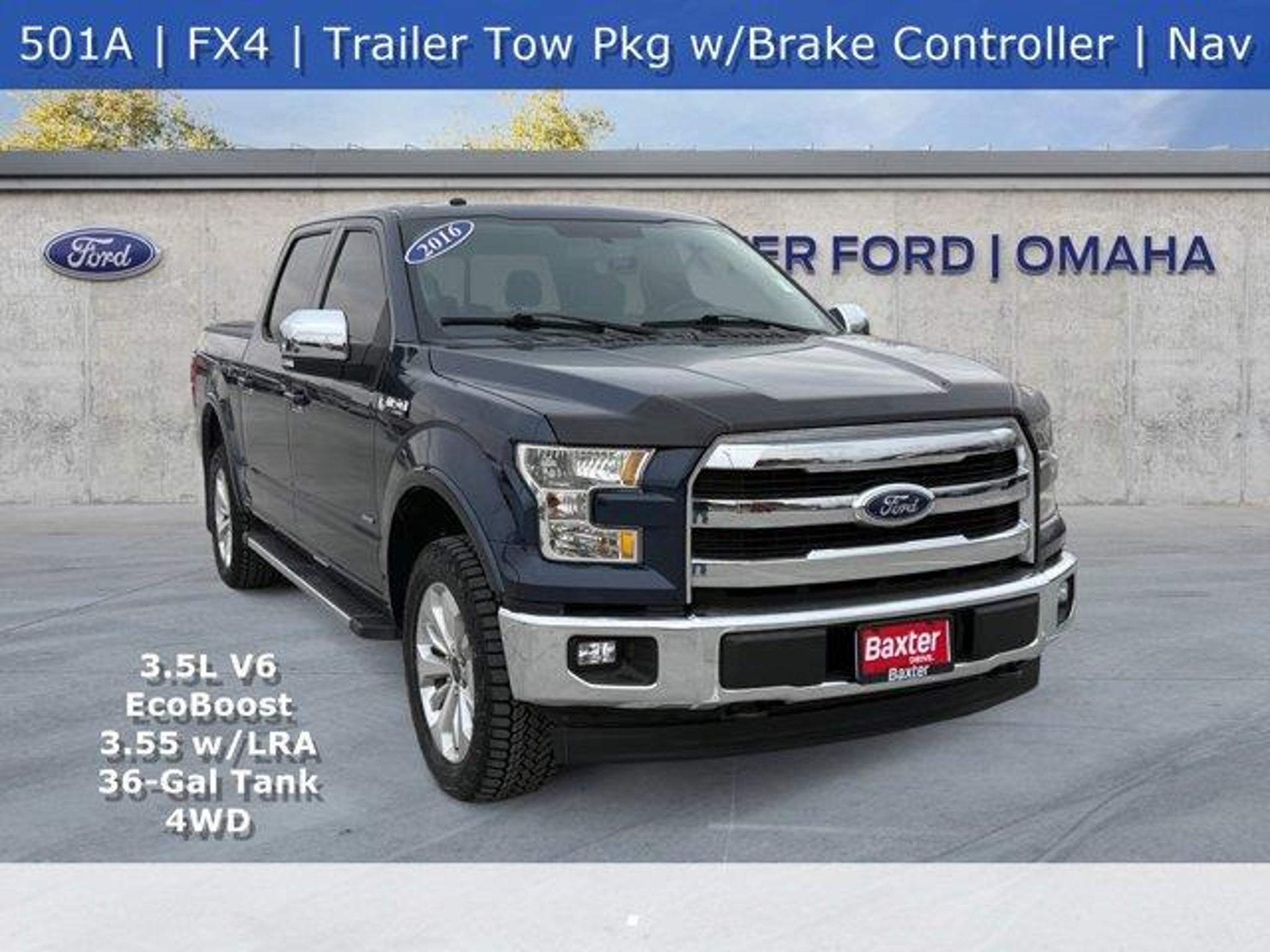 *Why BUY from Baxter Ford West Dodge?*When you choose this *Blue Jeans Metallic 2016 Ford F-150 Lariat* with *67,009* miles, you are not just buying a used vehicle - you are investing in quality, reliability and peace of mind. Our clientele depend on us for *Transparent Pricing, Convenience* and, most importantly, *Customer FIRST Service! No Doc Fees. No Add-Ons. No Surprises!*As a Baxter Certified vehicle, it has passed our rigorous 130-point inspection and includes a LIMITED COMPREHENSIVE WARRANTY, 7-day return policy, and available delivery for your convenience all with NO DOC FEES, NO HANDOFFS, NO HASSLES, AND NO SURPRISES.*What this vehicle includes:*=== Chrome Angular Running Boards ($695 value) ====== Comfort === * Ventilated front seats -That's cool. Ventilated front seats provides targeted cool air so you and your passenger can get comfortable quicker in hot weather. Getting comfortable is no sweat when you have ventilated front seats.=== Convenience === * Cruise control with steering wheel mounted controls. Set it and forget it. Road trips used to be stressful, until cruise control set the pace. Simply set the desired speed using the steering wheel mounted controls and it will maintain that speed without driver intervention. This can help minimize driver fatigue and improve overall fuel economy. Resting your right foot is right at your fingertips thanks to cruise control with steering wheel mounted controls.=== Safety and Security === * Rear camera - Watching your back! The rear camera helps you see obstacles and hazards you otherwise couldn't by showing enhanced images of what is behind you. The rear camera is an extra set of eyes that's both convenient and safe. * Brake assist - Stop right there. Something jumps out into the middle of the road and you need to stop now! With brake assist, you will. It uses the speed of the brake pedal's travel to sense panic braking, then applies all available power to boost your stopping power. Brake assist can stop the accident before it is one.=== Technology and Telematics === * Mobile hotspot - WiFi on the fly. Connect your devices to the Internet through your vehicle's private mobile hotspot and take the internet wherever your journey takes you, without eating up your data allowance. Find the hotspot with mobile hotspot.ENGINE: 3.5L V6 ECOBOOST, BLUE JEANS METALLICCome on in to *Baxter Ford West Dodge* today at *18505 California Street Omaha NE 68022* or call *877-460-1780* to schedule a test drive!