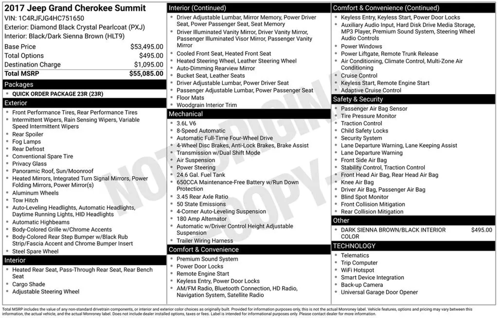 4X4 FOUR WHEEL DRIVE, BLUETOOTH, SIRIUS XM SATELLITE RADIO, UCONNECT, NAVIGATION SYSTEM GPS NAV, TOUCH SCREEN CONTROLS, BACKUP CAMERA, HOMELINK UNIVERSAL GARAGE DOOR OPENER, KEYLESS PUSH BUTTON START, AUTOMATIC HEADLIGHTS, POWER DRIVER SEAT, POWER PASSENGER SEAT, HEATED/COOLED LEATHER SEATS, HEATED REAR LEATHER SEATS, PANORAMIC SUNROOF/MOONROOF, MEMORY PACKAGE / MEMORY SEAT, TOW PACKAGE / TRAILER PACKAGE, HARMAN/KARDON HIGH END SOUND PACKAGE / 19 SPEAKERS, SUMMIT SERIES, QUICK ORDER PACKAGE 23R, 20 FULLY POLISHED ALUMINUM WHEELS, AIR CONDITIONING, ANTI-WHIPLASH FRONT HEAD RESTRAINTS, AUTO-DIMMING DOOR MIRRORS, AUTO-DIMMING REAR-VIEW MIRROR, AUTO-LEVELING SUSPENSION, AUTOMATIC TEMPERATURE CONTROL, BRAKE ASSIST, COMPASS, DRIVER VANITY MIRROR, EMERGENCY COMMUNICATION SYSTEM: UCONNECT ACCESS, ENGINE OIL COOLER, FRONT DUAL ZONE A/C, FRONT FOG LIGHTS, HEADLIGHT CLEANING, HEATED DOOR MIRRORS, LEATHER SHIFT KNOB, LEATHER STEERING WHEEL, LOW TIRE PRESSURE WARNING, NORMAL DUTY SUSPENSION, OCCUPANT SENSING AIRBAG, OUTSIDE TEMPERATURE DISPLAY, OVERHEAD CONSOLE, PANIC ALARM, PASSENGER VANITY MIRROR, POWER DOOR MIRRORS, POWER STEERING, POWER WINDOWS, RADIO DATA SYSTEM, RAIN SENSING WIPERS, REAR WINDOW DEFROSTER, REAR WINDOW WIPER, REMOTE KEYLESS ENTRY, SPEED-SENSITIVE WIPERS, TELESCOPING STEERING WHEEL, TILT STEERING WHEEL, TURN SIGNAL INDICATOR MIRRORS, VARIABLY INTERMITTENT WIPERS.