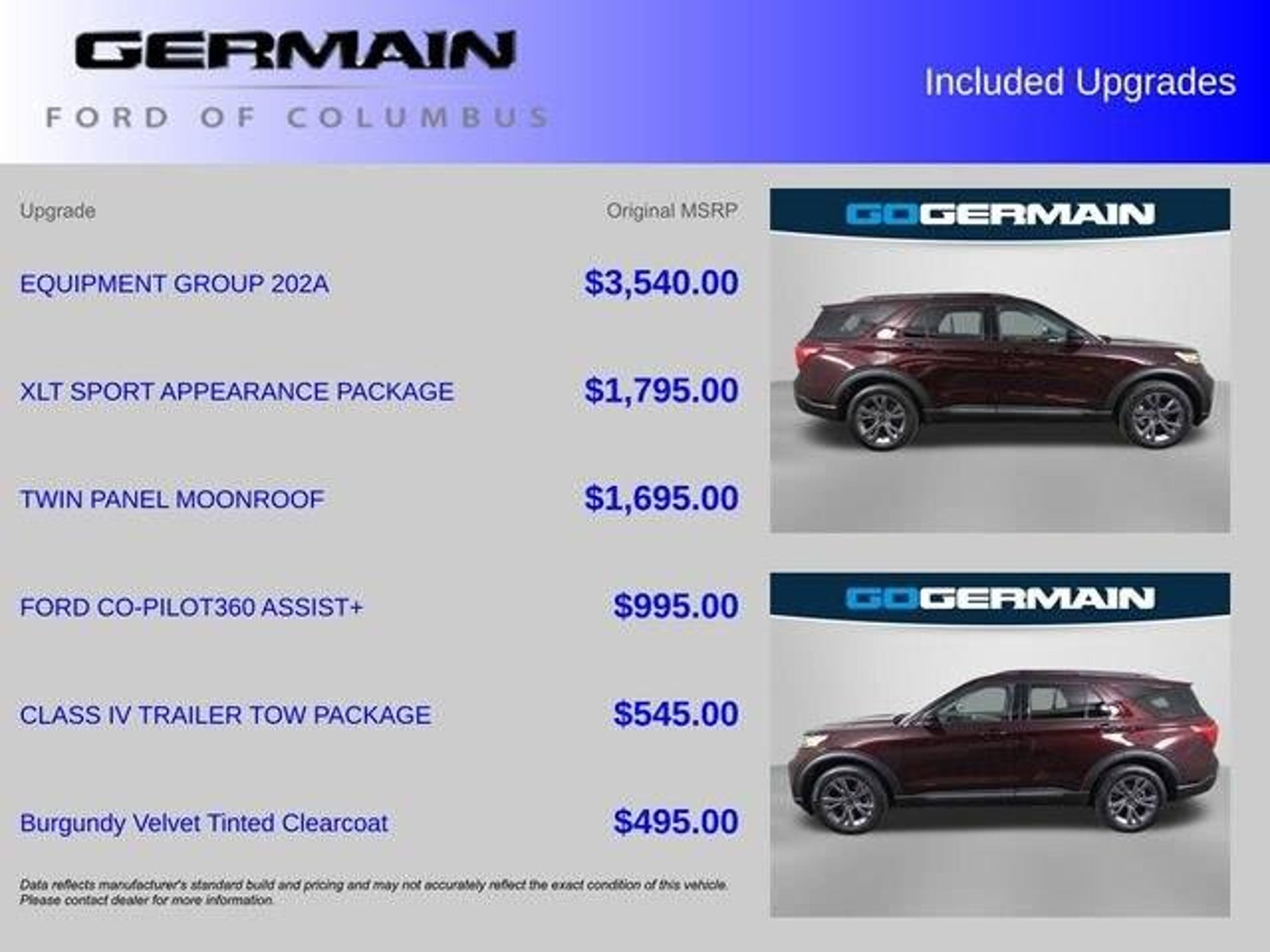 Burgundy Velvet Tinted Clearcoat 4WD 10-Speed Automatic 2.3L EcoBoost I-4. Class IV Trailer Tow Package, Evasive Steering Assist, Ford Co-Pilot360 Assist, Intelligent Adaptive Cruise Control, Navigation System, Speed Sign Recognition, Twin Panel Moonroof, Voice-Activated Touchscreen Navigation System, Wheels: 20 10-Spoke Carbonized Gray-Painted, XLT Sport Appearance Package. CARFAX One-Owner. Clean CARFAX.WE HAVE INCLUDED 30 PHOTO'S OF OUR VEHICLES. PLEASE VISIT WWW.GERMAINFORD.COM. Recent Arrival! Odometer is 3266 miles below market average! 20/27 City/Highway MPGCertified. Ford Gold Certified Details:* Warranty Deductible: $100* Transferable Warranty* Limited Warranty: 12 Month/12,000 Mile (whichever comes first) after new car warranty expires or from certified purchase date* 172 Point Inspection* and 22,000 FordPass Rewards Points to use toward first two maintenance visits* Vehicle History* Roadside Assistance* Powertrain Limited Warranty: 84 Month/100,000 Mile (whichever comes first) from original in-service dateWhat is Live Market Pricing? Simple. Live Market Pricing provides the most competitive prices on all our pre-owned vehicles, all the time. Pre-owned Live Market Pricing is achieved by polling over 40,000 pre-owned websites every hour to ensure that every single customer receives real-time Value Pricing on every single Pre-Owned Vehicle we sell. We don't play the pricing games. See for yourself how we measure up to the competitors by. 2022 Ford Explorer XLT