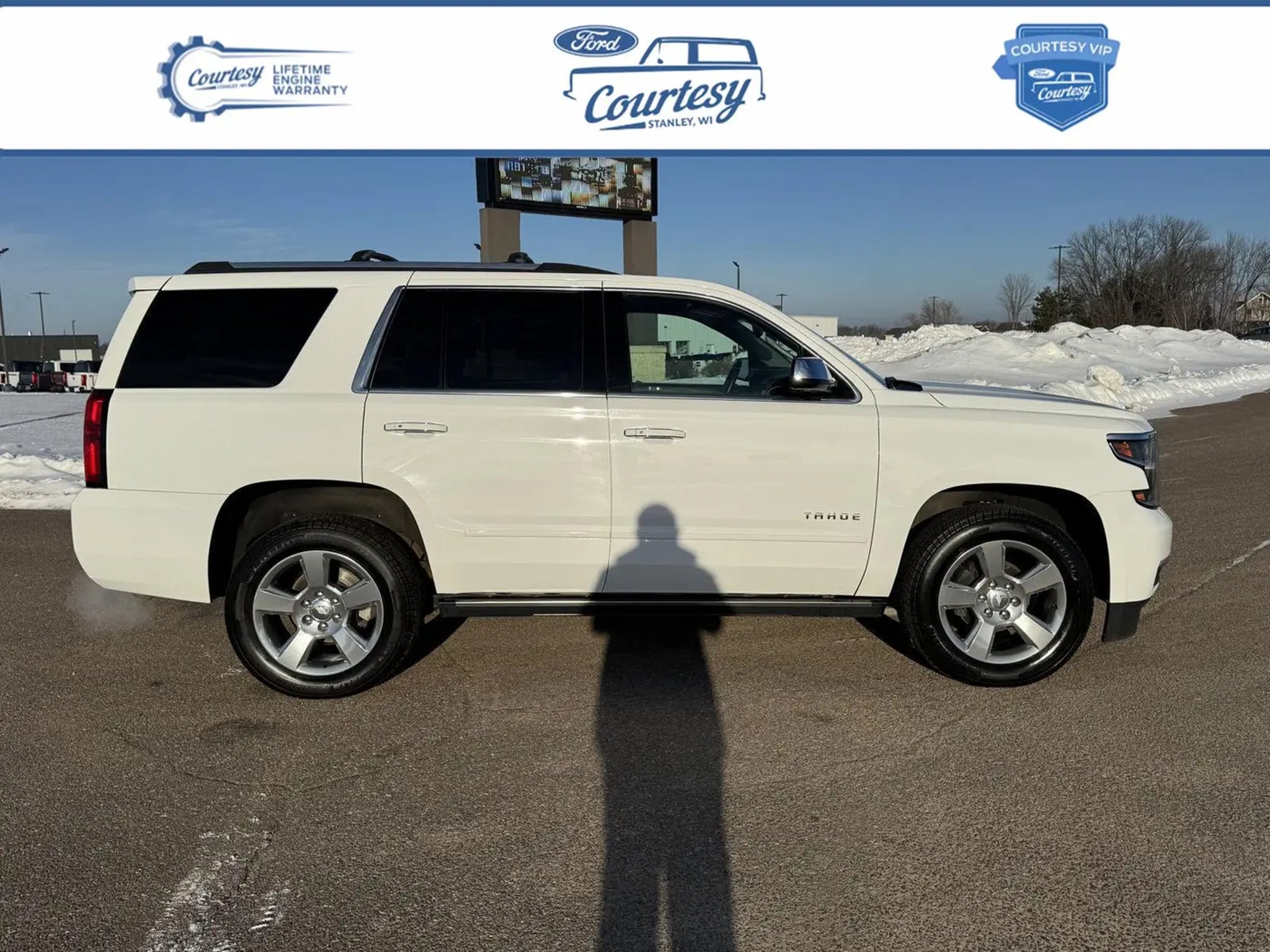 2020 Chevrolet Tahoe Premier Summit White is Certified, and we would love the opportunity to speak more about the advantages of our certification. Please reference 15082T and call us at .New Battery, New Wipers and Rear Brake Job. Why Buy From Courtesy Auto & Truck Center, Inc. VIP Pricing representspremium quality of service tothe customer. With all premium,economy, and utility brands thecustomer has a guarantee theycan lean on."¢ Custom vehicle ordering and delivery"¢ Service pick-up and drop-off"¢ Mobile service vehicle"¢ Courtesy vehicle or shuttle"¢ Rewards program for service New Vehicles (under factory warranty)Lifetime Engine Limited Warranty. 1-Year Zurich Shield Limited Warranty. Courtesy Certified (under 85,000 miles)Lifetime Engine Limited Warranty 1-Year Zurich Shield Limited Warranty Courtesy Certified (85,001-100,000 miles)6-Month/6,000 Mile Limited Warranty 1-Year Zurich Shield Limited Warranty *Some exclusions apply. See dealer for details. *Some exclusions apply.This Limited Warranty does not provide coverage if your vehicle:A. Is equipped to plow snow, whether or not the plow blade is attached to your vehicle.B. Is used for commercial hauling, delivery, or limousine service.C. Is used for hauling or towing in excess of the manufacturer's limitations and specifications.D. Is used for rental, racing, speed contest or other competiton, police car, security vehicle, emergency vehicle, shuttle service, taxi or commercial towing.E. Has been declared a total loss or has been inssued a salvaged or branded title. *needs to be less that 15 years old and under 85k miles. All internally lubricated parts contained within the engine block and cylinder head(s). Cylinder head, engine block. and rotor housings when damaged as a result of the failure of a covered internally lubricated part. Coolant, fluids, lubricants, and filters when required in connection with the repair and replacement of a covered part. Important Package Information Sun, Entertainment and Destinations Package ($2,435 value) Power Sunroof Chevrolet Infotainment AM/FM Stereo with Navigation Rear Seat Blu-Ray/DVD Entertainment System Max Trailering Package ($500 value) 3.42 Rear Axle Ratio Integrated Trailer Brake Controller 2-Speed Electronic Autotrac Active Transfer Case Preferred Equipment Group 1LZ Memory Settings Front Passenger 6-Way Power Seat Adjuster Front Heated Reclining Bucket Seats Cargo Net 3rd Row 60/40 Power Fold Split-Bench Passive Entry System Power Release 2nd Row Bucket Seats Driver Inboard and Front Passenger Airbags Color-Keyed Carpeting Floor Covering 1st and 2nd Row Color-Keyed Carpeted Floor Mats Push Button Keyless Start Remote Vehicle Start Black Assist Steps with Chrome Accent Strip 7,300 lbs (3,311 Kgs) GVWR Floor Console Auto-Dimming Inside Rearview Mirror Power-Folding Heated Outside Mirrors Chevrolet Infotainment AM/FM Stereo with Navigation 4-Wheel Antilock Disc Brakes with Brake Assist Power-Adjustable Accelerator and Brake Pedals Electronic Cruise Control with Set and Resume Speed Wireless Charging Heated 2nd Row Outboard Seats Heated and Ventilated Driver and Front Passenger Seats Power Tilt and Telescopic Steering Column SiriusXM NavTraffic Single-Speed Elec Autotrac Active Transfer Case 5 12-Volt Auxiliary Power Outlets P275/55R20 AS BW Tires 20 X 9 Polished-Aluminum Wheels Perforated Leather-Appointed Seat Trim Fog Lamps Hands Free Power Liftgate SiriusXM Radio Front and Rear Park Assist Rear Cross Traffic Alert Universal Home Remote Lane Change Alert with Side Blind Zone Alert Bose Centerpoint Premium 10-Speaker Surround Sound Heated Leather Wrapped Steering Wheel Roof-Mounted Luggage Rack Side Rails Enhanced Driver Alert Package Magnetic Ride Control Suspension Package Enhanced Driver Information Center ($850 value) Head-Up Display Body Security Content Theft Protection Package ($410 value) Theft-Deterrent Alarm System Vehicle Inclination Sensor Vehicle Interior Movement Sensor Safety and Security The vehicle is equipped with a system that senses, and then prepares, the vehicle and/or occupants, for an impending forward collision. The vehicle is equipped with a camera that displays an image of the area behind the vehicle on an interior display. An active lane departure system alerts the driver of unintended movement of the vehicle out of a designated traffic lane and automatically maintains the vehicle's position within that lane. Technology and Telematics Without the need for a manufacturer specific app to be installed on the smart device, the vehicle infotainment system can access and control functions of a smart device physically plugged-into the vehicle. Mobile devices can wirelessly connect to the internet through the vehicle's private mobile network. Our Dealership We look forward to doing business with you! Give us a call at and schedule a test drive. We are located at 409 Junction Avenue Stanley, WI 54768.