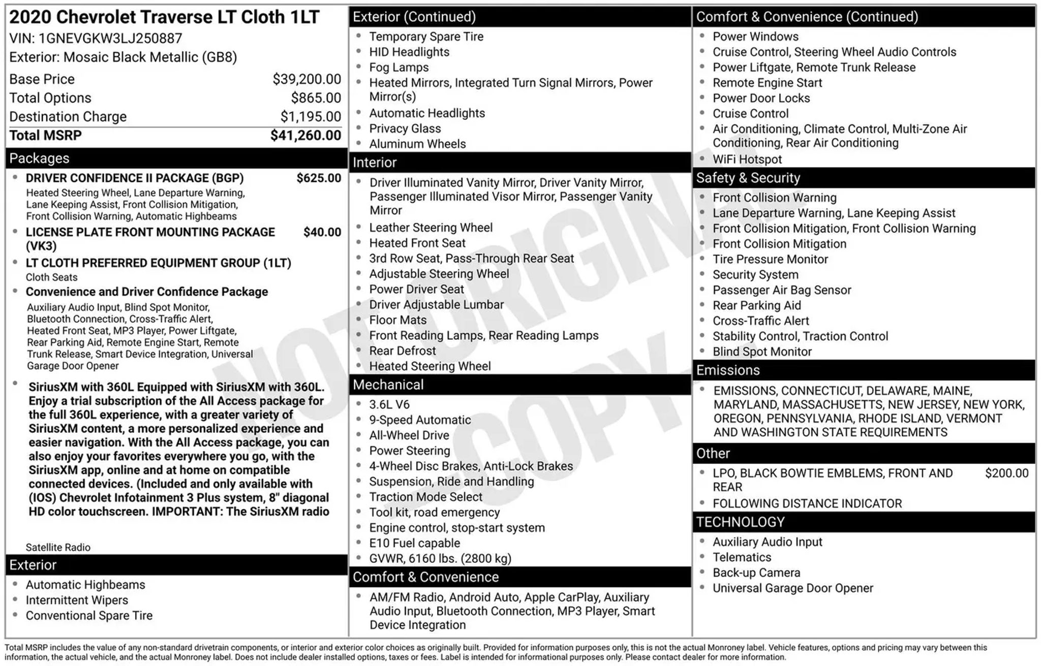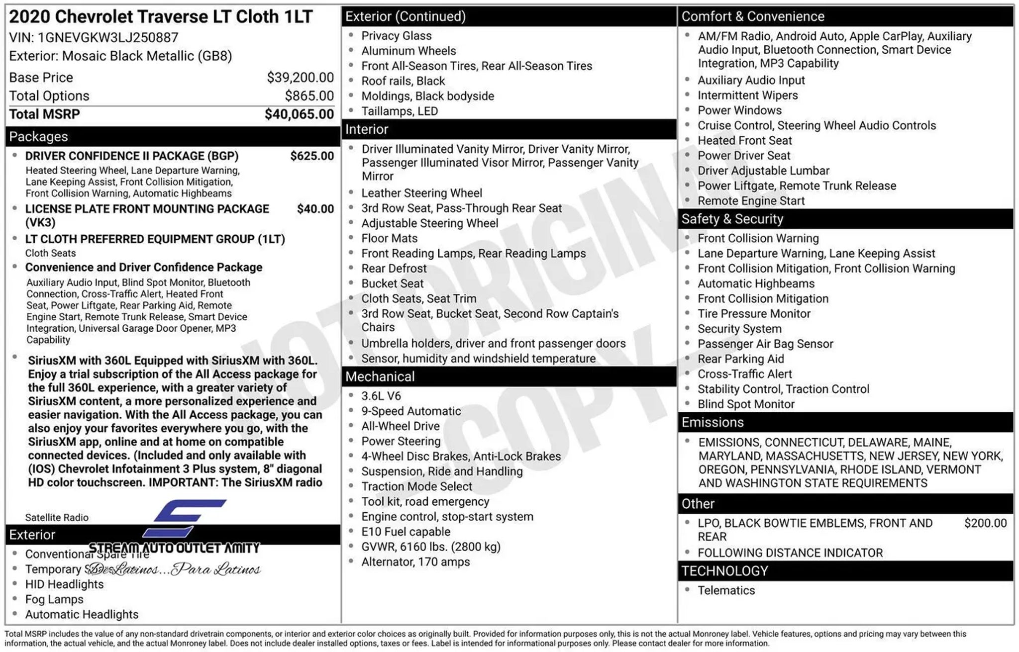 2020 Chevrolet Traverse Mosaic Black Metallic AWD, ABS brakes, AM/FM radio: SiriusXM, Apple CarPlay/Android Auto, Automatic Emergency Braking, Automatic Heated Steering Wheel, Brake assist, Driver Confidence II Package, Electronic Stability Control, Following Distance Indicator, Forward Collision Alert, Front License Plate Bracket Mounting Package, Front Pedestrian Braking, IntelliBeam Auto High Beam Control Headlamps, Lane Keep Assist w/Lane Departure Warning, Power driver seat, Power Liftgate, Preferred Equipment Group 1LT, Remote keyless entry, Wheels: 18 Bright Silver Painted Aluminum. Priced below KBB Fair Purchase Price! Odometer is 17005 miles below market average! Welcome, future Rockstars! Introducing Stream Auto Outlet, the #1 car dealership on Google. Whatever your luxury car needs, we aim to be the solution to your automotive equation. Don't hesitate to contact us online, by phone, or"”better yet"”in person with any questions or inquiries to get you in the driver's seat.