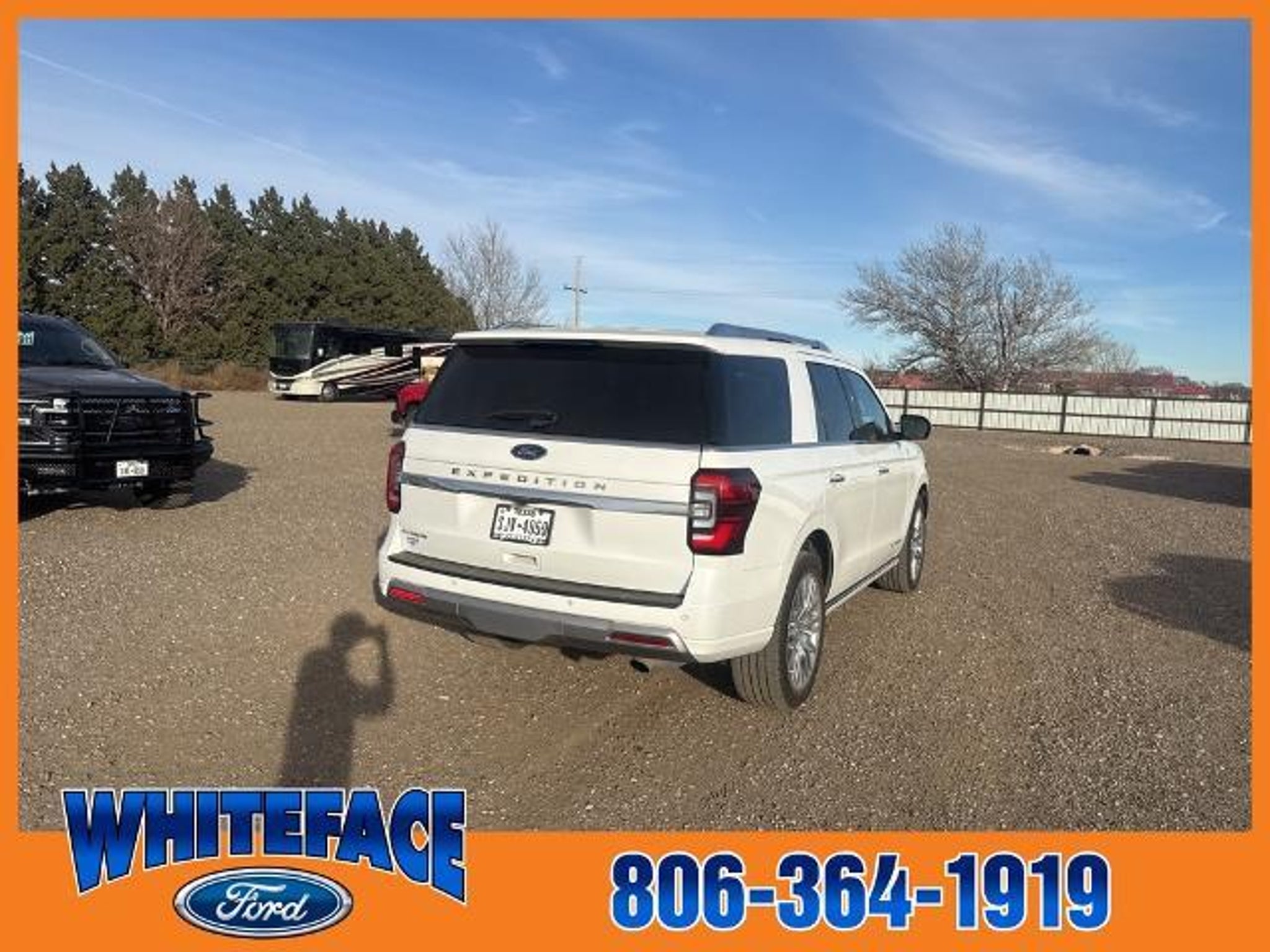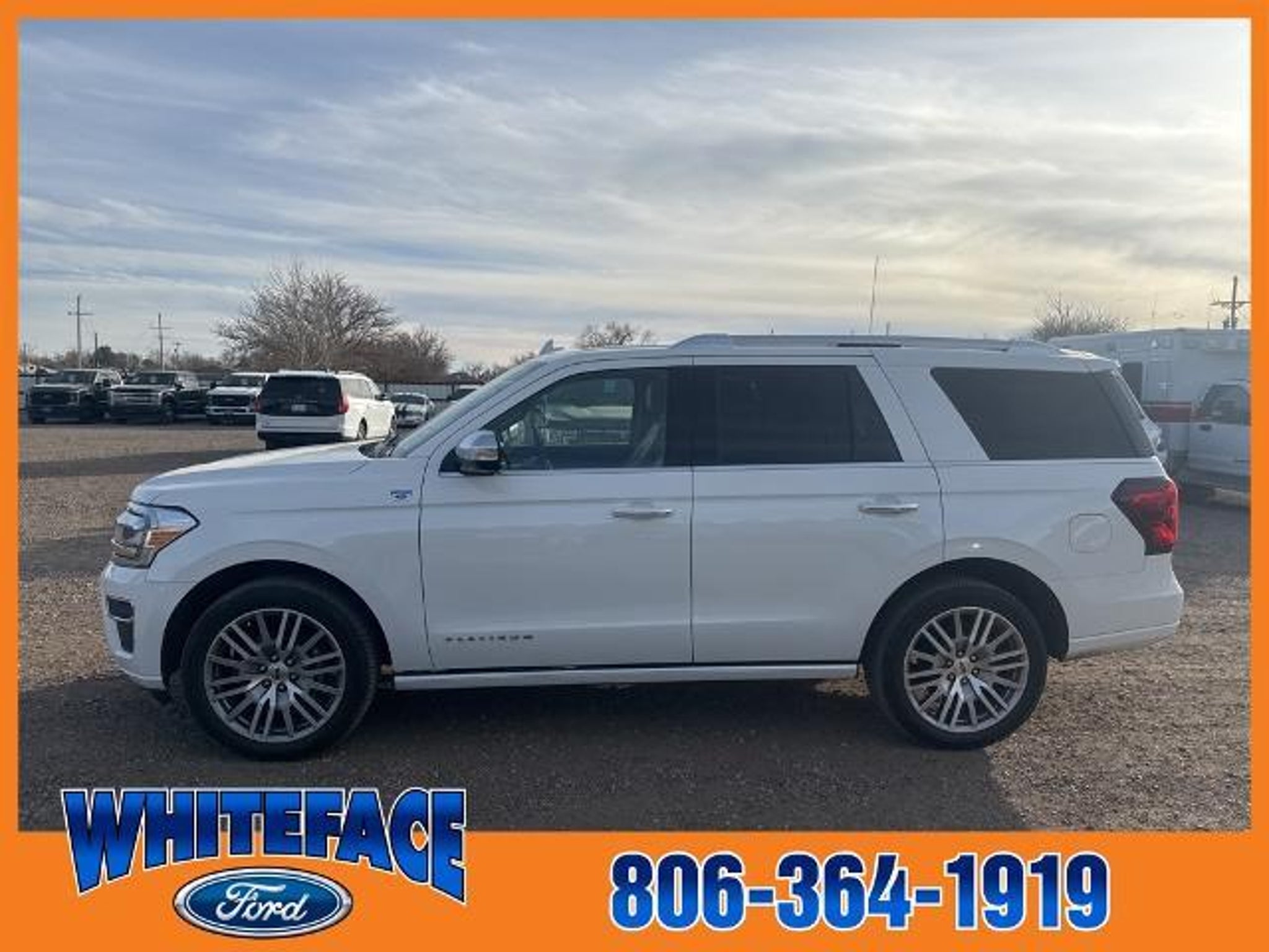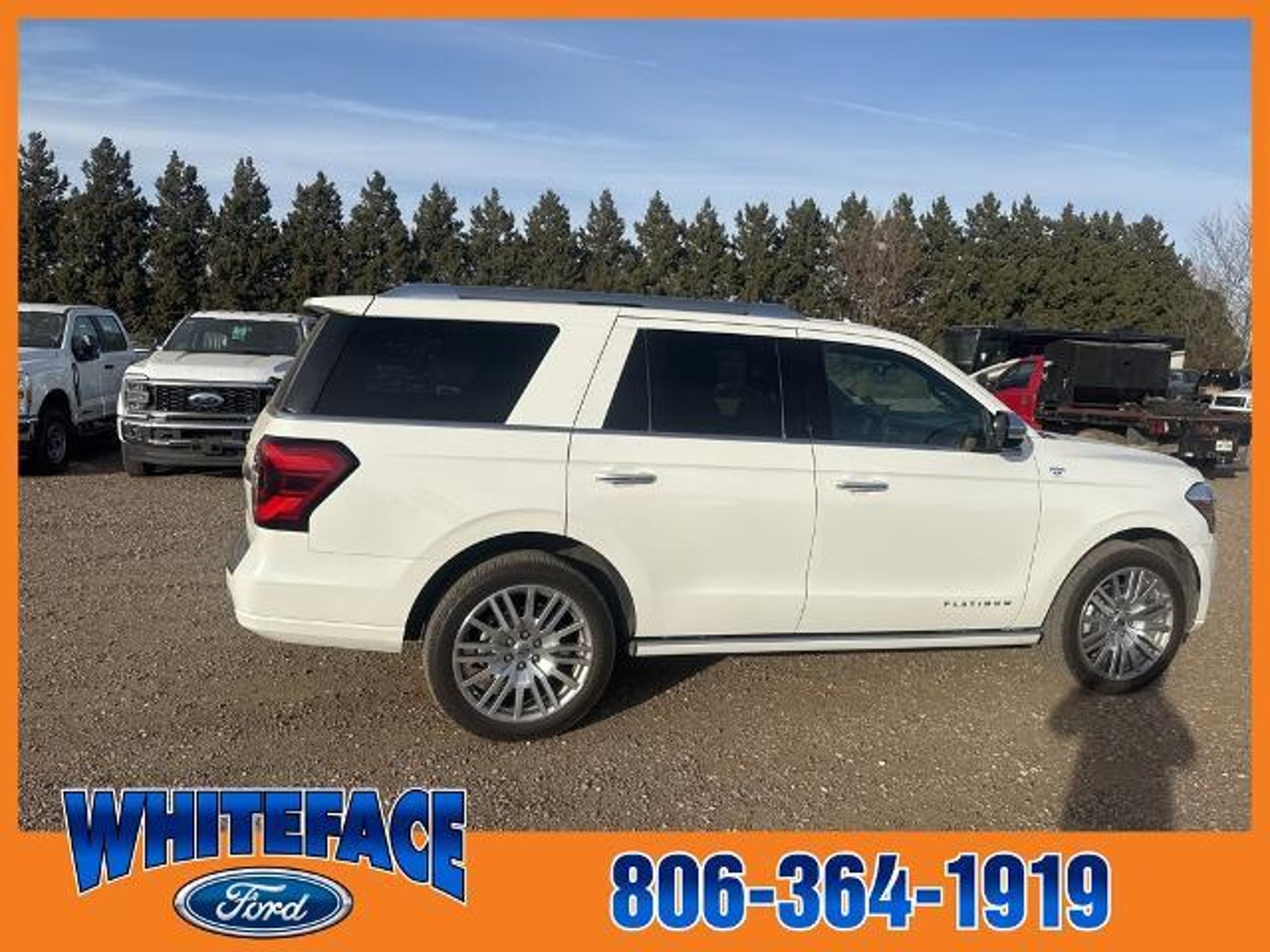 Welcome to Whiteface Ford in Hereford, TX, just minutes southwest of Amarillo, TX. Whiteface Ford, your Texas panhandle's Dealer For The People, has this 2023 Ford Expedition equipped with the following options. : 2023 Ford Expedition Platinum Platinum The most unique features on this Expedition are, 4WD, Additionally this Expedition is equipped with, 4WD, 22 Speakers, 3rd row seats: split-bench, 4-Wheel Disc Brakes, ABS brakes, Active Park Assist 2.0 Removal, Adaptive suspension, Adjustable pedals, Air Conditioning, Alloy wheels, AM/FM radio: SiriusXM with 360L, Auto High-beam Headlights, Auto-dimming door mirrors, Auto-dimming Rear-View mirror, Automatic temperature control, Brake assist, Bumpers: body-color, Compass, Delay-off headlights, Driver door bin, Driver vanity mirror, Dual front impact airbags, Dual front side impact airbags, Dual-Headrest Rear-Seat Entertainment System (DISC), Electronic Stability Control, Emergency communication system: SYNC 4 911 Assist, Equipment Group 600A Standard Package, Exterior Parking Camera Rear, Four wheel independent suspension, Front anti-roll bar, Front Bucket Seats, Front Center Armrest, Front dual zone A/C, Front fog lights, Front reading lights, Fully automatic headlights, Garage door transmitter, Genuine wood console insert, Genuine wood dashboard insert, Genuine wood door panel insert, Hands-Free Foot-Activated Liftgate Removal (DISC), Heated door mirrors, Heated front seats, Heated rear seats, Heated steering wheel, Htd/Ventilated Prem Lthr Front Captain's Chairs (DISC), Illuminated entry, Leather steering wheel, Low tire pressure warning, Memory seat, Navigation system: Connected Navigation, Occupant sensing airbag, Outside temperature display, Overhead airbag, Overhead console, Panic alarm, Passenger door bin, Passenger vanity mirror, Pedal memory, Power door mirrors, Power driver seat, Power Liftgate, Power moonroof, Power passenger seat, Power steering, Power windows, Radio data system, Radio: B&O Unleashed Sound System by Bang & Olufsen, Rain sensing wipers, Rear air conditioning, Rear anti-roll bar, Rear audio controls, Rear reading lights, Rear window defroster, Rear window wiper, Reclining 3rd row seat, Remote keyless entry, Second Row Power Windows Removal, Security system, SiriusXM w/360L, Speed control, Speed-sensing steering, Speed-Sensitive Wipers, Split folding rear seat, Spoiler, Steering wheel memory, Steering wheel mounted audio controls, SYNC 4 w/Enhanced Voice Recognition, Tachometer, Telescoping steering wheel, Tilt steering wheel, Tra