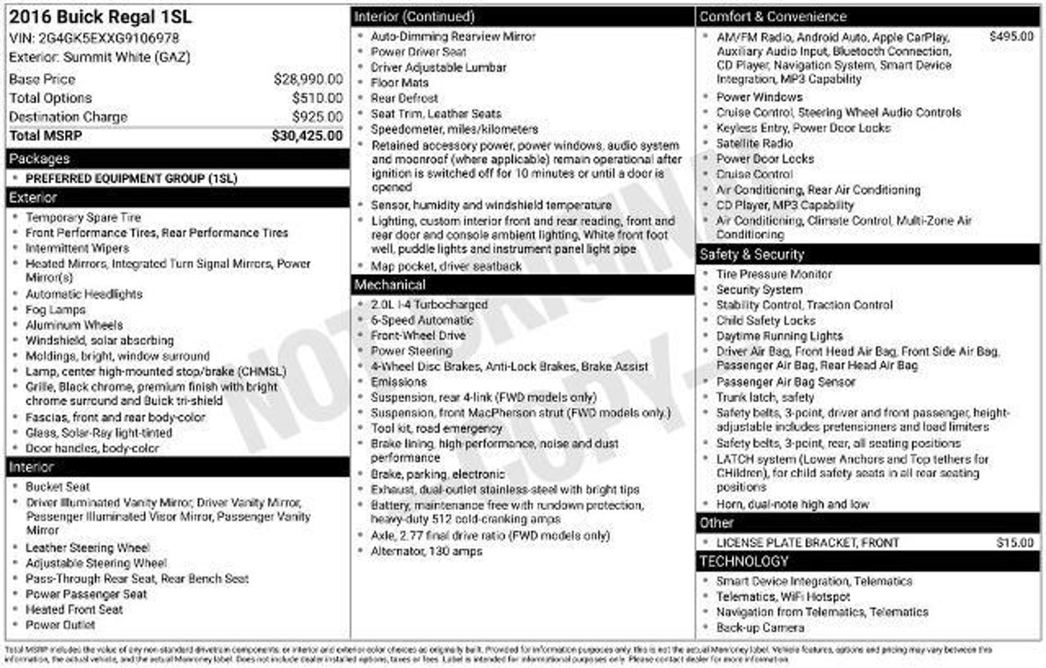 Boasting dramatic style and thrilling performance, our **2016**Buick**Regal**Sedan**Heated Leather Seats**Rear Camera** is superb in Summit White! Powered by a TurboCharged 2.0 Liter 4 Cylinder generating 259hp paired with a 6 Speed Automatic transmission to provide spirited acceleration. This Front Wheel Drive team helps you score nearly 30mpg on the highway. Dare to turn heads with our Regal that is accented with details like 18-inch silver alloy wheels. Slide behind the wheel of our Regal and check out our customizable Driver Information Center! The IntelliLink smartphone and voice command integration system includes a text message feature that reads incoming text messages aloud. Also included are available Wi-Fi hot spots, Apple CarPlayÂ, Android AutoÂ, BluetoothÂ, and available satellite radio. Just imagine yourself in supportive leather heated front seats, gripping the leather-wrapped steering wheel and taking command of the road in this phenomenal sedan! Buick offers ABS, stability control, and many airbags that provide peace of mind and keep you safe from harm. You'll also have the Onstar system to provide automatic crash notification, roadside assistance, and remote door unlock. This Regal sedan comes highly recommended, so get behind the wheel to see for yourself! Save this Page and Call for Availability. We Know You Will Enjoy Your Test Drive Towards Ownership!
