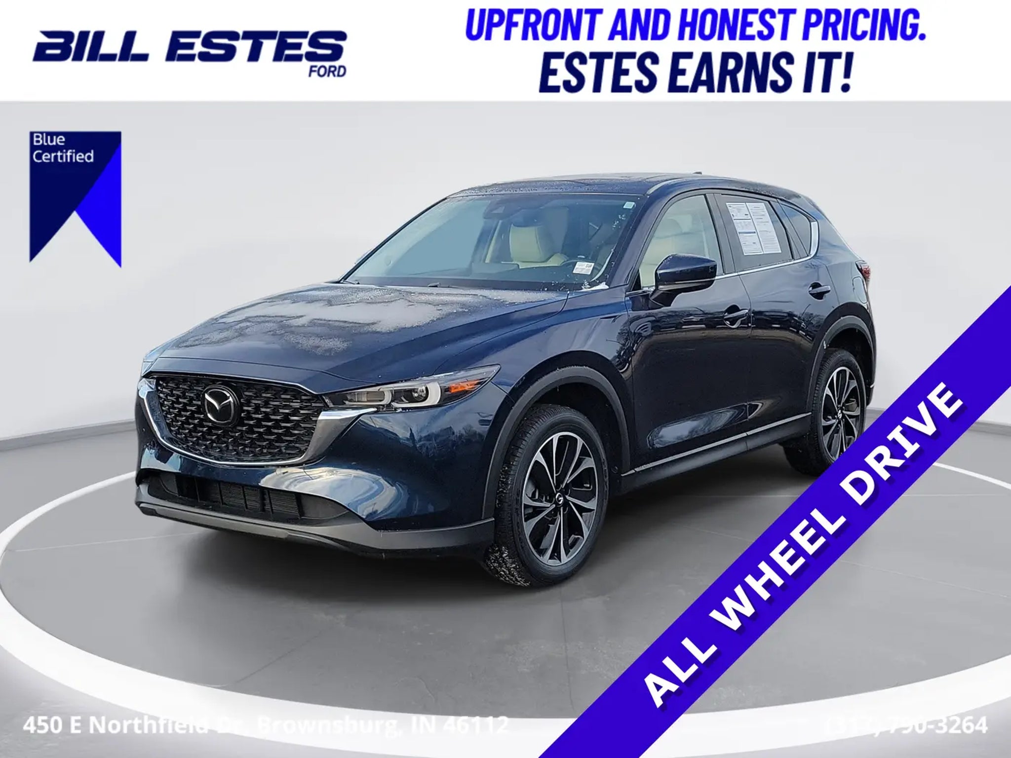 RECALL NOTICE: Some vehicles offered for sale may be subject to unrepaired manufacturer safety recalls. To determine the recall status of a vehicle, visit https:// Mazda CX-5 2.5 S Premium AWDVIN: JM3KFBDM6N0590381 Mileage: 50,267 Exterior: Deep Crystal Blue Mica Interior: Beige Leather Ford Blue CertifiedThe 2022 Mazda CX-5 2.5 S Premium delivers refined styling, engaging performance, and upscale comfort in a compact SUV thats known for its driving dynamics. Finished in Deep Crystal Blue Mica with a Beige leather interior, this CX-5 offers a premium look and feel with a well-crafted cabin and confident road manners - enhanced by Ford Blue Certification for added peace of mind.Performance & Efficiency2.5L SKYACTIV-G 4-cylinder engine6-speed SKYACTIV-Drive automatic transmissionAll-wheel drive for confident all-weather capabilityResponsive acceleration with composed, sporty handlingBalanced ride quality ideal for daily driving and longer tripsInterior & Comfort FeaturesBeige leather-trimmed seatingHeated front bucket seatsPower-adjustable drivers seatDual-zone automatic climate controlLeather-wrapped steering wheel and shift knobRefined, quiet cabin with high-quality materialsTechnology & SafetyMazda Connect infotainment systemMultifunction Commander ControlApple CarPlay and Android Auto compatibilityBluetooth hands-free calling and audio streamingHD Radio and Pandora integrationAdvanced safety features including automatic emergency notification and driver-assist technologiesFord Blue Certified BenefitsPassed a comprehensive multi-point inspection12-month/12,000-mile Comprehensive Limited Warranty7-year/100,000-mile Powertrain Limited Warranty24/7 Roadside AssistanceCARFAX Vehicle History ReportWhy This CX-5This 2022 Mazda CX-5 2.5 S Premium stands out with its elegant Deep Crystal Blue Mica paint, upscale Beige leather interior, and engaging all-wheel-drive performance. With modern technology, heated leather seating, and the added assurance of Ford Blue Certification, its an excellent choice for drivers seeking a stylish, comfortable, and reliable compact SUV with a premium feel.Certification Program Details: Ford Blue Advantage: Blue Certified* 139 Point Inspection* Transferable Warranty* Vehicle History* Warranty Deductible: $100* Roadside Assistance* Limited Warranty: 3 Month/4,000 Mile (whichever comes first) after new car warranty expires or from certified purchase date* 11,000 FordPassTM Rewards Points to use toward first maintenance visitCertified. 6 Speakers, Auto High-beam Headlights, Automatic temperature control, Delay-off headlights, Exterior Parking Camera Rear, Front dual zone A/C, Fully automatic headlights, Heated door mirrors, Heated Front Bucket Seats, Heated front seats, Leather Seat Trim, Memory seat, Power driver seat, Premium audio system: Bose, Radio Broadcast Data System Program Information, Radio: AM/FM/HD Audio System, Rear window defroster, Remote keyless entry, Speed control, Steering wheel mounted audio controls, Wheels: 19 x 7J Aluminum Alloy.