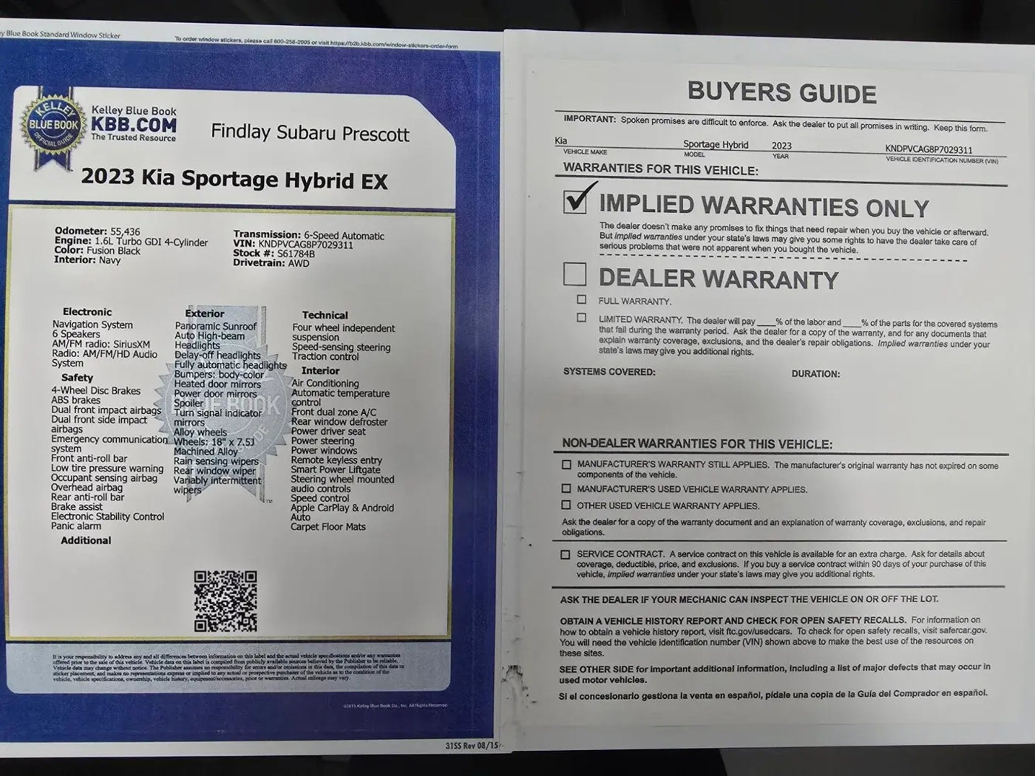 Sportage Hybrid EX, 4D Sport Utility, 1.6L Turbo GDI 4-Cylinder, 6-Speed Automatic, AWD, Fusion Black, Navy Artificial Leather.Visit with our NON-Commission team, for a hassle free experience! Save more with Findlay Subaru Prescott, with our competitive, market based pricing! This Kia Sportage Hybrid is equipped with the following features: EX Premium Package (LED Interior Lighting, Panoramic Sunroof, and Smart Power Liftgate), Sportage Hybrid EX, 4D Sport Utility, 1.6L Turbo GDI 4-Cylinder, 6-Speed Automatic, AWD, Fusion Black, Navy Artificial Leather, 4-Wheel Disc Brakes, 6 Speakers, ABS brakes, Air Conditioning, Alloy wheels, AM/FM radio: SiriusXM, Apple CarPlay & Android Auto, Auto High-beam Headlights, Automatic temperature control, Axle Ratio: 3.32, Brake assist, Bumpers: body-color, Cargo Cover, Carpet Floor Mats, Compass, Delay-off headlights, Driver door bin, Driver vanity mirror, Dual front impact airbags, Dual front side impact airbags, Dual/Hybrid w/o Audio Cargo Net, Electronic Stability Control, Emergency communication system, Four wheel independent suspension, Front anti-roll bar, Front Bucket Seats, Front Center Armrest, Front dual zone A/C, Fully automatic headlights, Heated door mirrors, Heated Front Bucket Seats, Heated front seats, Heated steering wheel, Illuminated entry, Low tire pressure warning, Navigation System, Occupant sensing airbag, Outside temperature display, Overhead airbag, Overhead console, Panic alarm, Passenger door bin, Passenger vanity mirror, Power door mirrors, Power driver seat, Power steering, Power windows, Radio: AM/FM/HD Audio System, Rain sensing wipers, Rear anti-roll bar, Rear seat center armrest, Rear window defroster, Rear window wiper, Remote keyless entry, Security system, Speed control, Speed-sensing steering, Split folding rear seat, Spoiler, Steering wheel mounted audio controls, SynTex Leatherette Seat Trim, Tachometer, Telescoping steering wheel, Tilt steering wheel, Traction control, Trip computer, Turn signal indicator mirrors, Variably intermittent wipers, and Wheels: 18 x 7.5J Machined Alloy.CARFAX One-Owner. Clean CARFAX.We use Market Based Pricing to give you the best price, upfront, without games. We do the shopping, so you get the deals!2023 Kia Sportage Hybrid EX 38/38 City/Highway MPG