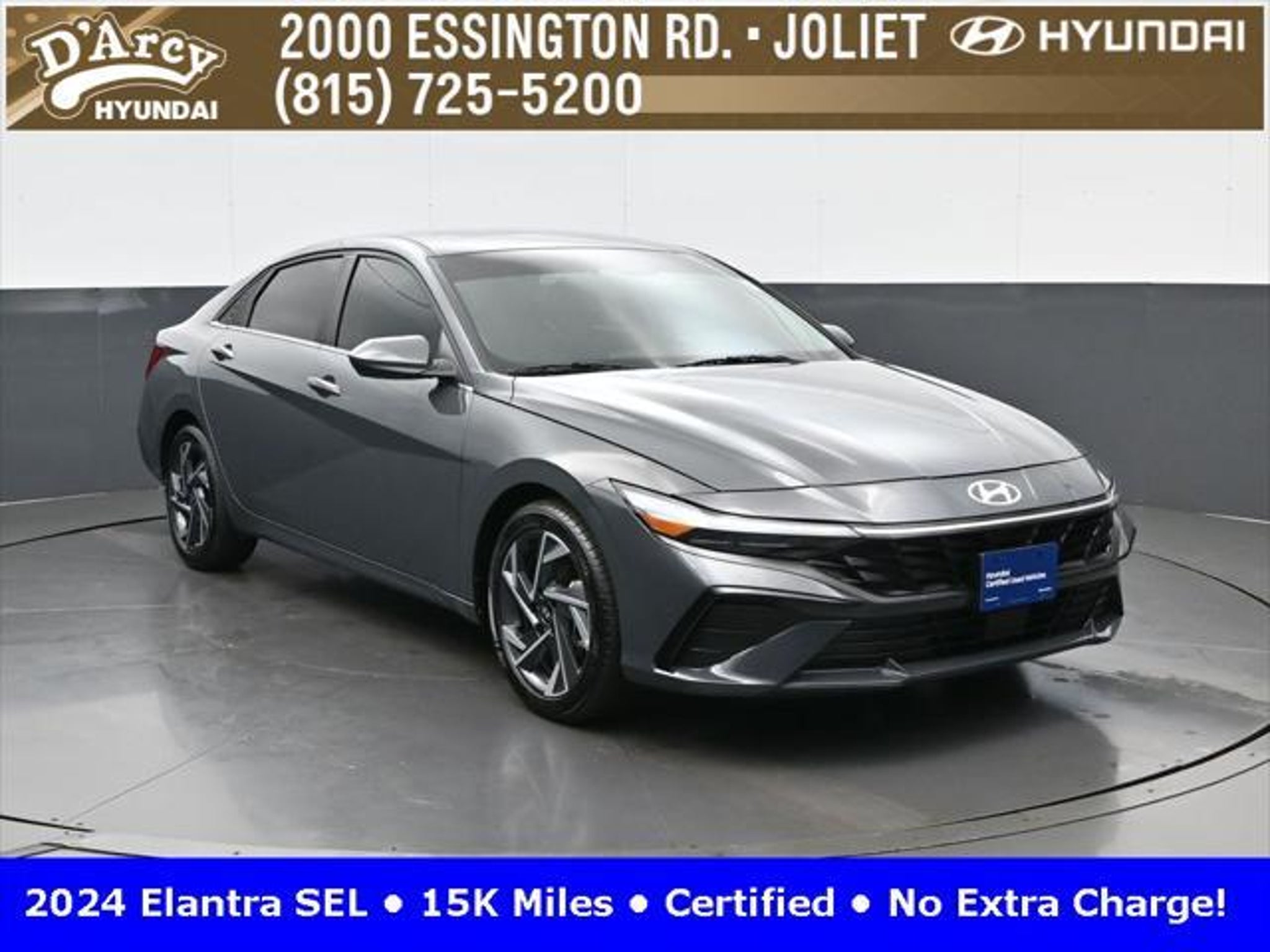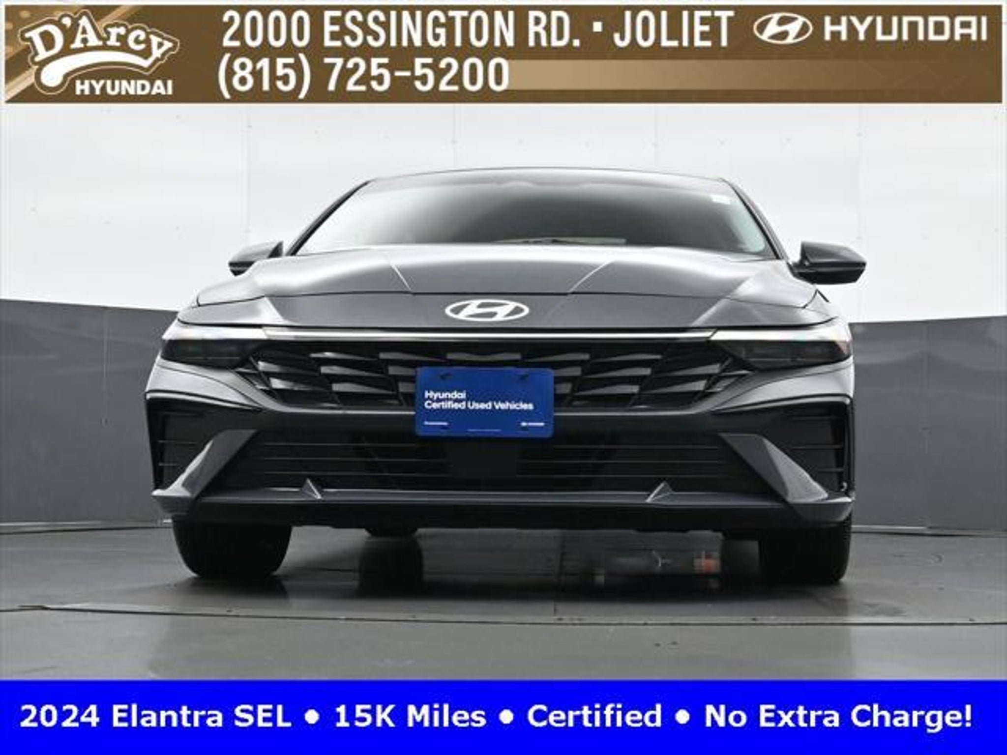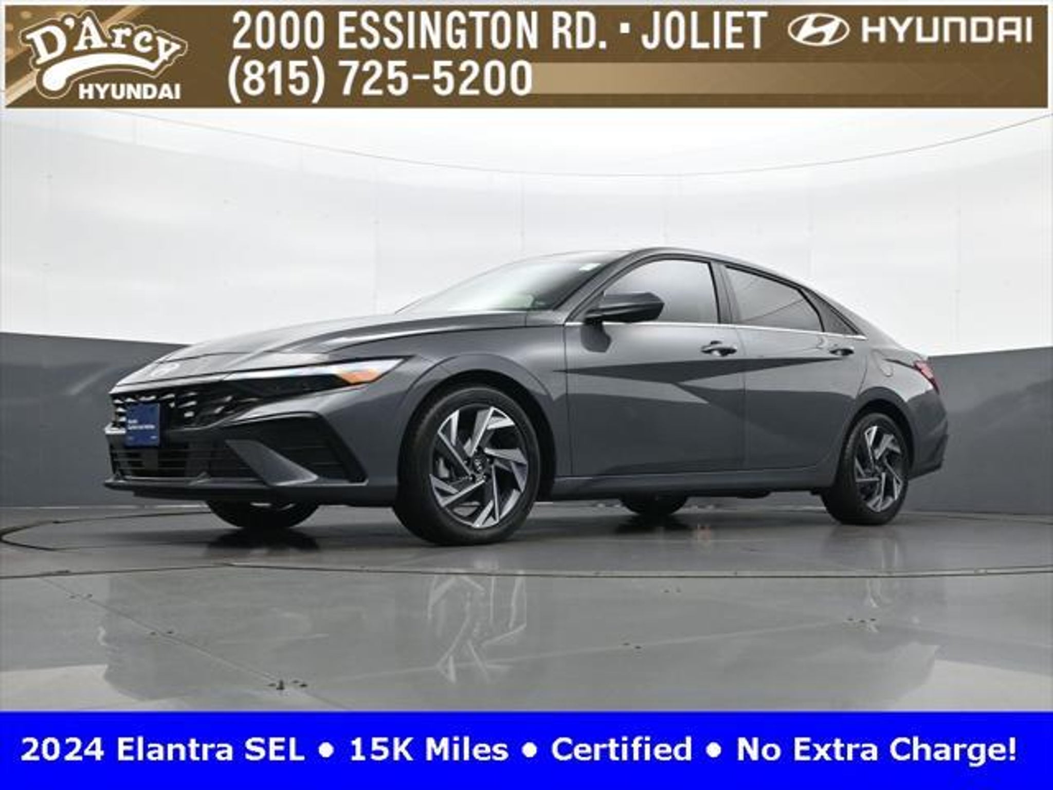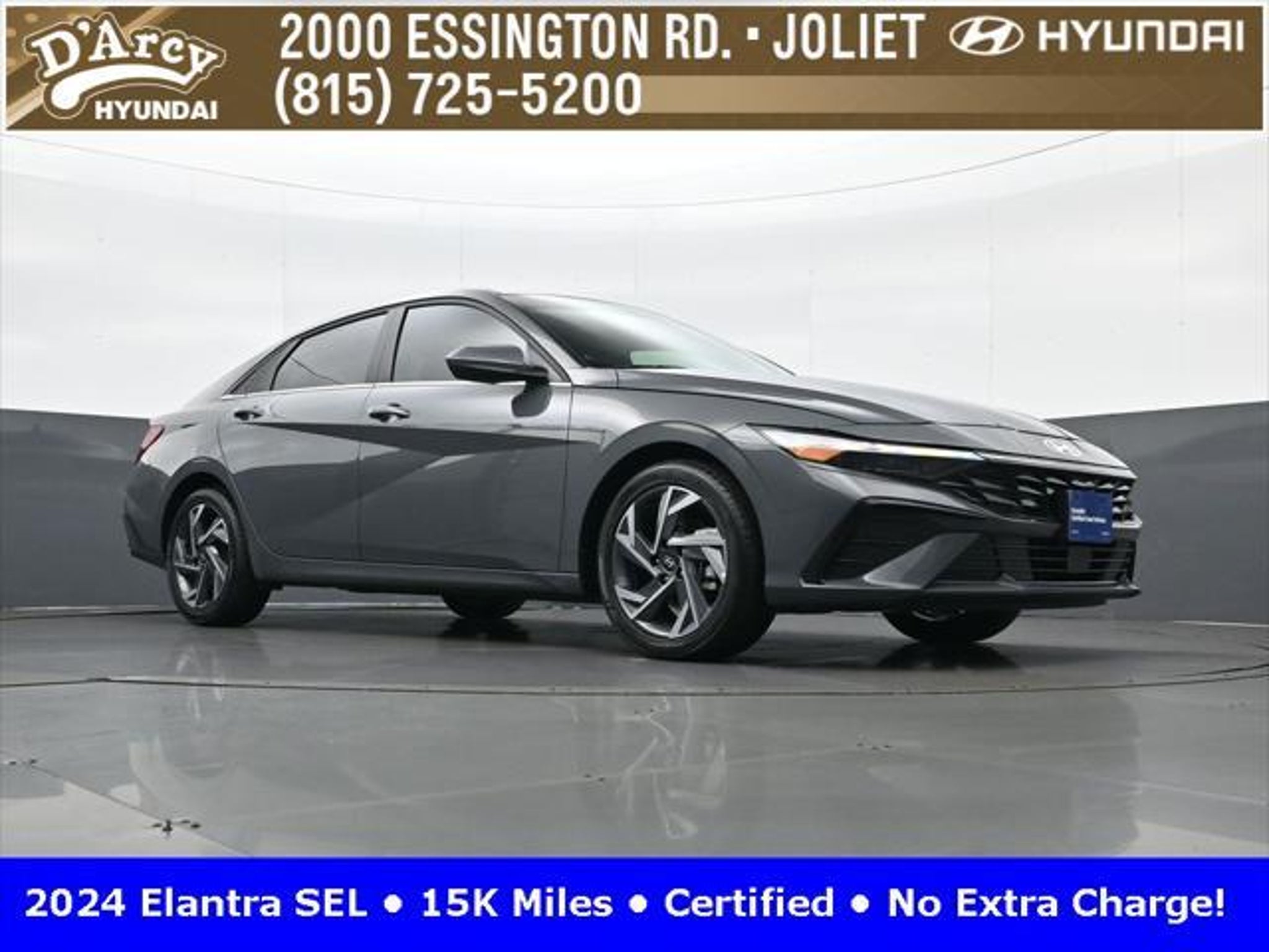 CARFAX One-Owner. ONE OWNER LOCAL TRADE!, LOW MILES!, GREAT VEHICLE HISTORY!, REMAINING FULL FACTORY WARRANTY!, SUNROOF!, BOUGHT HERE SERVICED HERE!, HYUNDAI CERTIFIED!, FULLY SERVICED AND READY TO GO!. Certified. Recent Arrival! Ecotronic Gray 2024 Hyundai Elantra SEL FWD CVT I4 Hyundai Certified Used Vehicles Details: * Warranty Deductible: $50 * Limited Warranty: 60 Month/60,000 Mile (whichever comes first) from original in-service date * Powertrain Limited Warranty: 120 Month/100,000 Mile (whichever comes first) from original in-service date * Includes 10-year/Unlimited Mileage Roadside Assistance with Rental Car and Trip Interruption Reimbursement; Please See Dealers for Specific Vehicle Eligibility Requirements. 10-Year/100,000 Mile Hybrid/EV Battery Warranty. 3-Months SiriusXM Trial Subscription. Complimentary 1 Year (Connected Care & Remote Pkgs). * Vehicle History * Roadside Assistance * 173 Point Inspection Discover the D'Arcy Difference! We care - we are here and we are ready to help! Stop by today to see up to date information, including showroom and service hours, and how to make an appointment or schedule delivery. D'Arcy Motors has been serving Joliet and its surrounding communities for over 25 years. Our business philosophy, which is to sell cars one car at a time and to make the guest the most important part of the process, has remained the same since 1991. Contact us today to experience the D'Arcy Difference! Pulse® Safer Braking Technology for $399 added to all New and CPO"“ The rear-end collision deterrent that rapidly pulses your third brake light four times before going solid when you press the brake pedal. This feature enhances safety by helping alert trailing drivers. Discover the D'Arcy Difference! We care - we are here and we are ready to help! Stop by today to see up to date information, including showroom and service hours, and how to make an appointment or schedule delivery. D'Arcy Motors has been serving Joliet and its surrounding communities for over 25 years. Our business philosophy, which is to sell cars one car at a time and to make the guest the most important part of the process, has remained the same since 1991. Contact us today to experience the D'Arcy Difference! 31/40 City/Highway MPG This 2024 Hyundai Elantra comes equipped with: Convenience Package (60/40 Split Fldng Rr Seatback w/Armrest & Cup Hld, Dynamic Voice Recognition, Electronic Parking Brake, Forward Collision Avoidance Assist, Heated Front Seats, Heated Outside Mirrors, Leather-Wrapped Steering Wheel, Option Group 02, Smart Cruise Control w/Stop & Go, Wheels: 17 x 7.0J Machine Finish Alloy, and Wireless Charging Pad (QI)), 16 x 6.5J Alloy Wheels, 4-Wheel Disc Brakes, 6 Speakers, ABS brakes, Air Conditioning, Alloy wheels, AM/FM radio: SiriusXM, Apple CarPlay & Android Auto, Auto High-beam Headlights, Automatic temperature control, Brake assist, Bumpers: body-color, Cargo Net, Cargo Side Bins, Carpeted Floor Mats, Cloth Seat Trim, Delay-off headlights, Driver door bin, Driver vanity mirror, Dual front impact airbags, Dual front side impact airbags, Electronic Stability Control, Emergency communication system: Bluelink, Exterior Parking Camera Rear, First Aid Kit, Front anti-roll bar, Front Bucket Seats, Front Center Armrest, Front dual zone A/C, Front reading lights, Front wheel independent suspension, Fully automatic headlights, Illuminated entry, Low tire pressure warning, Navigation System, Occupant sensing airbag, Outside temperature display, Overhead airbag, Overhead console, Panic alarm, Passenger door bin, Passenger vanity mirror, Power door mirrors, Power steering, Power windows, Radio: AM/FM/HD/SiriusXM Display Audio, Rear side impact airbag, Rear window defroster, Remote keyless entry, Reversible Cargo Tray, Security system, Speed control, Speed-sensing steering, Steering wheel mounted audio controls, Tachometer, Telescoping steering wheel, Til
