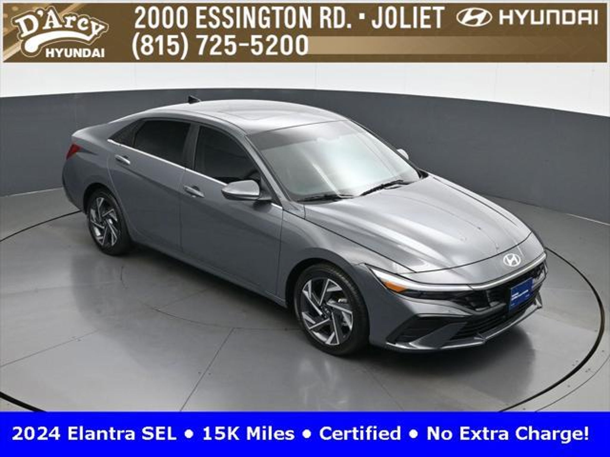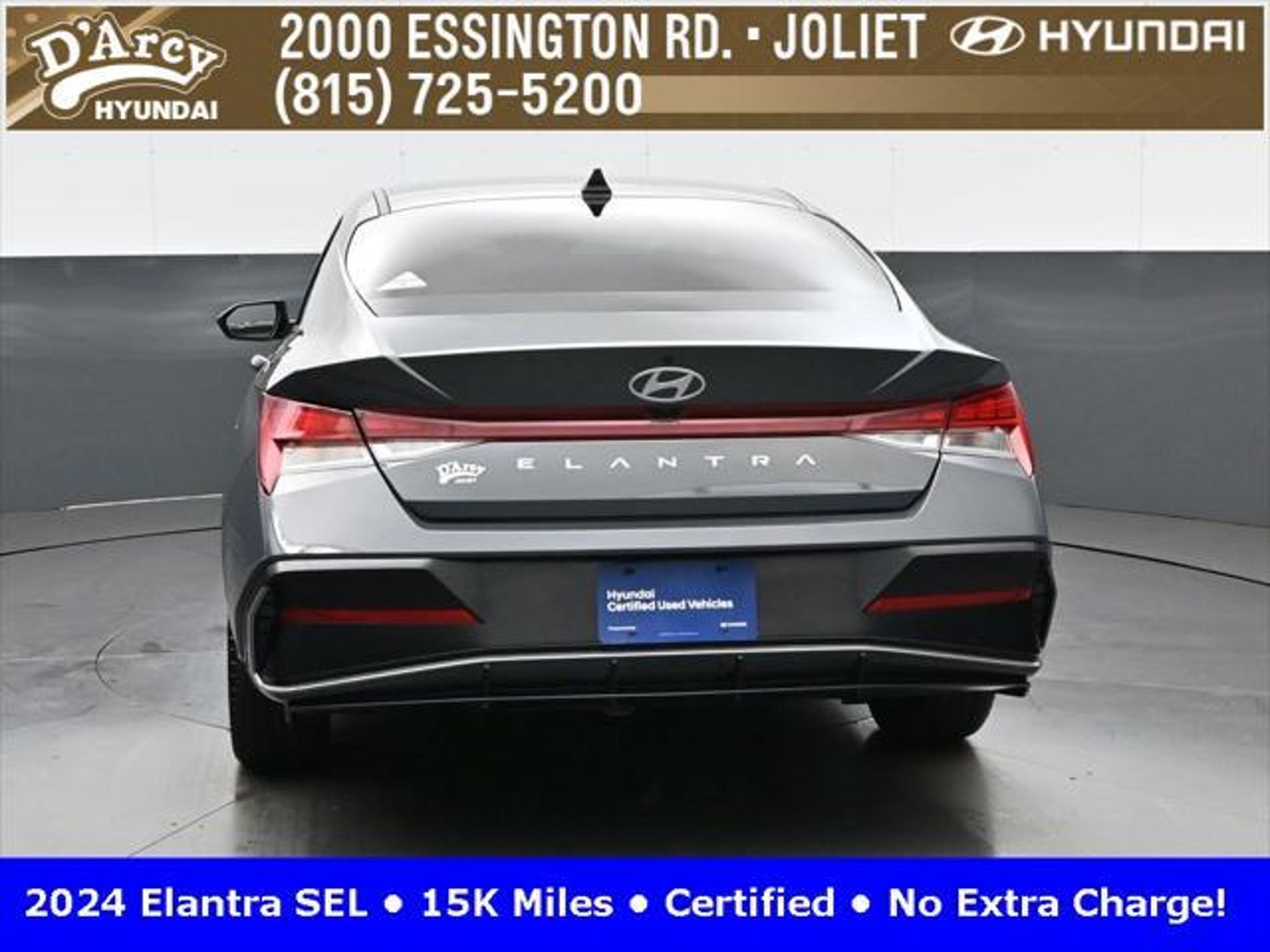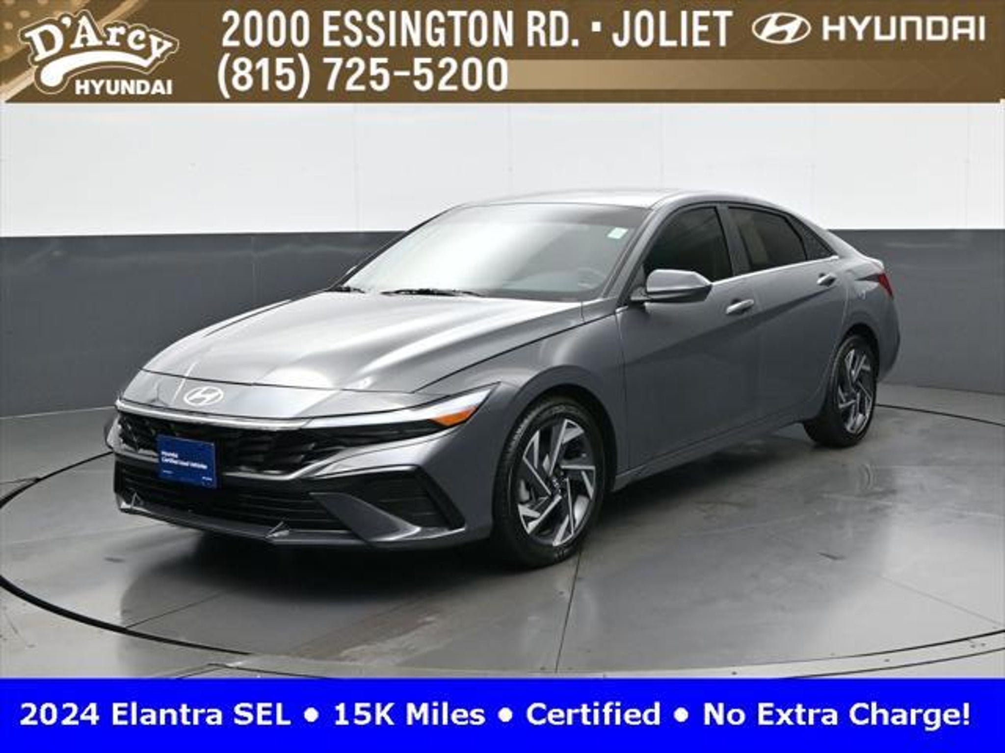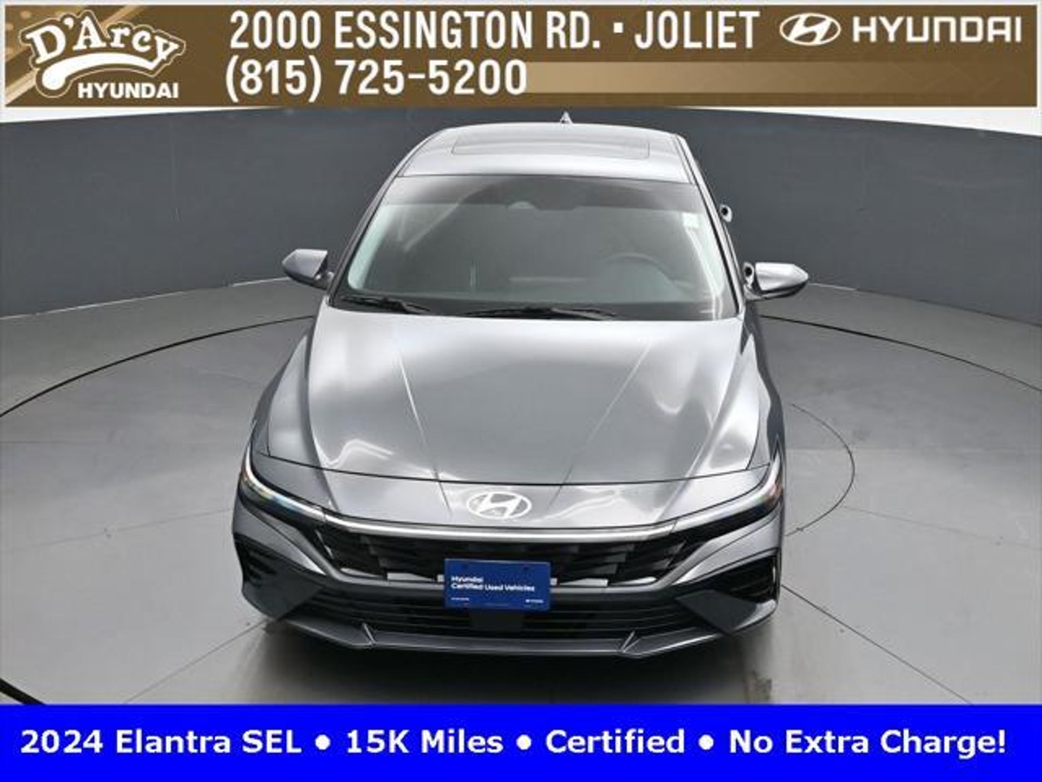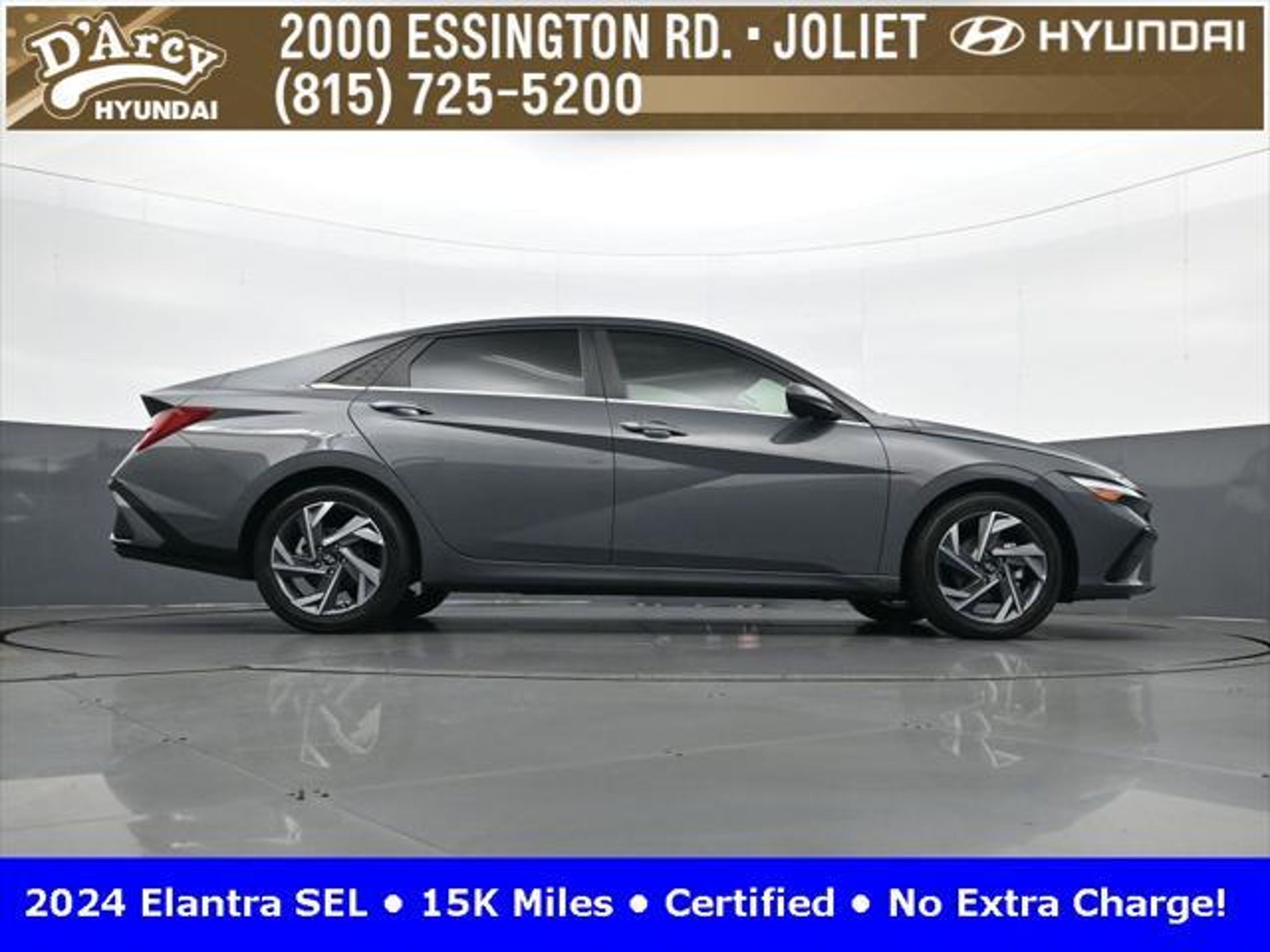 CARFAX One-Owner. ONE OWNER LOCAL TRADE!, LOW MILES!, GREAT VEHICLE HISTORY!, REMAINING FULL FACTORY WARRANTY!, SUNROOF!, BOUGHT HERE SERVICED HERE!, HYUNDAI CERTIFIED!, FULLY SERVICED AND READY TO GO!. Certified. Recent Arrival! Ecotronic Gray 2024 Hyundai Elantra SEL FWD CVT I4 Hyundai Certified Used Vehicles Details: * Warranty Deductible: $50 * Limited Warranty: 60 Month/60,000 Mile (whichever comes first) from original in-service date * Powertrain Limited Warranty: 120 Month/100,000 Mile (whichever comes first) from original in-service date * Includes 10-year/Unlimited Mileage Roadside Assistance with Rental Car and Trip Interruption Reimbursement; Please See Dealers for Specific Vehicle Eligibility Requirements. 10-Year/100,000 Mile Hybrid/EV Battery Warranty. 3-Months SiriusXM Trial Subscription. Complimentary 1 Year (Connected Care & Remote Pkgs). * Vehicle History * Roadside Assistance * 173 Point Inspection Discover the D'Arcy Difference! We care - we are here and we are ready to help! Stop by today to see up to date information, including showroom and service hours, and how to make an appointment or schedule delivery. D'Arcy Motors has been serving Joliet and its surrounding communities for over 25 years. Our business philosophy, which is to sell cars one car at a time and to make the guest the most important part of the process, has remained the same since 1991. Contact us today to experience the D'Arcy Difference! Pulse® Safer Braking Technology for $399 added to all New and CPO"“ The rear-end collision deterrent that rapidly pulses your third brake light four times before going solid when you press the brake pedal. This feature enhances safety by helping alert trailing drivers. Discover the D'Arcy Difference! We care - we are here and we are ready to help! Stop by today to see up to date information, including showroom and service hours, and how to make an appointment or schedule delivery. D'Arcy Motors has been serving Joliet and its surrounding communities for over 25 years. Our business philosophy, which is to sell cars one car at a time and to make the guest the most important part of the process, has remained the same since 1991. Contact us today to experience the D'Arcy Difference! 31/40 City/Highway MPG This 2024 Hyundai Elantra comes equipped with: Convenience Package (60/40 Split Fldng Rr Seatback w/Armrest & Cup Hld, Dynamic Voice Recognition, Electronic Parking Brake, Forward Collision Avoidance Assist, Heated Front Seats, Heated Outside Mirrors, Leather-Wrapped Steering Wheel, Option Group 02, Smart Cruise Control w/Stop & Go, Wheels: 17 x 7.0J Machine Finish Alloy, and Wireless Charging Pad (QI)), 16 x 6.5J Alloy Wheels, 4-Wheel Disc Brakes, 6 Speakers, ABS brakes, Air Conditioning, Alloy wheels, AM/FM radio: SiriusXM, Apple CarPlay & Android Auto, Auto High-beam Headlights, Automatic temperature control, Brake assist, Bumpers: body-color, Cargo Net, Cargo Side Bins, Carpeted Floor Mats, Cloth Seat Trim, Delay-off headlights, Driver door bin, Driver vanity mirror, Dual front impact airbags, Dual front side impact airbags, Electronic Stability Control, Emergency communication system: Bluelink, Exterior Parking Camera Rear, First Aid Kit, Front anti-roll bar, Front Bucket Seats, Front Center Armrest, Front dual zone A/C, Front reading lights, Front wheel independent suspension, Fully automatic headlights, Illuminated entry, Low tire pressure warning, Navigation System, Occupant sensing airbag, Outside temperature display, Overhead airbag, Overhead console, Panic alarm, Passenger door bin, Passenger vanity mirror, Power door mirrors, Power steering, Power windows, Radio: AM/FM/HD/SiriusXM Display Audio, Rear side impact airbag, Rear window defroster, Remote keyless entry, Reversible Cargo Tray, Security system, Speed control, Speed-sensing steering, Steering wheel mounted audio controls, Tachometer, Telescoping steering wheel, Til