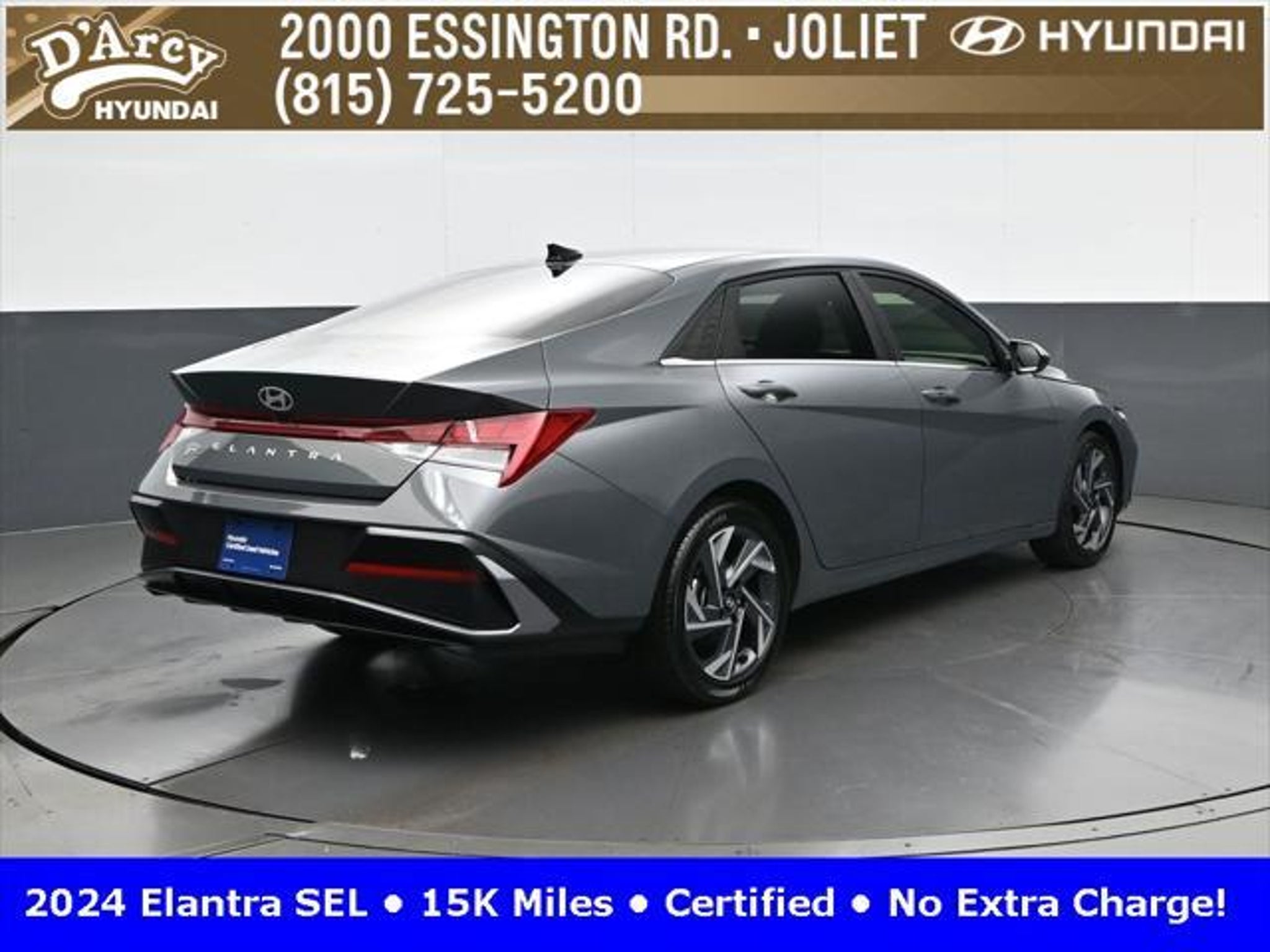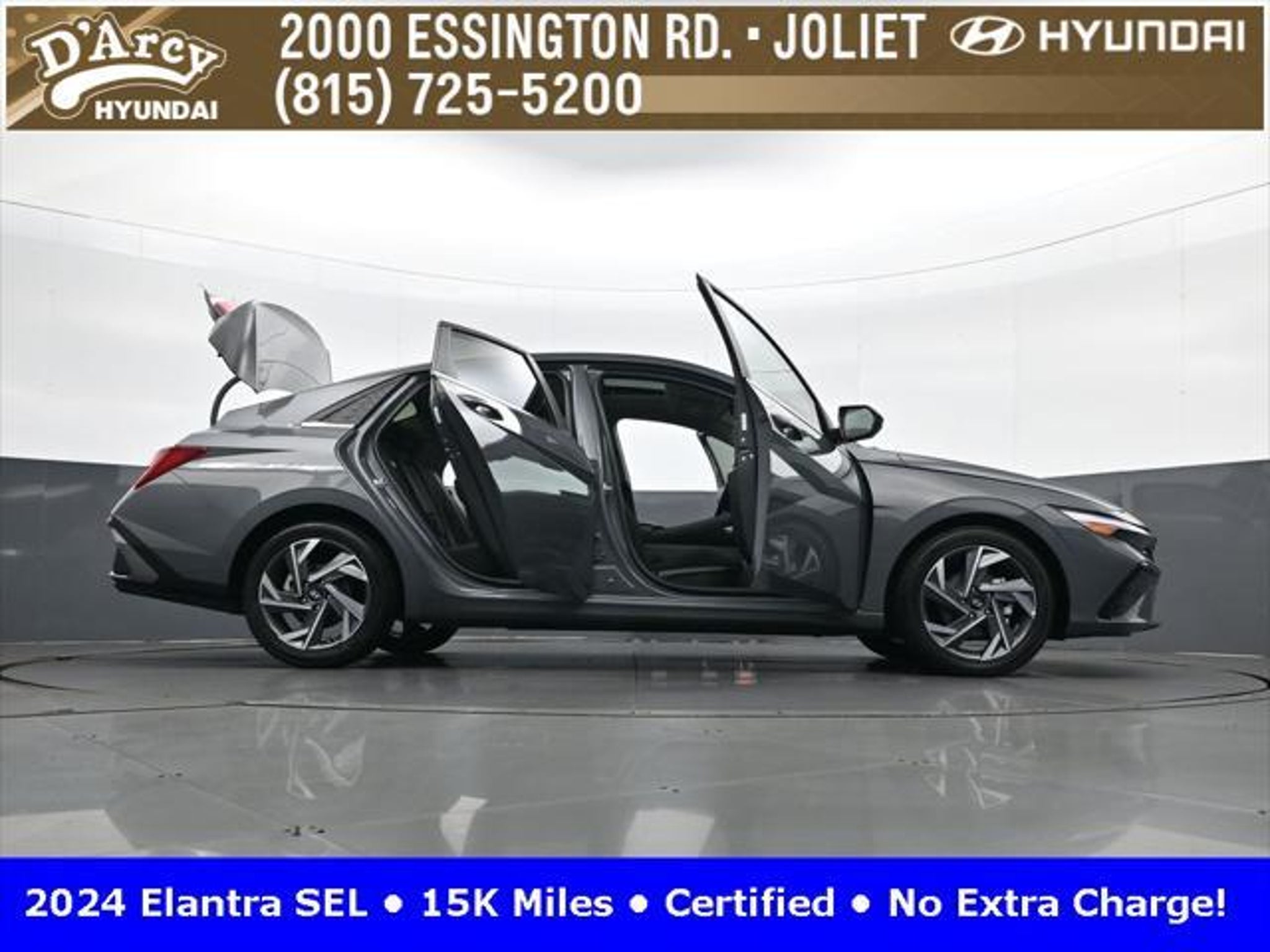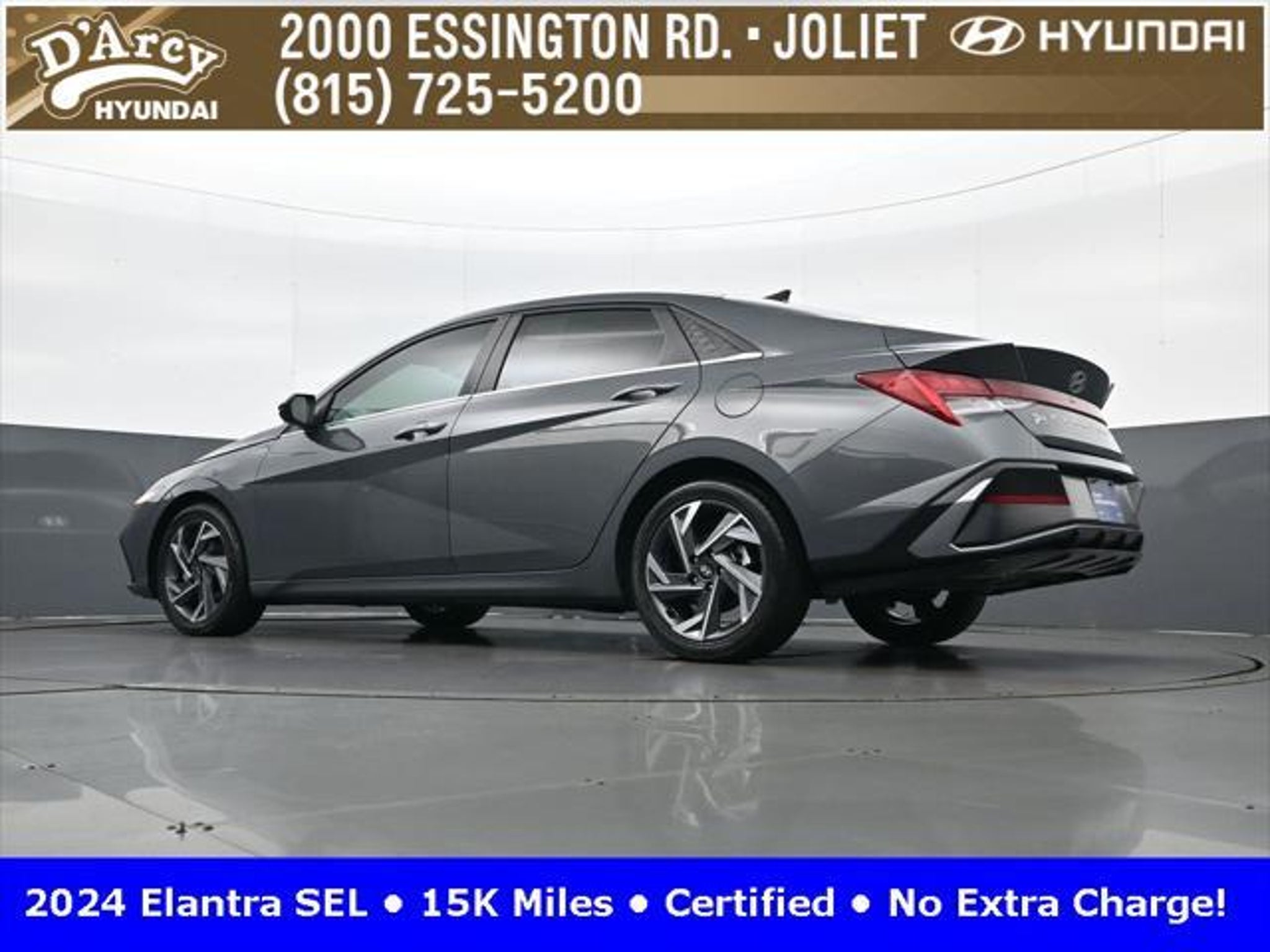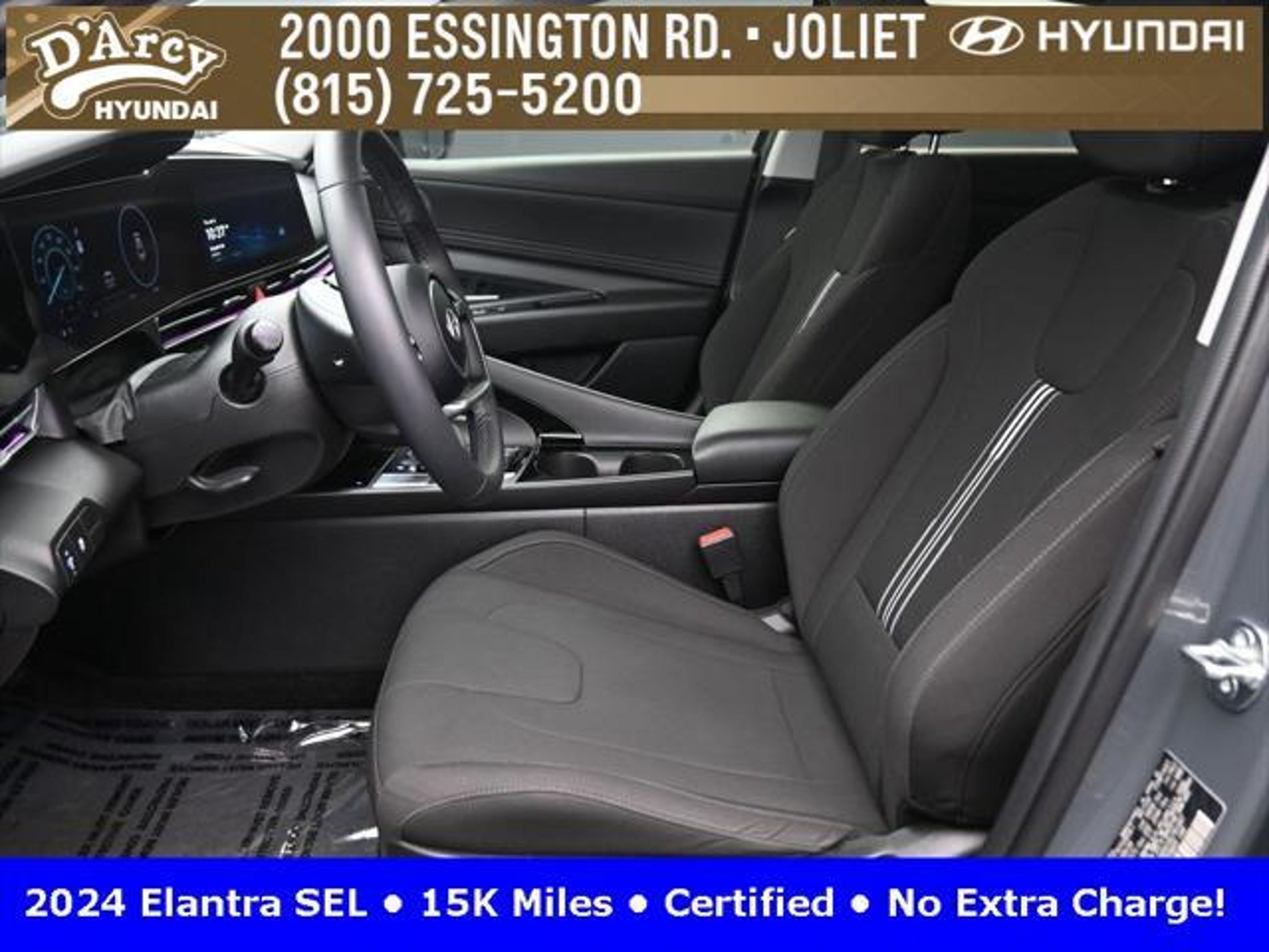 CARFAX One-Owner. ONE OWNER LOCAL TRADE!, LOW MILES!, GREAT VEHICLE HISTORY!, REMAINING FULL FACTORY WARRANTY!, SUNROOF!, BOUGHT HERE SERVICED HERE!, HYUNDAI CERTIFIED!, FULLY SERVICED AND READY TO GO!. Certified. Recent Arrival! Ecotronic Gray 2024 Hyundai Elantra SEL FWD CVT I4 Hyundai Certified Used Vehicles Details: * Warranty Deductible: $50 * Limited Warranty: 60 Month/60,000 Mile (whichever comes first) from original in-service date * Powertrain Limited Warranty: 120 Month/100,000 Mile (whichever comes first) from original in-service date * Includes 10-year/Unlimited Mileage Roadside Assistance with Rental Car and Trip Interruption Reimbursement; Please See Dealers for Specific Vehicle Eligibility Requirements. 10-Year/100,000 Mile Hybrid/EV Battery Warranty. 3-Months SiriusXM Trial Subscription. Complimentary 1 Year (Connected Care & Remote Pkgs). * Vehicle History * Roadside Assistance * 173 Point Inspection Discover the D'Arcy Difference! We care - we are here and we are ready to help! Stop by today to see up to date information, including showroom and service hours, and how to make an appointment or schedule delivery. D'Arcy Motors has been serving Joliet and its surrounding communities for over 25 years. Our business philosophy, which is to sell cars one car at a time and to make the guest the most important part of the process, has remained the same since 1991. Contact us today to experience the D'Arcy Difference! Pulse® Safer Braking Technology for $399 added to all New and CPO"“ The rear-end collision deterrent that rapidly pulses your third brake light four times before going solid when you press the brake pedal. This feature enhances safety by helping alert trailing drivers. Discover the D'Arcy Difference! We care - we are here and we are ready to help! Stop by today to see up to date information, including showroom and service hours, and how to make an appointment or schedule delivery. D'Arcy Motors has been serving Joliet and its surrounding communities for over 25 years. Our business philosophy, which is to sell cars one car at a time and to make the guest the most important part of the process, has remained the same since 1991. Contact us today to experience the D'Arcy Difference! 31/40 City/Highway MPG This 2024 Hyundai Elantra comes equipped with: Convenience Package (60/40 Split Fldng Rr Seatback w/Armrest & Cup Hld, Dynamic Voice Recognition, Electronic Parking Brake, Forward Collision Avoidance Assist, Heated Front Seats, Heated Outside Mirrors, Leather-Wrapped Steering Wheel, Option Group 02, Smart Cruise Control w/Stop & Go, Wheels: 17 x 7.0J Machine Finish Alloy, and Wireless Charging Pad (QI)), 16 x 6.5J Alloy Wheels, 4-Wheel Disc Brakes, 6 Speakers, ABS brakes, Air Conditioning, Alloy wheels, AM/FM radio: SiriusXM, Apple CarPlay & Android Auto, Auto High-beam Headlights, Automatic temperature control, Brake assist, Bumpers: body-color, Cargo Net, Cargo Side Bins, Carpeted Floor Mats, Cloth Seat Trim, Delay-off headlights, Driver door bin, Driver vanity mirror, Dual front impact airbags, Dual front side impact airbags, Electronic Stability Control, Emergency communication system: Bluelink, Exterior Parking Camera Rear, First Aid Kit, Front anti-roll bar, Front Bucket Seats, Front Center Armrest, Front dual zone A/C, Front reading lights, Front wheel independent suspension, Fully automatic headlights, Illuminated entry, Low tire pressure warning, Navigation System, Occupant sensing airbag, Outside temperature display, Overhead airbag, Overhead console, Panic alarm, Passenger door bin, Passenger vanity mirror, Power door mirrors, Power steering, Power windows, Radio: AM/FM/HD/SiriusXM Display Audio, Rear side impact airbag, Rear window defroster, Remote keyless entry, Reversible Cargo Tray, Security system, Speed control, Speed-sensing steering, Steering wheel mounted audio controls, Tachometer, Telescoping steering wheel, Til