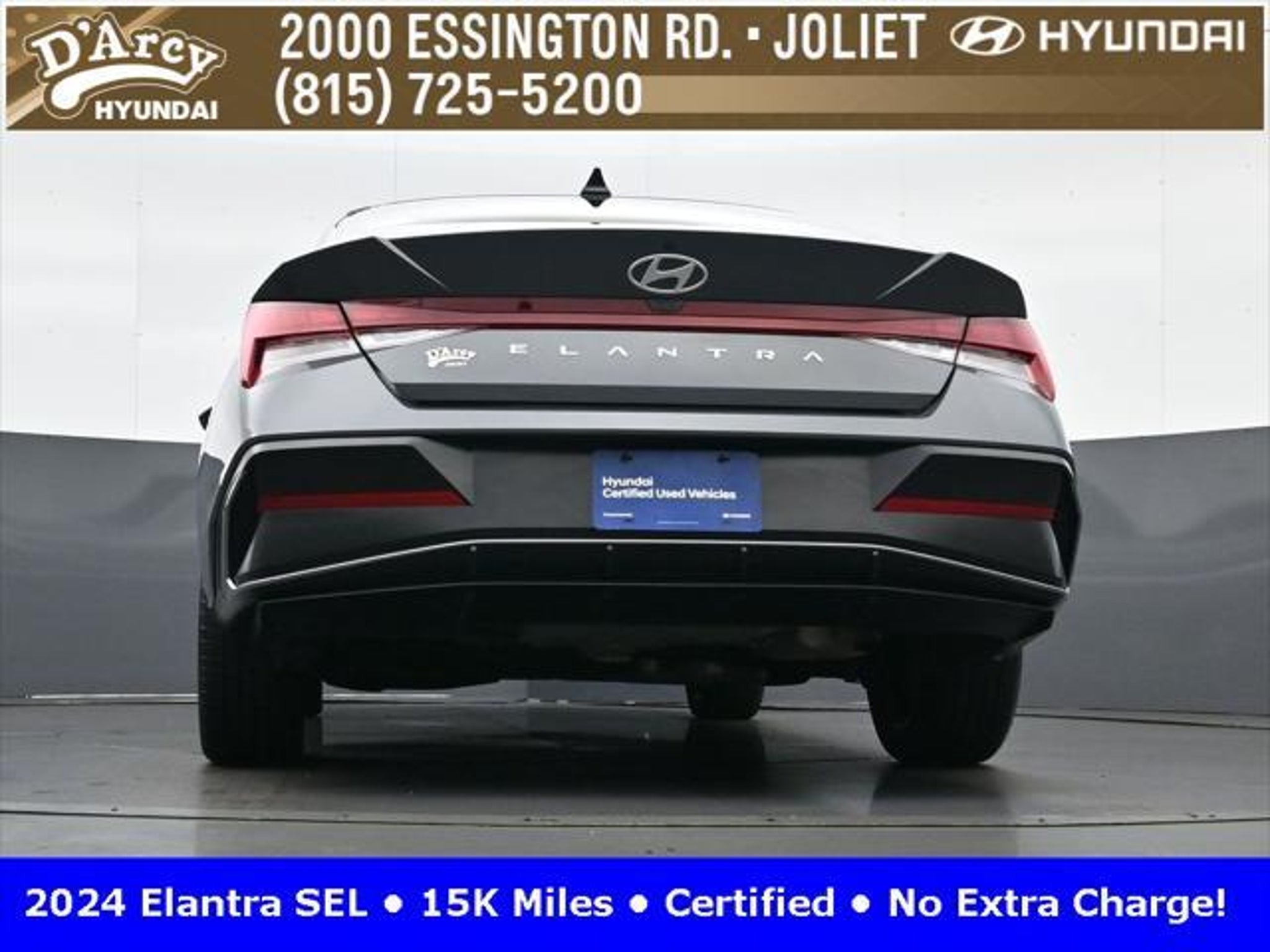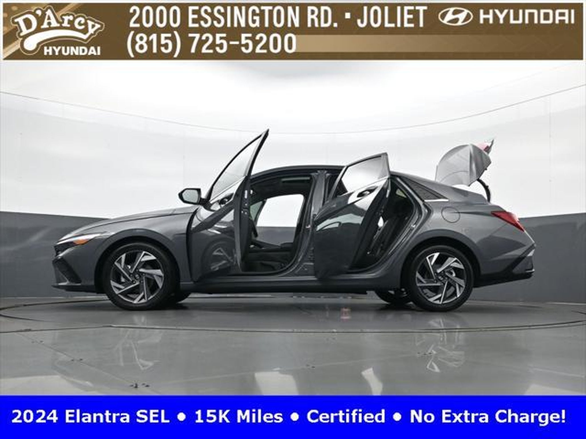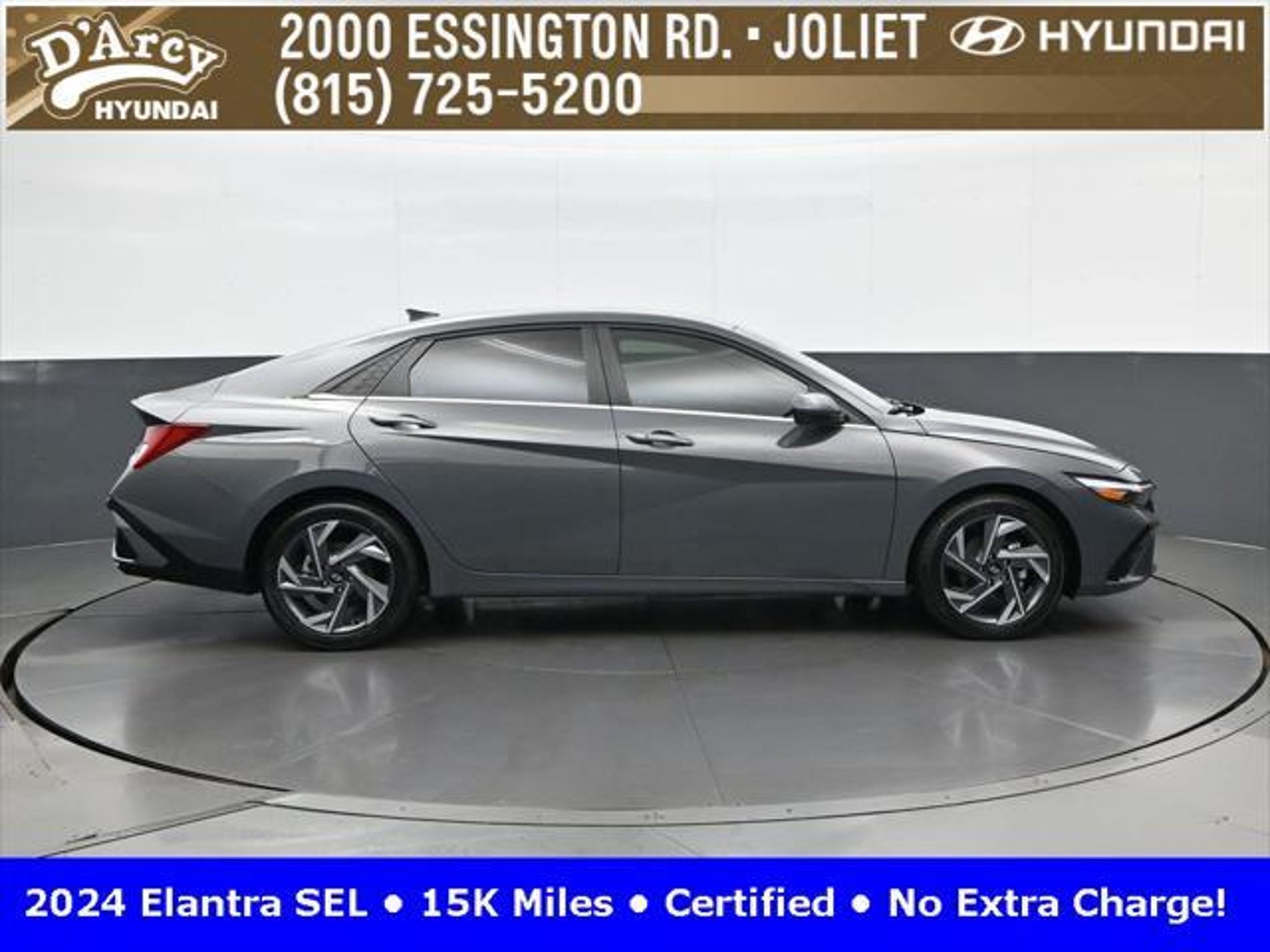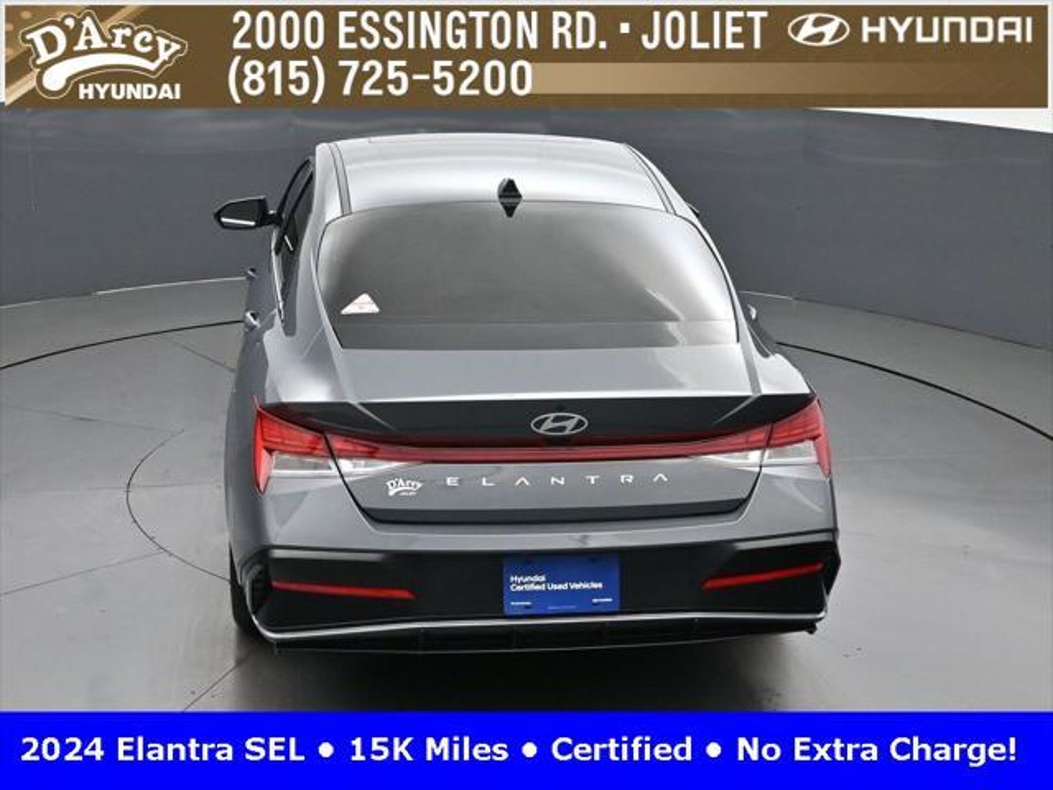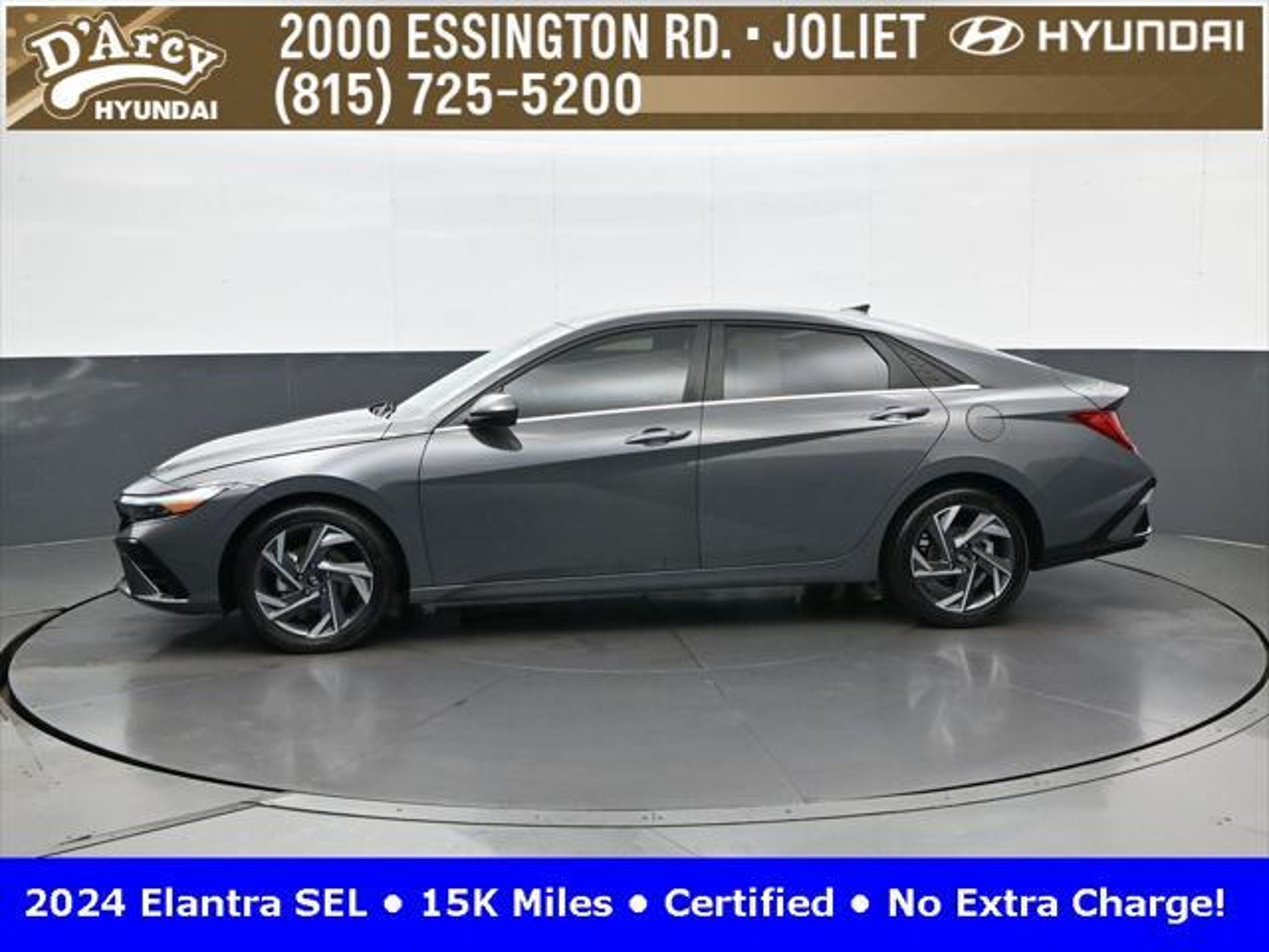 CARFAX One-Owner. ONE OWNER LOCAL TRADE!, LOW MILES!, GREAT VEHICLE HISTORY!, REMAINING FULL FACTORY WARRANTY!, SUNROOF!, BOUGHT HERE SERVICED HERE!, HYUNDAI CERTIFIED!, FULLY SERVICED AND READY TO GO!. Certified. Recent Arrival! Ecotronic Gray 2024 Hyundai Elantra SEL FWD CVT I4 Hyundai Certified Used Vehicles Details: * Warranty Deductible: $50 * Limited Warranty: 60 Month/60,000 Mile (whichever comes first) from original in-service date * Powertrain Limited Warranty: 120 Month/100,000 Mile (whichever comes first) from original in-service date * Includes 10-year/Unlimited Mileage Roadside Assistance with Rental Car and Trip Interruption Reimbursement; Please See Dealers for Specific Vehicle Eligibility Requirements. 10-Year/100,000 Mile Hybrid/EV Battery Warranty. 3-Months SiriusXM Trial Subscription. Complimentary 1 Year (Connected Care & Remote Pkgs). * Vehicle History * Roadside Assistance * 173 Point Inspection Discover the D'Arcy Difference! We care - we are here and we are ready to help! Stop by today to see up to date information, including showroom and service hours, and how to make an appointment or schedule delivery. D'Arcy Motors has been serving Joliet and its surrounding communities for over 25 years. Our business philosophy, which is to sell cars one car at a time and to make the guest the most important part of the process, has remained the same since 1991. Contact us today to experience the D'Arcy Difference! Pulse® Safer Braking Technology for $399 added to all New and CPO"“ The rear-end collision deterrent that rapidly pulses your third brake light four times before going solid when you press the brake pedal. This feature enhances safety by helping alert trailing drivers. Discover the D'Arcy Difference! We care - we are here and we are ready to help! Stop by today to see up to date information, including showroom and service hours, and how to make an appointment or schedule delivery. D'Arcy Motors has been serving Joliet and its surrounding communities for over 25 years. Our business philosophy, which is to sell cars one car at a time and to make the guest the most important part of the process, has remained the same since 1991. Contact us today to experience the D'Arcy Difference! 31/40 City/Highway MPG This 2024 Hyundai Elantra comes equipped with: Convenience Package (60/40 Split Fldng Rr Seatback w/Armrest & Cup Hld, Dynamic Voice Recognition, Electronic Parking Brake, Forward Collision Avoidance Assist, Heated Front Seats, Heated Outside Mirrors, Leather-Wrapped Steering Wheel, Option Group 02, Smart Cruise Control w/Stop & Go, Wheels: 17 x 7.0J Machine Finish Alloy, and Wireless Charging Pad (QI)), 16 x 6.5J Alloy Wheels, 4-Wheel Disc Brakes, 6 Speakers, ABS brakes, Air Conditioning, Alloy wheels, AM/FM radio: SiriusXM, Apple CarPlay & Android Auto, Auto High-beam Headlights, Automatic temperature control, Brake assist, Bumpers: body-color, Cargo Net, Cargo Side Bins, Carpeted Floor Mats, Cloth Seat Trim, Delay-off headlights, Driver door bin, Driver vanity mirror, Dual front impact airbags, Dual front side impact airbags, Electronic Stability Control, Emergency communication system: Bluelink, Exterior Parking Camera Rear, First Aid Kit, Front anti-roll bar, Front Bucket Seats, Front Center Armrest, Front dual zone A/C, Front reading lights, Front wheel independent suspension, Fully automatic headlights, Illuminated entry, Low tire pressure warning, Navigation System, Occupant sensing airbag, Outside temperature display, Overhead airbag, Overhead console, Panic alarm, Passenger door bin, Passenger vanity mirror, Power door mirrors, Power steering, Power windows, Radio: AM/FM/HD/SiriusXM Display Audio, Rear side impact airbag, Rear window defroster, Remote keyless entry, Reversible Cargo Tray, Security system, Speed control, Speed-sensing steering, Steering wheel mounted audio controls, Tachometer, Telescoping steering wheel, Til