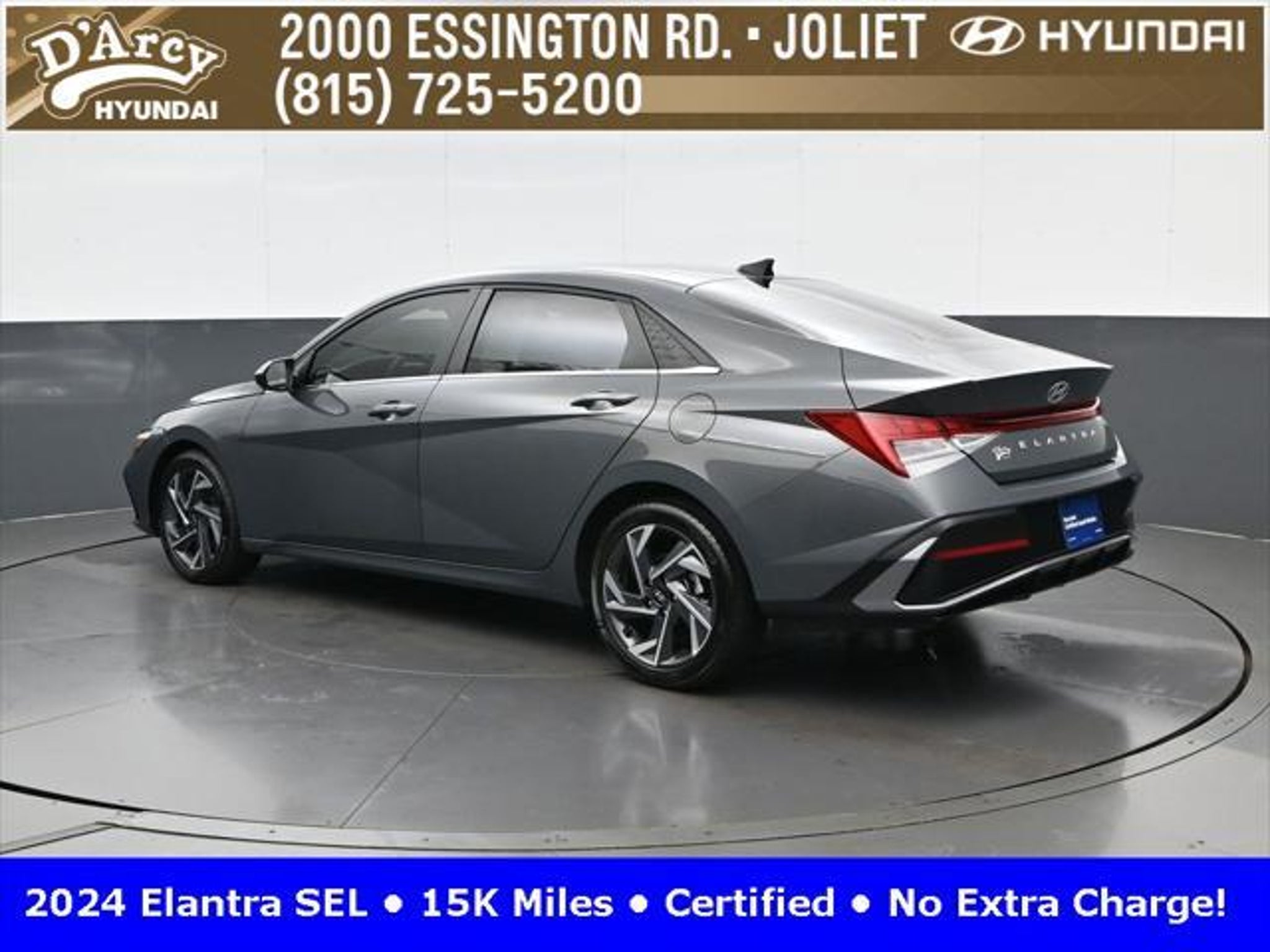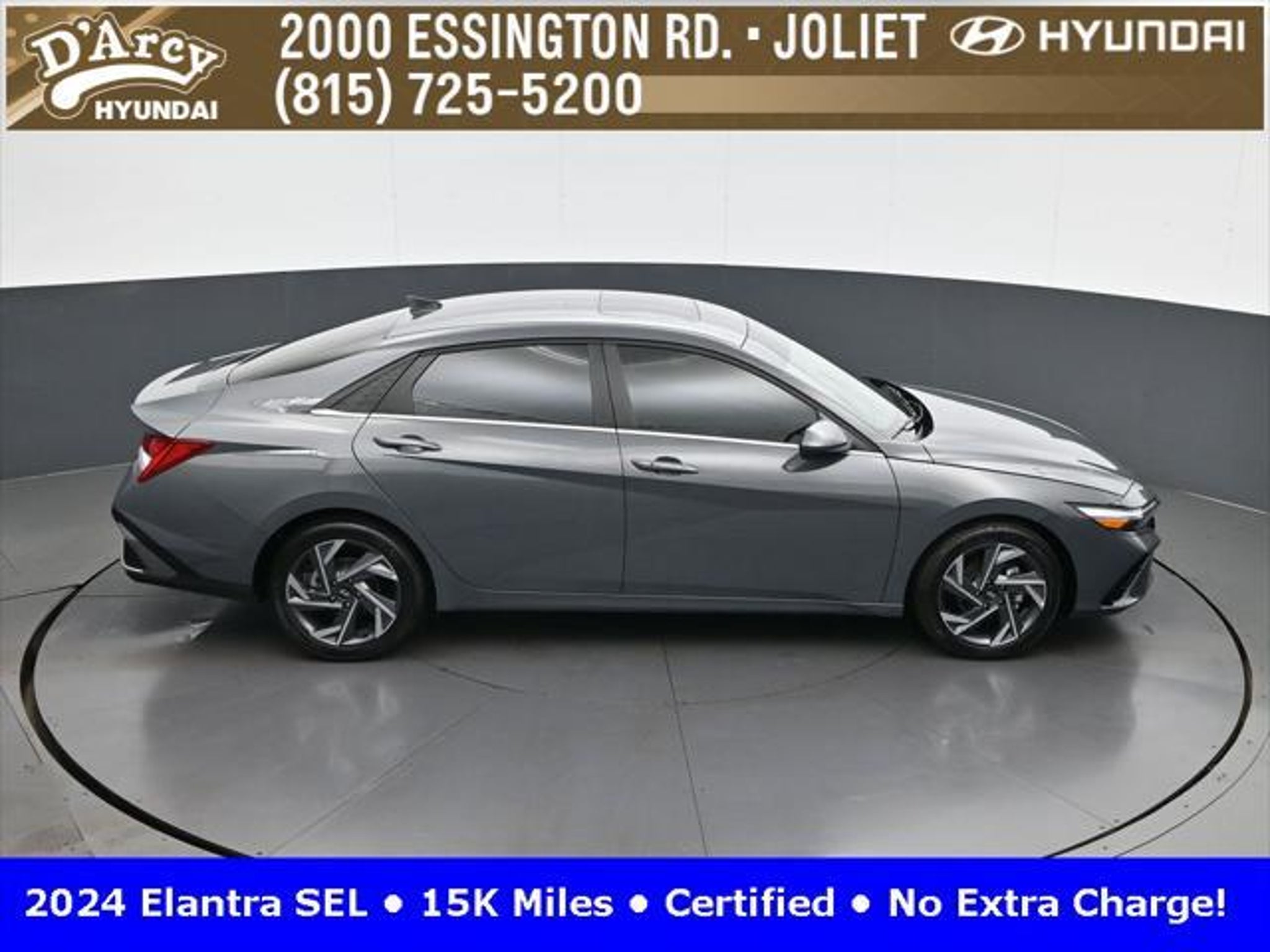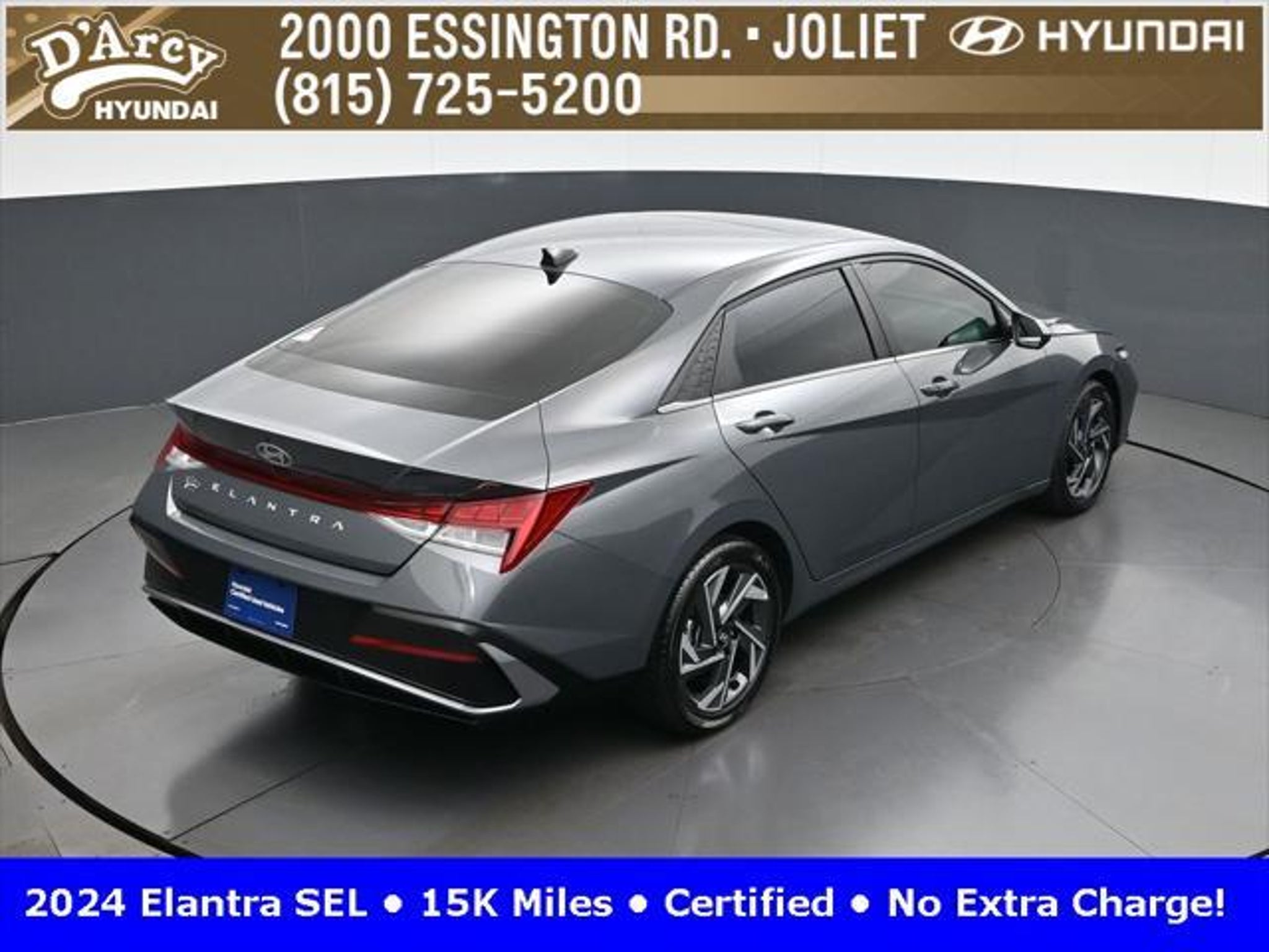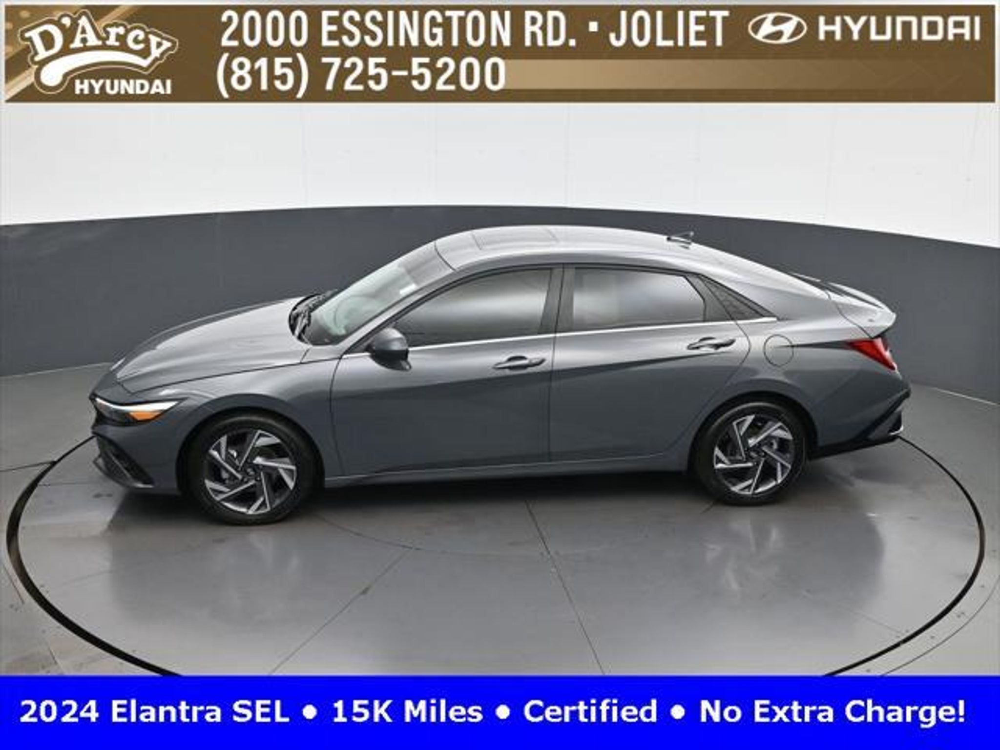 CARFAX One-Owner. ONE OWNER LOCAL TRADE!, LOW MILES!, GREAT VEHICLE HISTORY!, REMAINING FULL FACTORY WARRANTY!, SUNROOF!, BOUGHT HERE SERVICED HERE!, HYUNDAI CERTIFIED!, FULLY SERVICED AND READY TO GO!. Certified. Recent Arrival! Ecotronic Gray 2024 Hyundai Elantra SEL FWD CVT I4 Hyundai Certified Used Vehicles Details: * Warranty Deductible: $50 * Limited Warranty: 60 Month/60,000 Mile (whichever comes first) from original in-service date * Powertrain Limited Warranty: 120 Month/100,000 Mile (whichever comes first) from original in-service date * Includes 10-year/Unlimited Mileage Roadside Assistance with Rental Car and Trip Interruption Reimbursement; Please See Dealers for Specific Vehicle Eligibility Requirements. 10-Year/100,000 Mile Hybrid/EV Battery Warranty. 3-Months SiriusXM Trial Subscription. Complimentary 1 Year (Connected Care & Remote Pkgs). * Vehicle History * Roadside Assistance * 173 Point Inspection Discover the D'Arcy Difference! We care - we are here and we are ready to help! Stop by today to see up to date information, including showroom and service hours, and how to make an appointment or schedule delivery. D'Arcy Motors has been serving Joliet and its surrounding communities for over 25 years. Our business philosophy, which is to sell cars one car at a time and to make the guest the most important part of the process, has remained the same since 1991. Contact us today to experience the D'Arcy Difference! Pulse® Safer Braking Technology for $399 added to all New and CPO"“ The rear-end collision deterrent that rapidly pulses your third brake light four times before going solid when you press the brake pedal. This feature enhances safety by helping alert trailing drivers. Discover the D'Arcy Difference! We care - we are here and we are ready to help! Stop by today to see up to date information, including showroom and service hours, and how to make an appointment or schedule delivery. D'Arcy Motors has been serving Joliet and its surrounding communities for over 25 years. Our business philosophy, which is to sell cars one car at a time and to make the guest the most important part of the process, has remained the same since 1991. Contact us today to experience the D'Arcy Difference! 31/40 City/Highway MPG This 2024 Hyundai Elantra comes equipped with: Convenience Package (60/40 Split Fldng Rr Seatback w/Armrest & Cup Hld, Dynamic Voice Recognition, Electronic Parking Brake, Forward Collision Avoidance Assist, Heated Front Seats, Heated Outside Mirrors, Leather-Wrapped Steering Wheel, Option Group 02, Smart Cruise Control w/Stop & Go, Wheels: 17 x 7.0J Machine Finish Alloy, and Wireless Charging Pad (QI)), 16 x 6.5J Alloy Wheels, 4-Wheel Disc Brakes, 6 Speakers, ABS brakes, Air Conditioning, Alloy wheels, AM/FM radio: SiriusXM, Apple CarPlay & Android Auto, Auto High-beam Headlights, Automatic temperature control, Brake assist, Bumpers: body-color, Cargo Net, Cargo Side Bins, Carpeted Floor Mats, Cloth Seat Trim, Delay-off headlights, Driver door bin, Driver vanity mirror, Dual front impact airbags, Dual front side impact airbags, Electronic Stability Control, Emergency communication system: Bluelink, Exterior Parking Camera Rear, First Aid Kit, Front anti-roll bar, Front Bucket Seats, Front Center Armrest, Front dual zone A/C, Front reading lights, Front wheel independent suspension, Fully automatic headlights, Illuminated entry, Low tire pressure warning, Navigation System, Occupant sensing airbag, Outside temperature display, Overhead airbag, Overhead console, Panic alarm, Passenger door bin, Passenger vanity mirror, Power door mirrors, Power steering, Power windows, Radio: AM/FM/HD/SiriusXM Display Audio, Rear side impact airbag, Rear window defroster, Remote keyless entry, Reversible Cargo Tray, Security system, Speed control, Speed-sensing steering, Steering wheel mounted audio controls, Tachometer, Telescoping steering wheel, Til