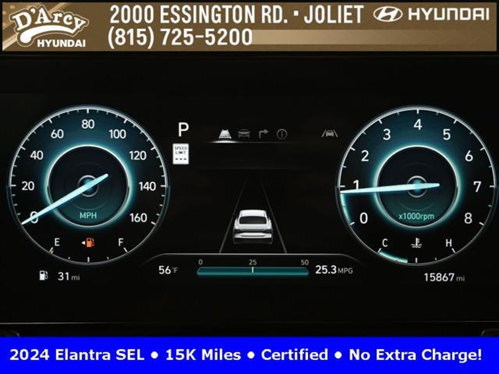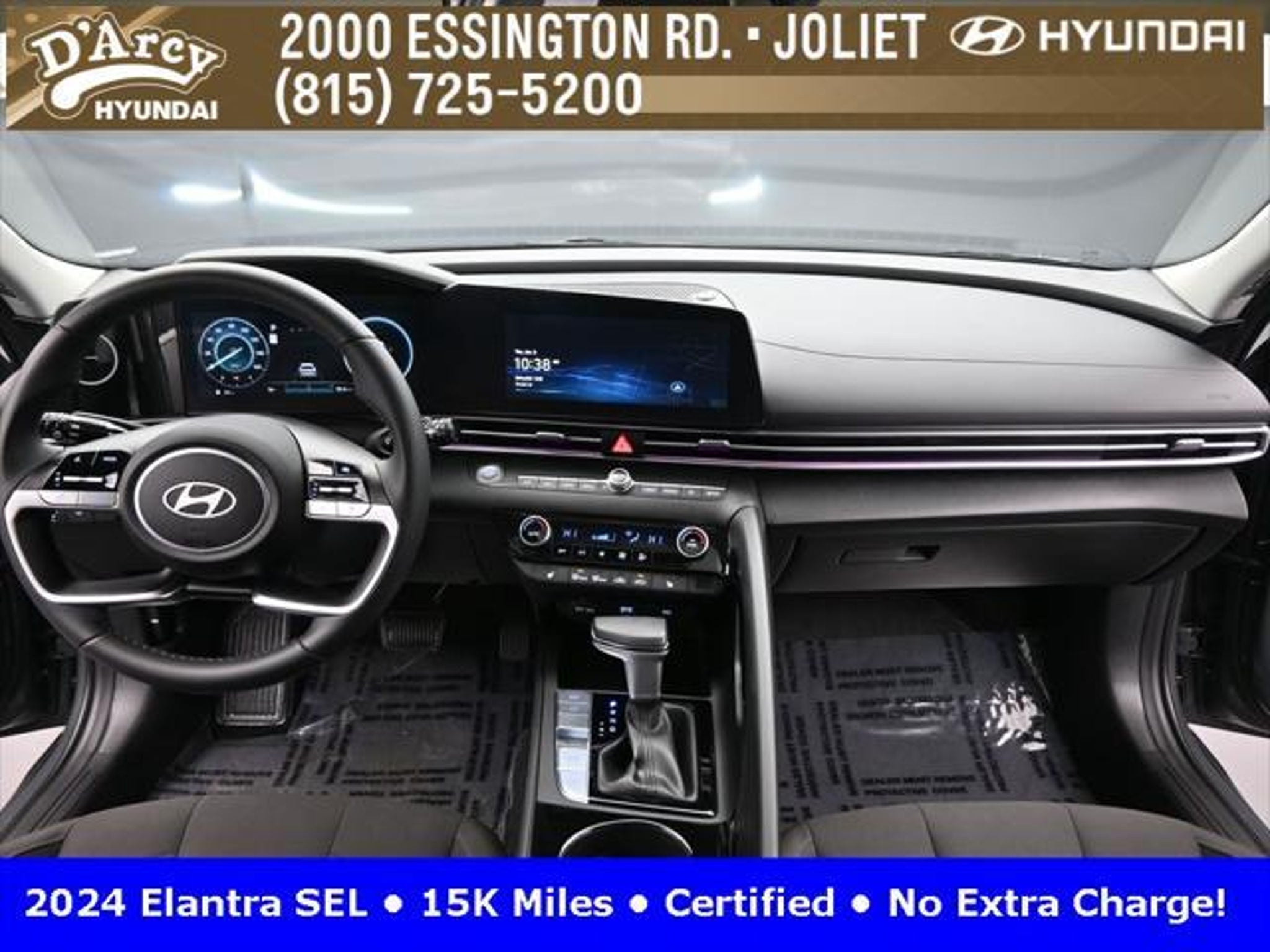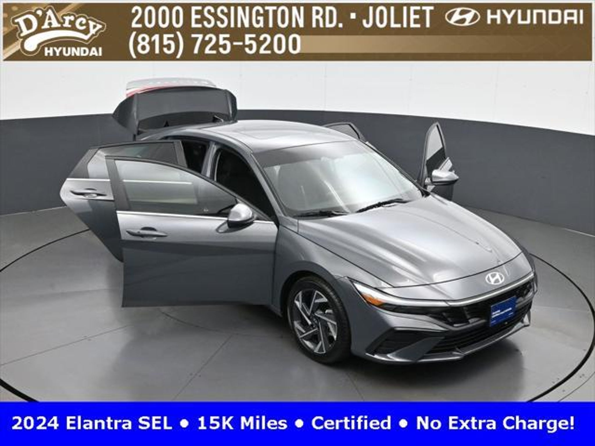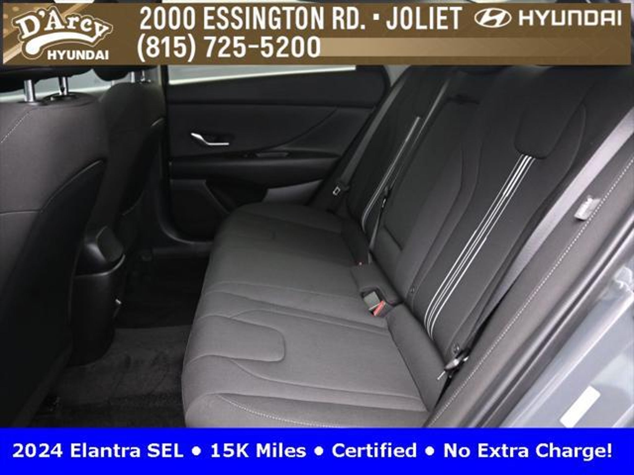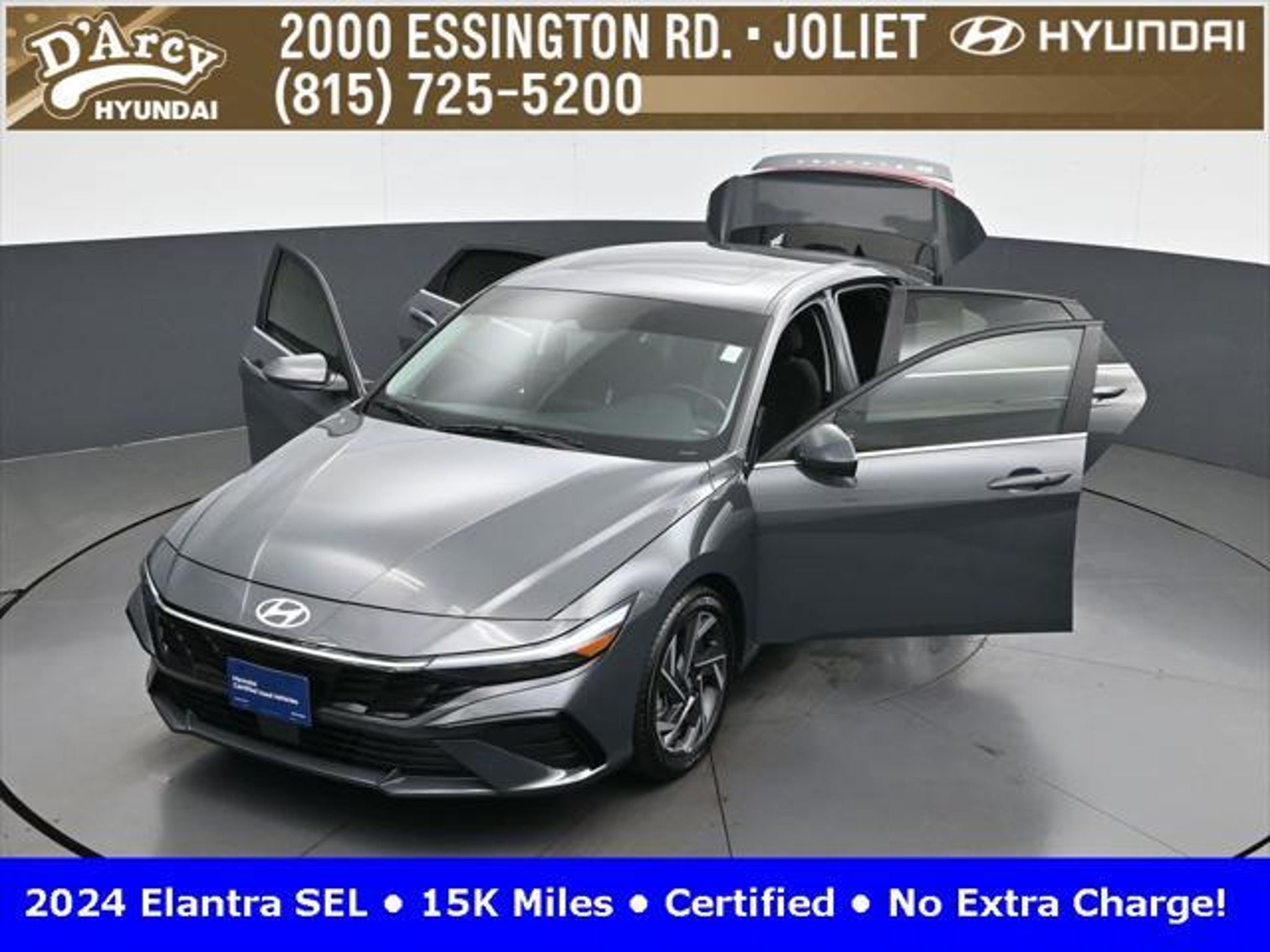 CARFAX One-Owner. ONE OWNER LOCAL TRADE!, LOW MILES!, GREAT VEHICLE HISTORY!, REMAINING FULL FACTORY WARRANTY!, SUNROOF!, BOUGHT HERE SERVICED HERE!, HYUNDAI CERTIFIED!, FULLY SERVICED AND READY TO GO!. Certified. Recent Arrival! Ecotronic Gray 2024 Hyundai Elantra SEL FWD CVT I4 Hyundai Certified Used Vehicles Details: * Warranty Deductible: $50 * Limited Warranty: 60 Month/60,000 Mile (whichever comes first) from original in-service date * Powertrain Limited Warranty: 120 Month/100,000 Mile (whichever comes first) from original in-service date * Includes 10-year/Unlimited Mileage Roadside Assistance with Rental Car and Trip Interruption Reimbursement; Please See Dealers for Specific Vehicle Eligibility Requirements. 10-Year/100,000 Mile Hybrid/EV Battery Warranty. 3-Months SiriusXM Trial Subscription. Complimentary 1 Year (Connected Care & Remote Pkgs). * Vehicle History * Roadside Assistance * 173 Point Inspection Discover the D'Arcy Difference! We care - we are here and we are ready to help! Stop by today to see up to date information, including showroom and service hours, and how to make an appointment or schedule delivery. D'Arcy Motors has been serving Joliet and its surrounding communities for over 25 years. Our business philosophy, which is to sell cars one car at a time and to make the guest the most important part of the process, has remained the same since 1991. Contact us today to experience the D'Arcy Difference! Pulse® Safer Braking Technology for $399 added to all New and CPO"“ The rear-end collision deterrent that rapidly pulses your third brake light four times before going solid when you press the brake pedal. This feature enhances safety by helping alert trailing drivers. Discover the D'Arcy Difference! We care - we are here and we are ready to help! Stop by today to see up to date information, including showroom and service hours, and how to make an appointment or schedule delivery. D'Arcy Motors has been serving Joliet and its surrounding communities for over 25 years. Our business philosophy, which is to sell cars one car at a time and to make the guest the most important part of the process, has remained the same since 1991. Contact us today to experience the D'Arcy Difference! 31/40 City/Highway MPG This 2024 Hyundai Elantra comes equipped with: Convenience Package (60/40 Split Fldng Rr Seatback w/Armrest & Cup Hld, Dynamic Voice Recognition, Electronic Parking Brake, Forward Collision Avoidance Assist, Heated Front Seats, Heated Outside Mirrors, Leather-Wrapped Steering Wheel, Option Group 02, Smart Cruise Control w/Stop & Go, Wheels: 17 x 7.0J Machine Finish Alloy, and Wireless Charging Pad (QI)), 16 x 6.5J Alloy Wheels, 4-Wheel Disc Brakes, 6 Speakers, ABS brakes, Air Conditioning, Alloy wheels, AM/FM radio: SiriusXM, Apple CarPlay & Android Auto, Auto High-beam Headlights, Automatic temperature control, Brake assist, Bumpers: body-color, Cargo Net, Cargo Side Bins, Carpeted Floor Mats, Cloth Seat Trim, Delay-off headlights, Driver door bin, Driver vanity mirror, Dual front impact airbags, Dual front side impact airbags, Electronic Stability Control, Emergency communication system: Bluelink, Exterior Parking Camera Rear, First Aid Kit, Front anti-roll bar, Front Bucket Seats, Front Center Armrest, Front dual zone A/C, Front reading lights, Front wheel independent suspension, Fully automatic headlights, Illuminated entry, Low tire pressure warning, Navigation System, Occupant sensing airbag, Outside temperature display, Overhead airbag, Overhead console, Panic alarm, Passenger door bin, Passenger vanity mirror, Power door mirrors, Power steering, Power windows, Radio: AM/FM/HD/SiriusXM Display Audio, Rear side impact airbag, Rear window defroster, Remote keyless entry, Reversible Cargo Tray, Security system, Speed control, Speed-sensing steering, Steering wheel mounted audio controls, Tachometer, Telescoping steering wheel, Til
