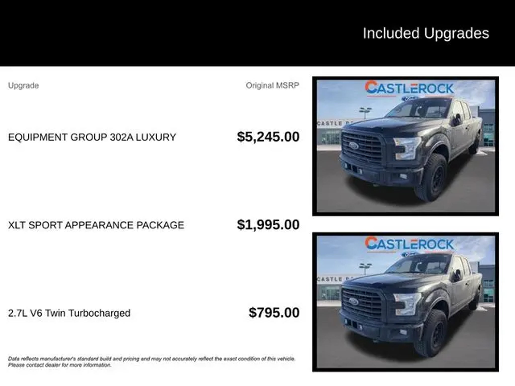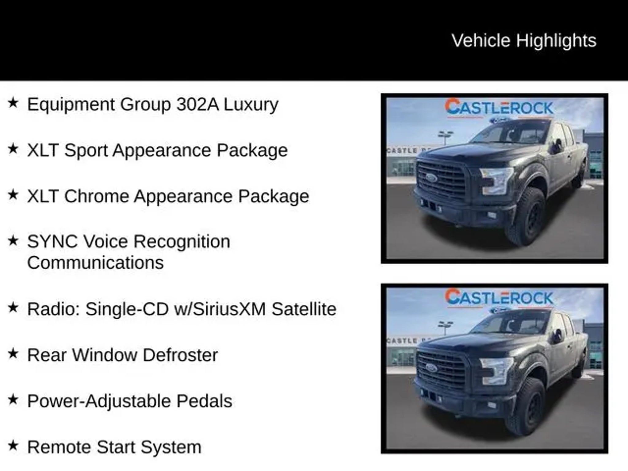 This 2016 Ford F-150 XLT is a rugged and capable truck that's ready to take on any challenge. With its powerful 2.7L V6 EcoBoost engine, 4-wheel drive, and impressive towing capacity of up to 5,000 lbs, this F-150 is built to handle your toughest jobs with ease. "¢ Remote Start System "¢ SYNC 3 with Enhanced Voice Recognition "¢ 10-Way Power Driver's & Passenger Seats "¢ Heated Front Seats "¢ 110V/400W Outlet "¢ Leather-Wrapped Steering Wheel "¢ Rear View Camera with Dynamic Hitch Assist "¢ Reverse Sensing System "¢ LED Box Lighting "¢ Power-Sliding Rear Window The XLT Luxury and Sport Appearance Packages elevate this F-150 with premium features like chrome exterior accents, a black billet-style grille, body-color bumpers, and 18-inch machined-aluminum wheels. The interior is equally impressive, with SYNC 3 connectivity, a 4.2-inch productivity screen, and a comfortable leather-wrapped steering wheel. Whether you're hauling heavy loads, towing a trailer, or simply enjoying the open road, this 2016 Ford F-150 XLT is up for the task. Its robust 4WD system and advanced safety features, including AdvanceTrac with Roll Stability Control, give you the confidence to tackle any terrain. Imagine the possibilities with this versatile and well-equipped F-150. Schedule a test drive today and experience the power and capability that this truck has to offer. Visit CASTLE ROCK FORD or call for your V.I.P. appointment . Price does not include Tax, Title and Fees.