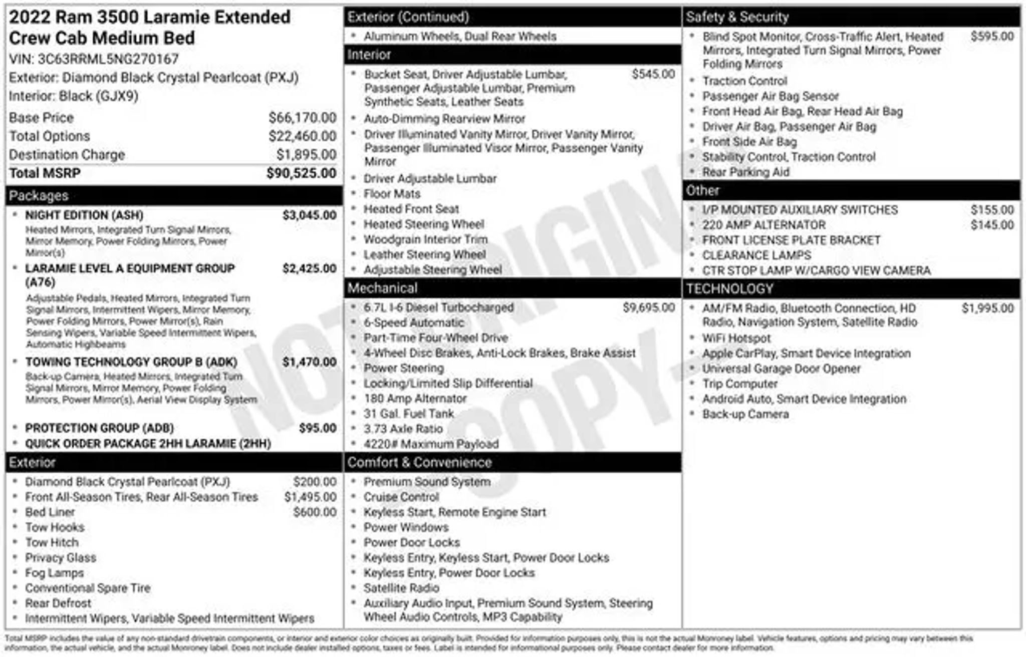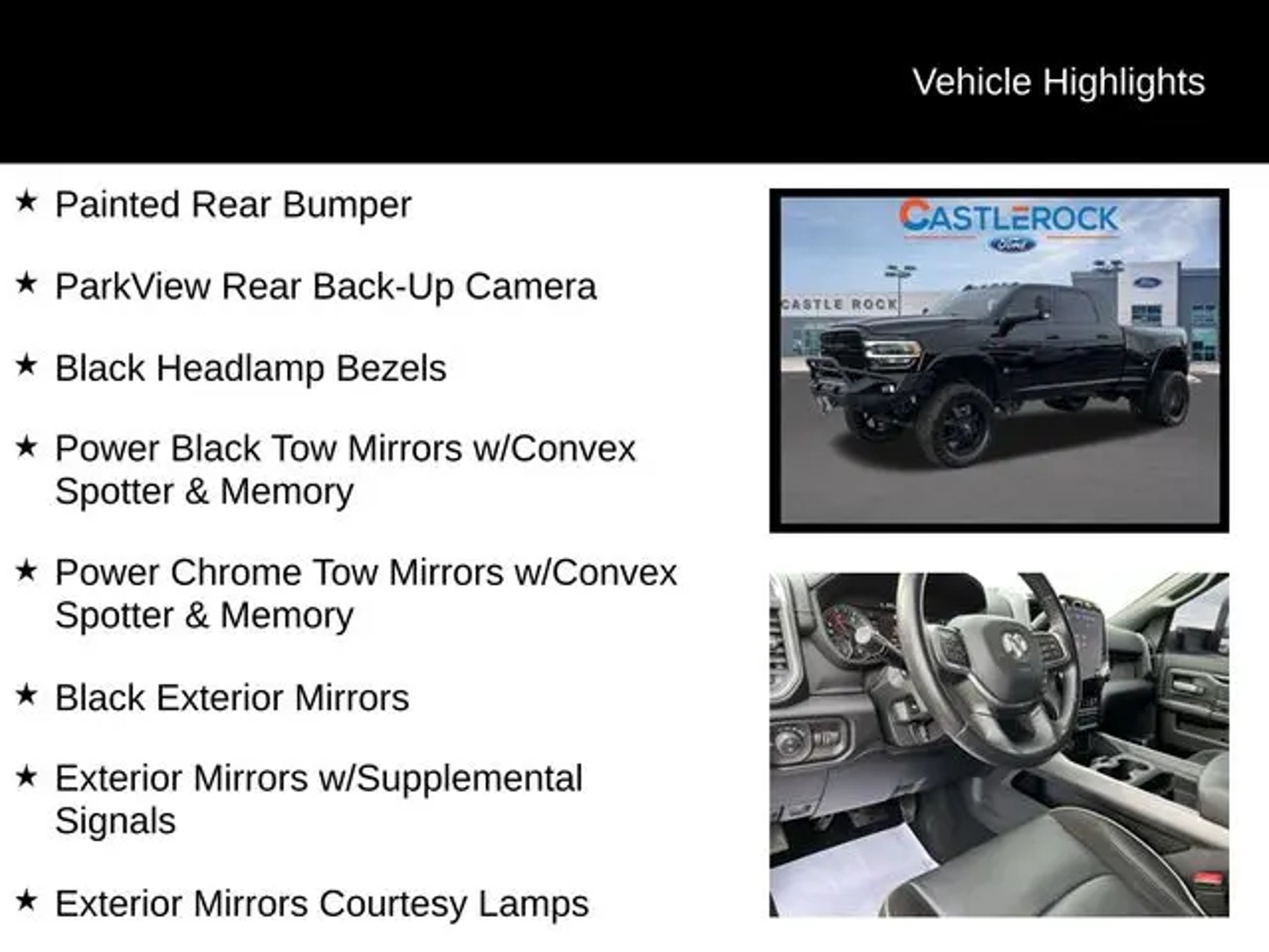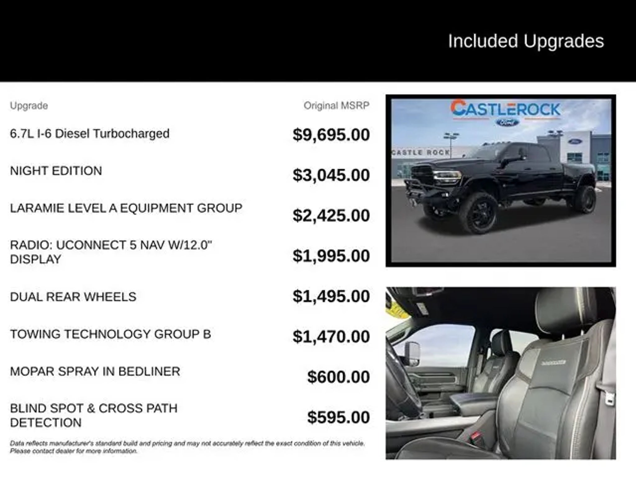 Elevate your driving experience with this exceptional 2022 Ram 3500 Laramie. This powerful and versatile pickup is designed to conquer any challenge you face, whether it's hauling heavy loads or navigating rugged terrain. Boasting a commanding presence, this Ram 3500 Laramie features: "¢ Cummins 6.7L I6 Turbodiesel engine "¢ 6-Speed Automatic transmission "¢ 4-Wheel Drive "¢ Dual Rear Wheels "¢ MOPAR Spray-In Bedliner "¢ Blind Spot & Cross Path Detection "¢ Towing Technology Group B "¢ Night Edition "¢ Laramie Level A Equipment Group The interior of this Ram 3500 Laramie is equally impressive, with premium leather-trimmed bucket seats, power-adjustable pedals with memory, and a 12-inch Uconnect 5 navigation system with a stunning display. Stay connected and entertained with features like Alexa Built-In, SiriusXM with 360L, and a surround-view camera system. This truck's exceptional capabilities are further enhanced by its advanced safety features, including Blind Spot & Cross Path Detection, Trailer Reverse Guidance, and a Surround View Camera System. You'll navigate with confidence, whether towing a heavy trailer or maneuvering through tight spaces. Designed to handle the most demanding tasks, this 2022 Ram 3500 Laramie is the perfect companion for your rugged lifestyle. Experience the power, comfort, and technology that set this truck apart from the rest. Elevate your driving experience and discover the exceptional capabilities of this 2022 Ram 3500 Laramie. Visit CASTLE ROCK FORD or call for your V.I.P. appointment at . Price does not include Tax, Title and Fees.