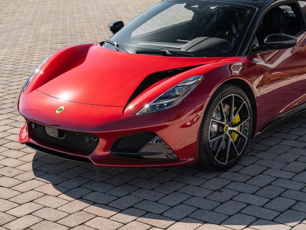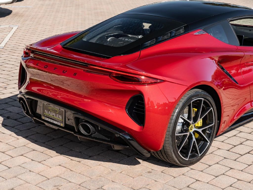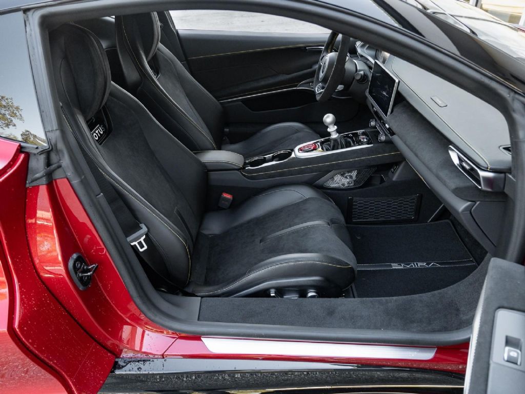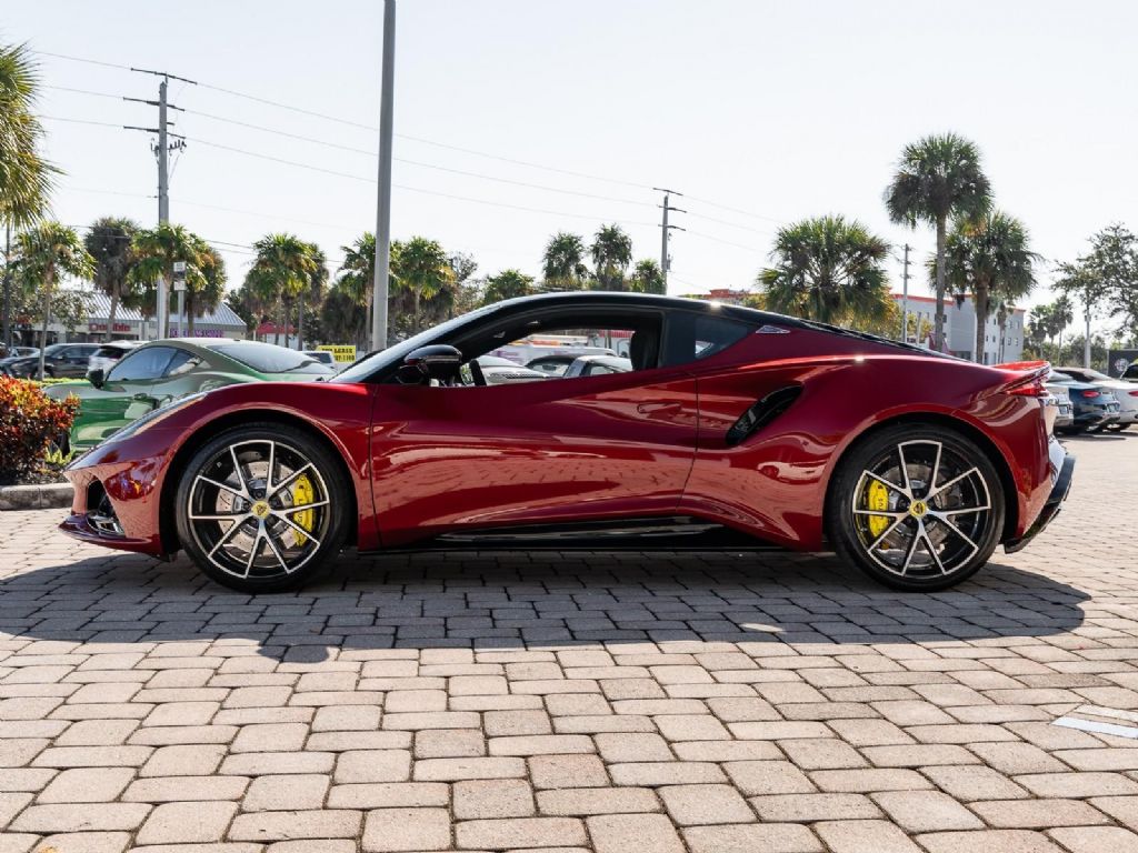 This 2026 Lotus Emira V6 SE represents the definitive analogue configuration of Lotus's final internal combustion sports car, powered by a mid-mounted 3.5-liter supercharged V6 engine that produces 400 hp and 310 lb-ft of torque . This version is defined by its driver-centric 6-speed manual transmission, which for the 2026 model year features a new compression mount to provide significantly more precise and mechanical gear changes, further showcasing the iconic semi-exposed gear linkage at the base of the console. With a curb weight of approximately 3,280 lbs, the V6 SE manual sprints from 0 to 60 mph in roughly 4.2 seconds and can reach a top speed of 180 mph . Presented in a classic Magma Red over a luxurious Black leather interior, the 2026 SE trim also benefits from revised suspension damping and wheel alignment for enhanced cornering stability, along with an optimized cooling system designed to shed weight and handle the thermal demands of sustained track use. Options: - Magma Red - Touring Suspension - Full Black Pack - Yellow Brake Calipers - 20 V Spoke Diamond Turned Silver & Gloss Black - Black Alcantara with Yellow Stitch Interior Materials - Black Alcantara Steering Wheel with Yellow TDC and Stitching - Alcantara headliner - Yellow and Black Nose Badge and Center Caps - KEF Premium Audio - Goodyear Eagle F1 Supersport - Sport Pedals