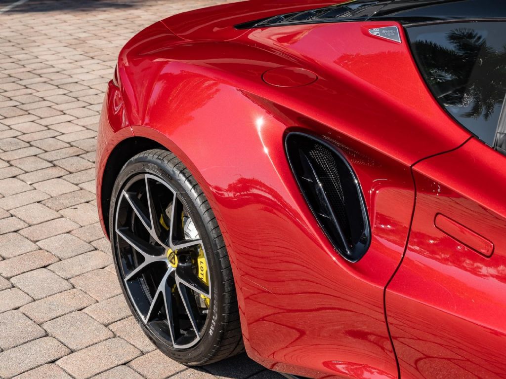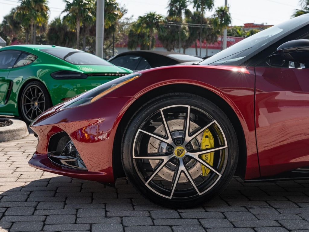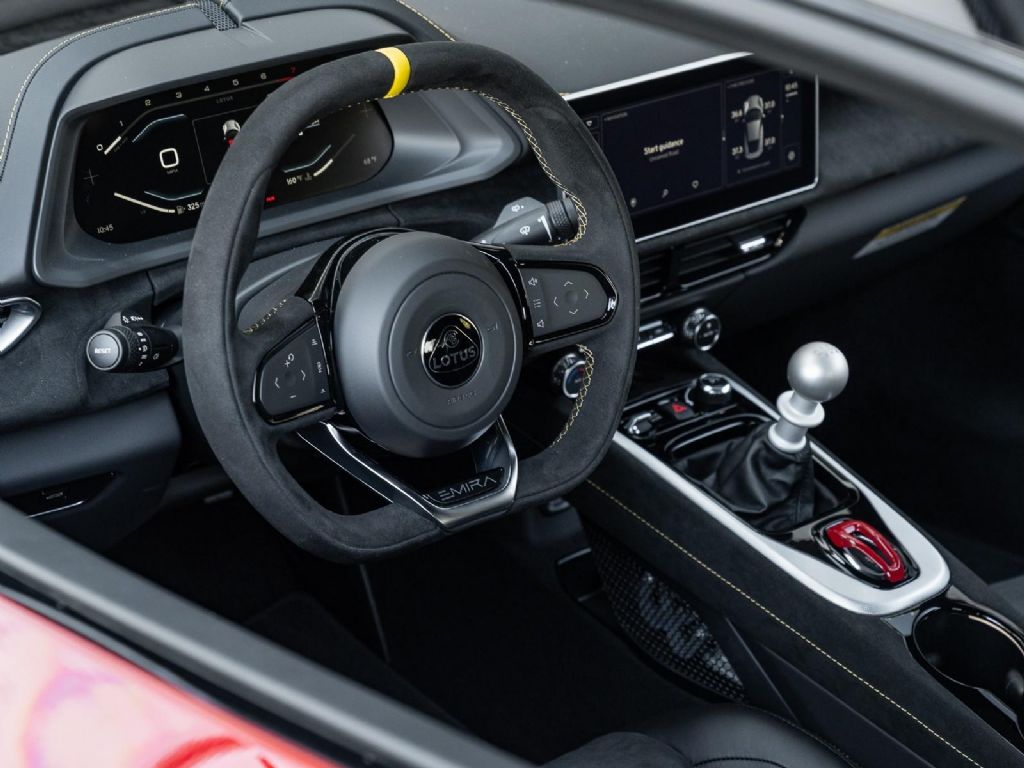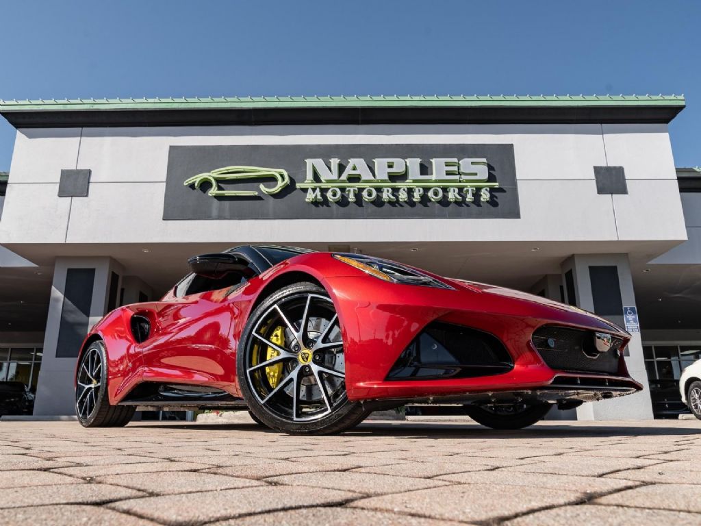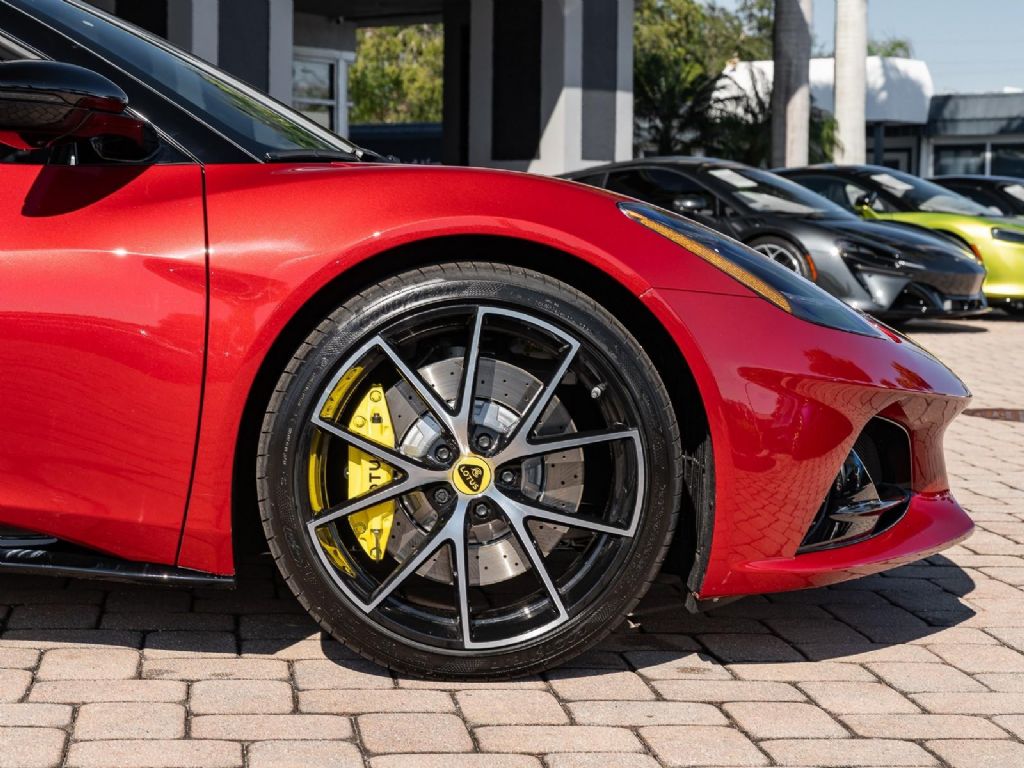 This 2026 Lotus Emira V6 SE represents the definitive analogue configuration of Lotus's final internal combustion sports car, powered by a mid-mounted 3.5-liter supercharged V6 engine that produces 400 hp and 310 lb-ft of torque . This version is defined by its driver-centric 6-speed manual transmission, which for the 2026 model year features a new compression mount to provide significantly more precise and mechanical gear changes, further showcasing the iconic semi-exposed gear linkage at the base of the console. With a curb weight of approximately 3,280 lbs, the V6 SE manual sprints from 0 to 60 mph in roughly 4.2 seconds and can reach a top speed of 180 mph . Presented in a classic Magma Red over a luxurious Black leather interior, the 2026 SE trim also benefits from revised suspension damping and wheel alignment for enhanced cornering stability, along with an optimized cooling system designed to shed weight and handle the thermal demands of sustained track use. Options: - Magma Red - Touring Suspension - Full Black Pack - Yellow Brake Calipers - 20 V Spoke Diamond Turned Silver & Gloss Black - Black Alcantara with Yellow Stitch Interior Materials - Black Alcantara Steering Wheel with Yellow TDC and Stitching - Alcantara headliner - Yellow and Black Nose Badge and Center Caps - KEF Premium Audio - Goodyear Eagle F1 Supersport - Sport Pedals