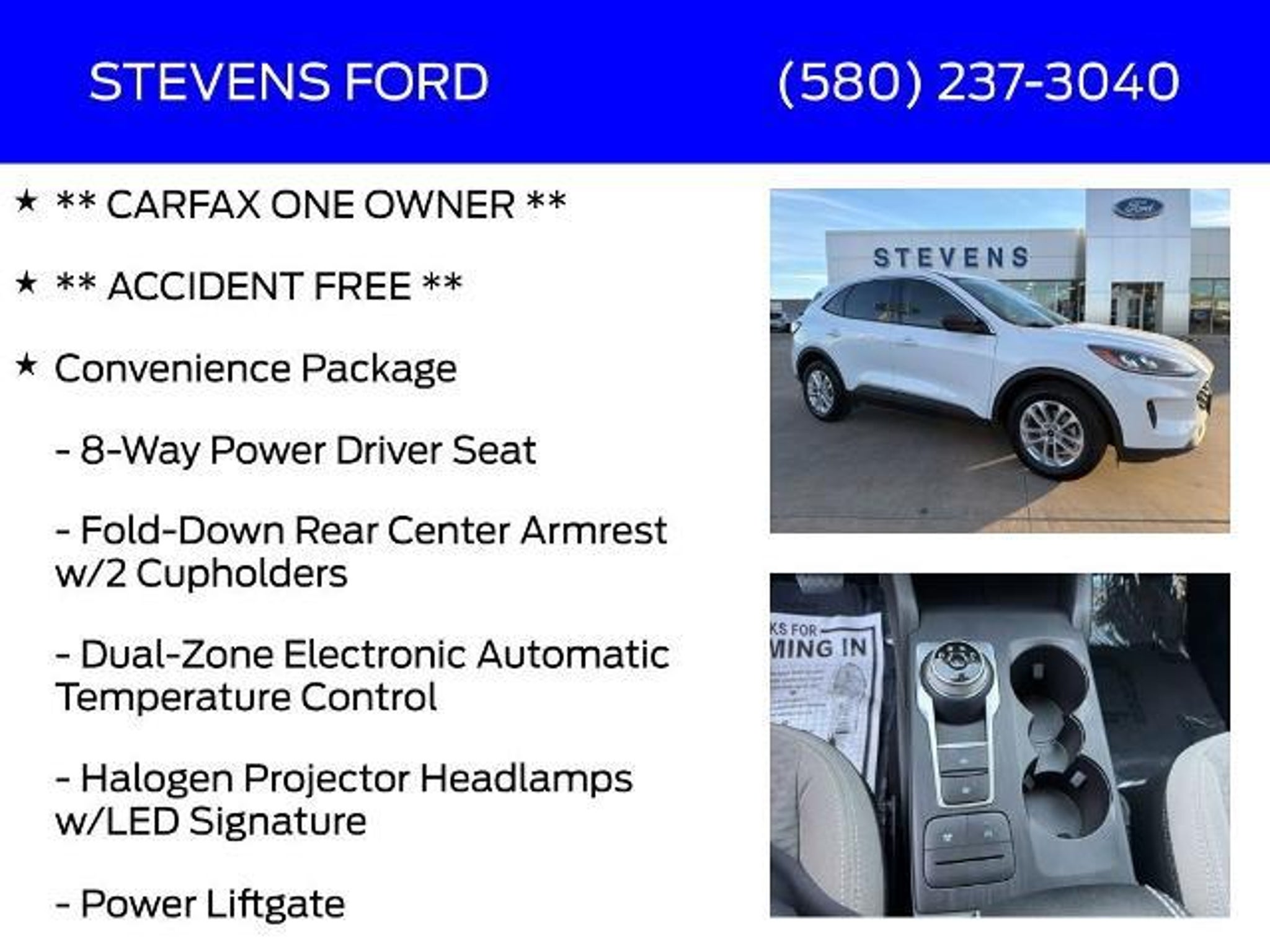 Details > 2022 Ford Escape SE 4DR SUV For Sale in Enid, OK Private Party Sellers Click here to place your ad now! You auta tell them you saw the ad in AutaBuy when you call or email. 1/34 2/34 3/34 4/34 5/34 6/34 7/34 8/34 9/34 10/34 11/34 12/34 13/34 14/34 15/34 16/34 17/34 18/34 19/34 20/34 21/34 22/34 23/34 24/34 25/34 26/34 27/34 28/34 29/34 30/34 31/34 32/34 33/34 34/34 View 34 Photos View All Add to My Garage Parked in Your Garage! Stevens Ford Contact Seller: I would like to: Make Offer Check Availability Ask A Question Request More Photos Check Financing Options Send a copy of this message to me Add this listing to my garage Send to Mobile Mileage 22,660 Exterior Color Oxford White Interior Color Dark Earth Gray Doors 4 Engine 1.5L I3 Transmission 8 Speed Auto Stock # UU3897 VIN 1FMCU0G6XNUB50110 Estimated Monthly Payment $365 mo Apply Now J.J. Best Banc & Co. 2022 Ford Escape SE 4DR SUV Description: Always remember, at Stevens Ford Lincoln Mercury - We'll Beat Any Deal REGARDLESS! · Mileage: 22,660 · Color: Oxford White Price: $20,999. Mileage 22,660 Exterior Color Oxford White Interior Color Dark Earth Gray Doors 4 Engine 1.5L I3 Transmission 8 Speed Auto Stock # UU3897 VIN 1FMCU0G6XNUB50110 Estimated Monthly Payment $365 mo Apply Now J.J. Best Banc & Co. Add to My Garage Parked in Your Garage! Message Seller Stevens Ford Contact Seller: I would like to: Make Offer Check Availability Ask A Question Request More Photos Check Financing Options Send a copy of this message to me Add this listing to my garage Offered for sale by Stevens Ford ENID, OK Price: $20,999. Offered for sale by Stevens Ford ENID, OK [entire inventory] Ask Auta Intelligence How many of these were produced? What does this VIN number tell me? What safety features does this model offer? What trim levels were available for this model? What colors did these come in? Tell me about this model What transmission options did these offer? What kind of mileage do these get? How easy are parts to find for this model? What factory options were available on this model? How far is this from me? What engine options did these come with? Can you show me more suvs for a similar price? When was this model first introduced? Do you have a similar car to sell? List It Now! Questions about this car? Ask Auta Intelligence for production numbers, available options, etc. · Subscribe to AutaBuy! · Send a Gift Subscription Notice to a Friend