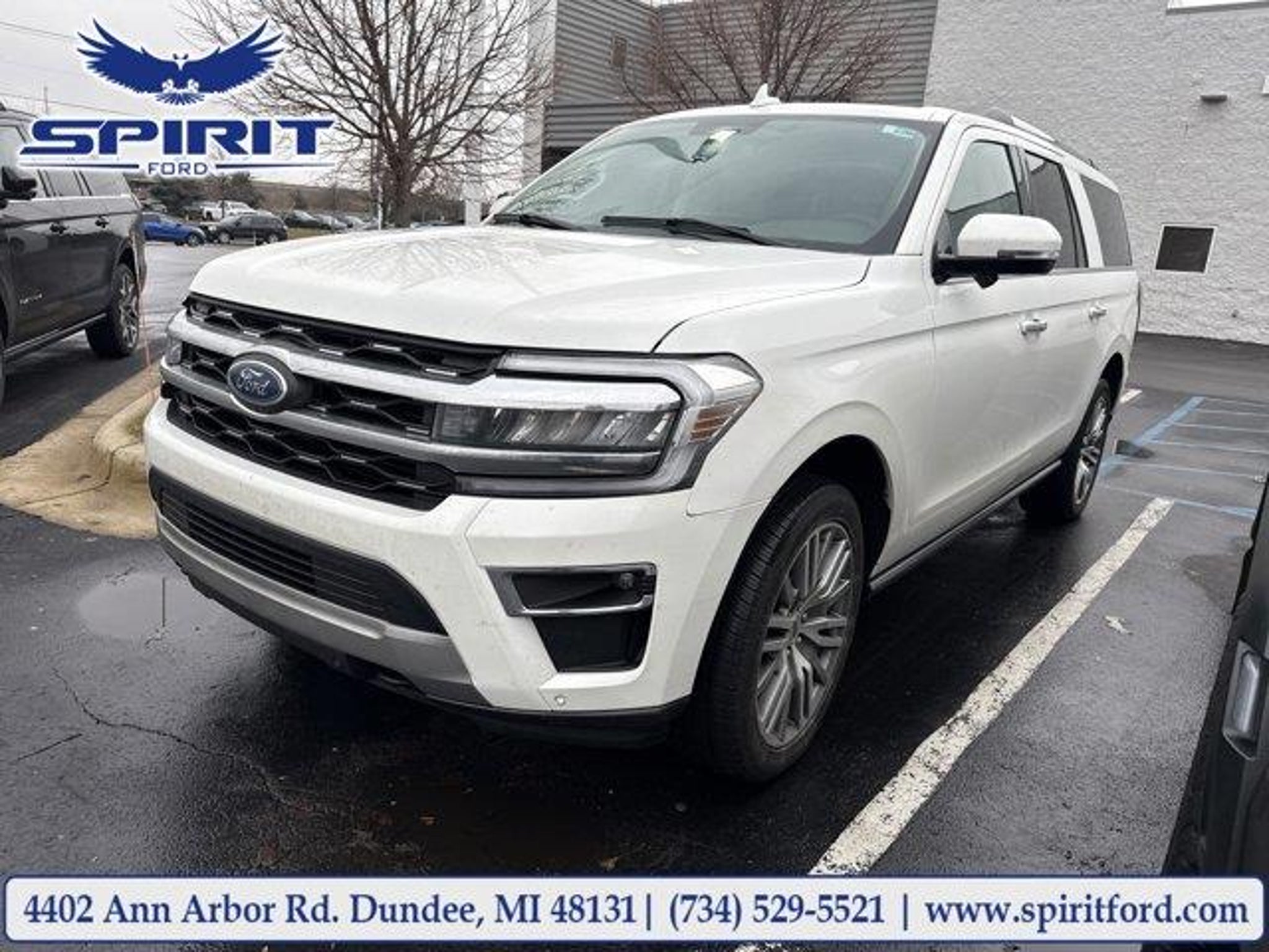 16/22 City/Highway MPGStar White Metallic Tri-Coat2023 Ford Expedition Max Limited 4WD10-Speed AutomaticEcoBoost 3.5L V6 GTDi DOHC 24V Twin TurbochargedClean Carfax, Local Trade!, Not a Rental Vehicle, Sunroof, HEATED SEATS, Balance of Manufacture Warranty Remaining, BLUETOOTH, HANDS FREE, Keyless Ignition/Push Button Start, LEATHER SEATS, NAVIGATION/GPS/NAVI, Expedition Max Limited, 4D Sport Utility, EcoBoost 3.5L V6 GTDi DOHC 24V Twin Turbocharged, 10-Speed Automatic, 4WD, Star White Metallic Tri-Coat, Sandstone w/ActiveX-Trimmed 1st & 2nd Row Seats or ActiveX-Trimmed 1st & 2nd Row Seats, 15.5 LCD Capacitive Touchscreen, 26mm Engine Radiator, 3.73 Axle Ratio, 360-Degree Camera w/Trailer Reverse Guidance, Ebony Black Mesh Grille, Equipment Group 302A High Package, Heavy-Duty Independent Suspension, Heavy-Duty Trailer Tow Package, Integrated Trailer Brake Controller, Magnetic-Painted Power Deployable Running Boards, Navigation system: Connected Navigation, Power-Folding Sideview Mirrors w/Autofold, Pro Trailer Backup Assist, Wheels: 22 12-Spoke Polished Aluminum.Clean CARFAX.Odometer is 34110 miles below market average!Located directly adjacent to US-23 at Exit 17. Spirit Ford is conveniently located just 15 minutes from Monroe, Ann Arbor and Toledo. We are just across the street from the largest Cabela's store in the state. Please call or visit us today at (734) 529-5521 for more information on this vehicle.Open 24 hours at www.spiritfordofdundee.com. Spirit Ford serves all nearby cities including Milan, Monroe, Deerfield, Britton, Tecumseh, Carleton, Sylvania, Toledo, Ann Arbor, Ypsilanti, Adrian, Temperance, Lambertville, Petersburg, Saline, Maybee and Erie.
