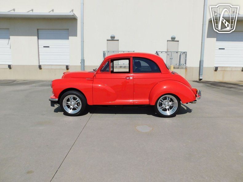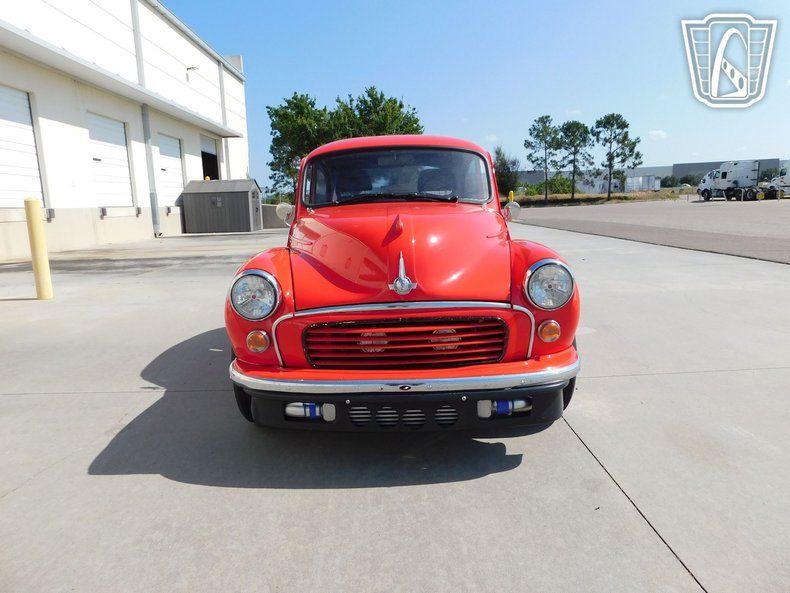 Gateway Classic Cars of Tampa is proud to present this Fast and Furious 1959 Morris Minor 1000! Anyone familiar with British automotive history knows the Morris was a staple of affordable motoring in the UK and it's former colonies. With over 1.5 million sold, the Minor was a sales success thanks to being compact practical and offering good value. No one would imagine a spend thrift's car as a hot rod, but that's what this Morris Minors' owner did. He saw the light compact body and rwd chassis and thought "I bet that'll make a for a fast ride". So he set off to make the Frankenstein monster of Frankenstein monsters! first the itty bitty 948cc 4 banger was tossed in the trash and a tuned, modern Mitsubishi 4G63, turbo engine from a 2008 EVO 8 was stuffed between the fenders. The 400hp hp is harnessed by 5 speed manual from a 3rd Gen RX7, that sends power to a 9" Ford axle with 3.73 gears! Under the body a 85 Datsun 750 mini-truck chassis serves provides the chassis while the suspension was fortified with a Mustang II front end and coil-overs shocks at all four corners. Disk brakes yank this thing to a stop front and rear. Staggered Chip Foose wheels wrapped in sticky rubber keep this Turbo powered go-kart sunny side up, and cold AC, racing seats, and power windows ensure you're safe and comfy during the ride. This 1959 Morris is a riot! You definitely won't see yourself coming or going with this ride. Make this red rocket yours today!