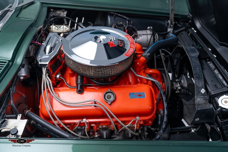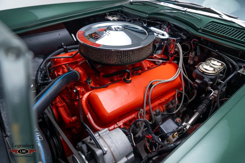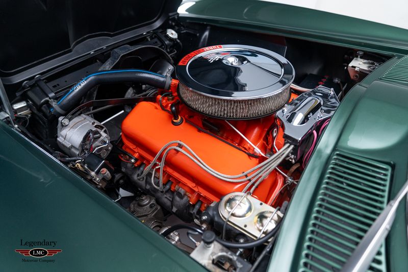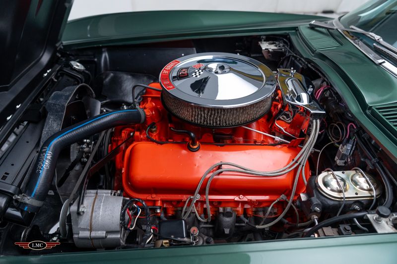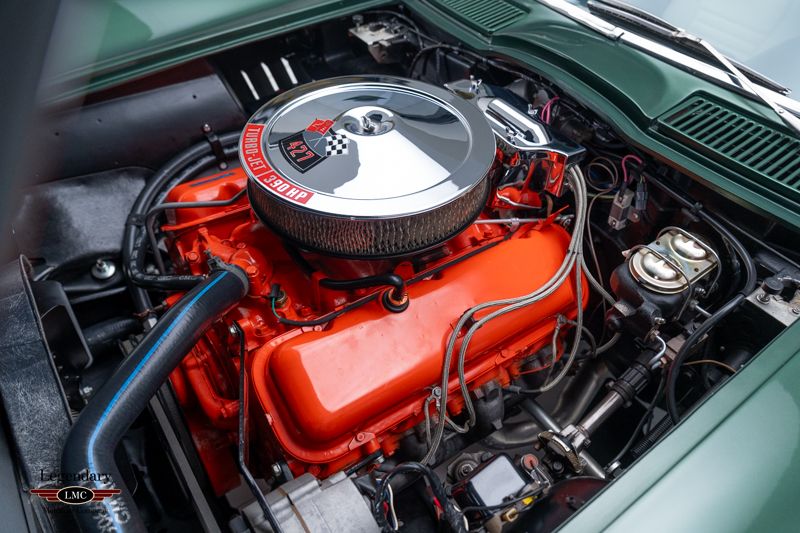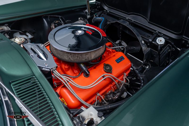 This exceptional Corvette represents a great example of correctness, authenticity, and restoration quality, earning the coveted NCRS National Top Flight Award along with two additional NCRS Chapter Top Flight Awards. A true benchmark example, this car has been painstakingly restored and validated to the highest standards of the National Corvette Restorers Society at the National level in which few cars have achieved. Under the legendary stinger hood lies the matching-numbers L36 427 cubic-inch big-block V8, factory rated at 390 horsepower, paired with its matching-numbers M21 close-ratio four-speed manual transmission. Finished in its factory-correct Goodwood Green (983AA) and accented by a striking white stinger hood, the exterior presents beautifully and authentically. The interior is trimmed in the correct White/Black vinyl (455AC), completing a highly desirable and period-correct color combination. This Corvette benefits from a fully documented, frame-off restoration, with extraordinary attention paid to factory finishes, components, and assembly details. The car retains its NCRS-verified tank sticker and Protect-O-Plate, further validating its authenticity. Factory options include tinted glass, a push-button AM/FM radio, and a Positraction rear axle with 3.55 gearing (355R). Correct Goodyear 7.75-15 bias-ply red stripe tires mounted on Rally wheels complete the authentic presentation. Accompanied by an impressive portfolio of NCRS judging sheets, awards, owner’s manuals, and detailed restoration documentation, this Corvette stands as a reference-level example—ideal for the most discerning collector seeking a no-compromise, investment-grade big-block Corvette with proven credentials and unquestionable provenance.