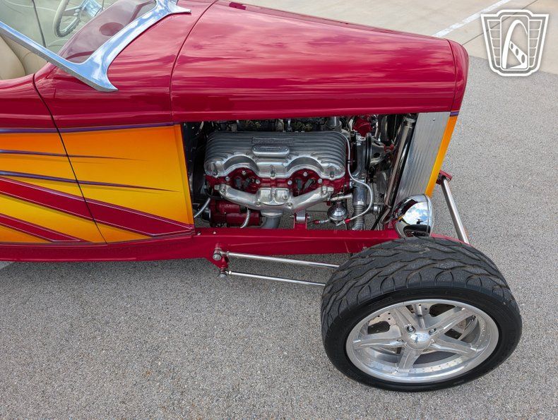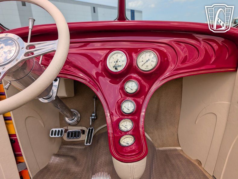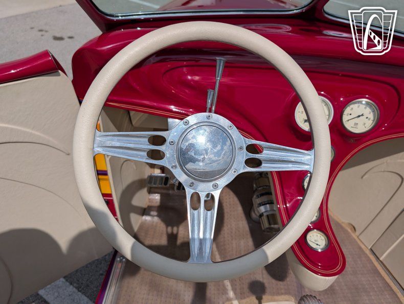 Gateway Classic Cars is proud to offer this stunning 1932 Ford Roadster that embodies a blend of classic design and modern performance. This iconic vehicle is presented in a cranberry exterior color and striking graphics that captures attention and admiration wherever it goes. A Duvall Chrome plated windshield. The rich hue of the bodywork is beautifully complemented by a luxurious cream leather interior, the 4" extended doors with remote opener for ease of access. A sophisticated and timeless aesthetic that is sure to appeal to enthusiasts and collectors alike.
