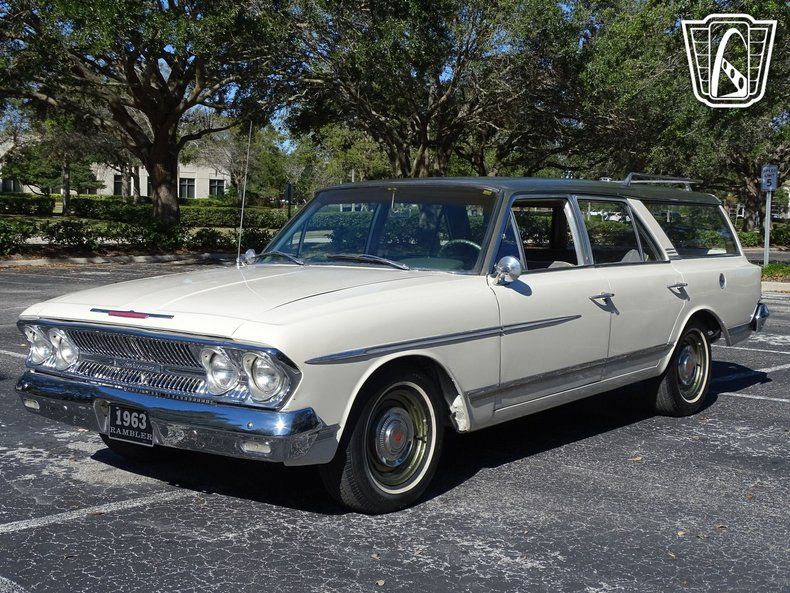 Gateway Classic Cars of Orlando is proud to present this beautiful 1963 Rambler Ambassador 990 wagon. Before minivans and SUVs all the cool moms were rolling around in full size station wagons. Beyond functional utility these cars oozed style and substance and perhaps the rarest of the 60s wagons was the Ambassador 990. This stylish wagon is painted in a white with a dark green roof contrasting handsomely. Take a walk around the vehicle and you'll notice nice details like the color keyed wheels, aluminum trim and roof luggage rack. Take a seat inside and you'll find a charming interior with plaid upholstery and a dashboard fit for a jet plane. Under the hood is a V8 and is paired with a 3 speed automatic. Imagine how this wagon can get up and go! If you're looking for a vintage family hauler that you don't see at just any car show, this is the one you want to own! Options include AM radio, power brakes, power steering, seat belts, cloth interior and radial tires.