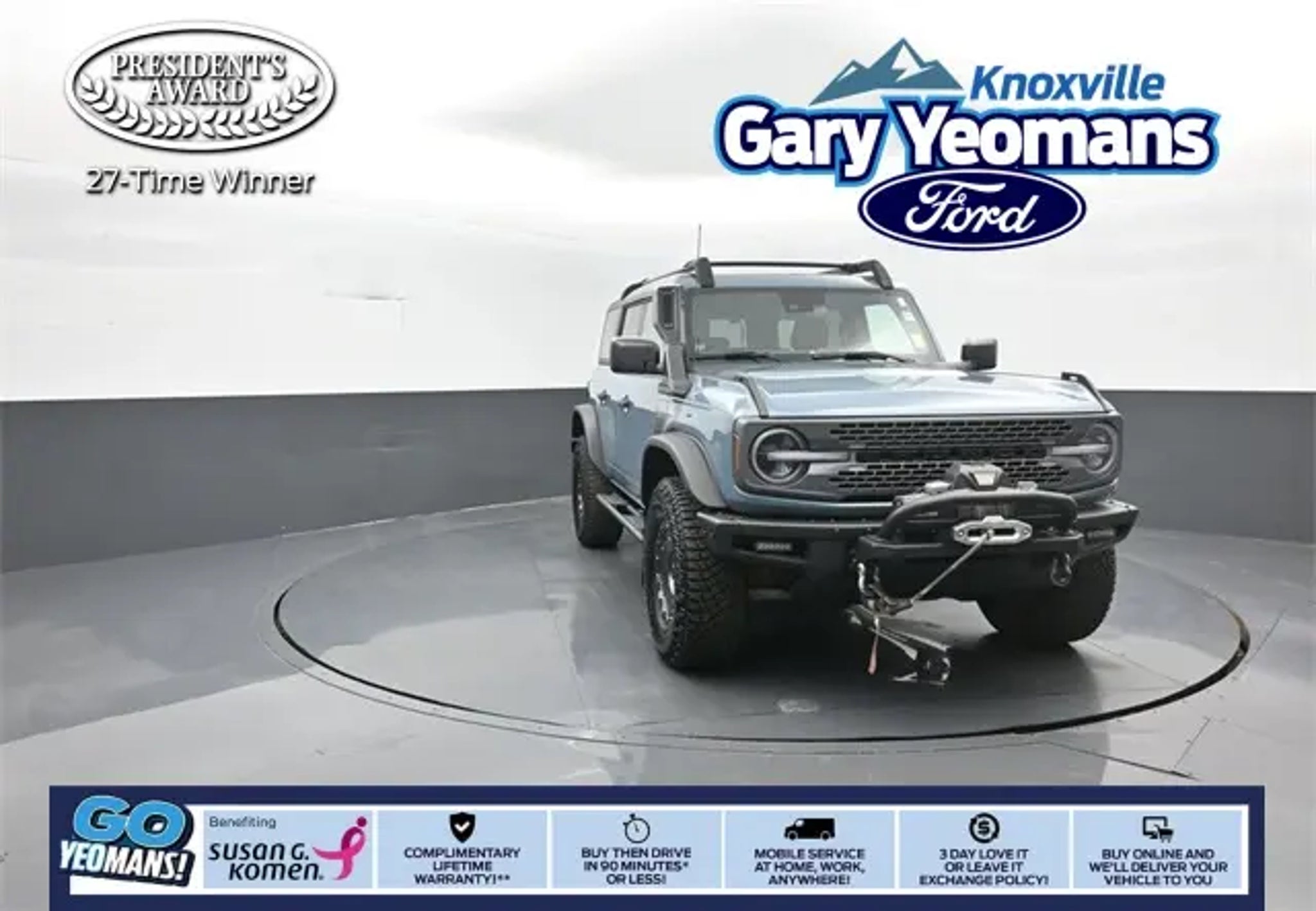 Certified. 2022 Ford Bronco Everglades Area 51 4WD 2.3L EcoBoost I-4 **INCLUDED FEATURES & OPTIONS: Equipment Group 922A Mid Package, Ford Blue Certified Certified, 4-Wheel Disc Brakes, 4.7 Axle Ratio, 6 Speakers, ABS brakes, Air Conditioning, Alloy wheels, AM/FM radio: SiriusXM with 360L, AM/FM Stereo, Auto High-beam Headlights, Auto-dimming Rear-View mirror, Automatic temperature control, Brake assist, Compass, Connected Navigation, Convertible HardTop, Convertible roof lining, Delay-off headlights, Driver door bin, Driver vanity mirror, Dual front impact airbags, Dual front side impact airbags, Electronic Stability Control, Emergency communication system: 911 Assist, Exterior Parking Camera Rear, Front anti-roll bar, Front Bucket Seats, Front Center Armrest, Front dual zone A/C, Front reading lights, Front wheel independent suspension, Fully automatic headlights, Glass rear window, Heated door mirrors, Heated front seats, Illuminated entry, Integrated roll-over protection, Leather Shift Knob, Low tire pressure warning, Marine Grade Vinyl Bucket Seats, Navigation system: Connected Navigation, Occupant sensing airbag, Outside temperature display, Overhead airbag, Overhead console, Panic alarm, Passenger door bin, Passenger vanity mirror, Power door mirrors, Power steering, Power windows, Radio data system, Rear Parking Sensors, Rear window defroster, Rear window wiper, Remote keyless entry, Security system, SiriusXM Radio w/360L, Speed control, Split folding rear seat, Steering wheel mounted audio controls, SYNC 4, Tachometer, Telescoping steering wheel, Tilt steering wheel, Traction control, Trip computer, Variably intermittent wipers, and Wheels: 17 Carbonized Gray-Painted Aluminum. Ford Blue Certified Details: * and 11,000 FordPass Rewards Points to use toward first maintenance visit * Transferable Warranty * Warranty Deductible: $100 * Vehicle History * Roadside Assistance * Limited Warranty: 3 Month/4,000 Mile (whichever comes first) after new car warranty expires or from certified purchase date * 139 Point Inspection At Gary Yeomans Ford Knoxville we offer Market Based Pricing, so please call to check on the availability of this vehicle. Awards: * NACTOY 2022 North American Utility of the Year