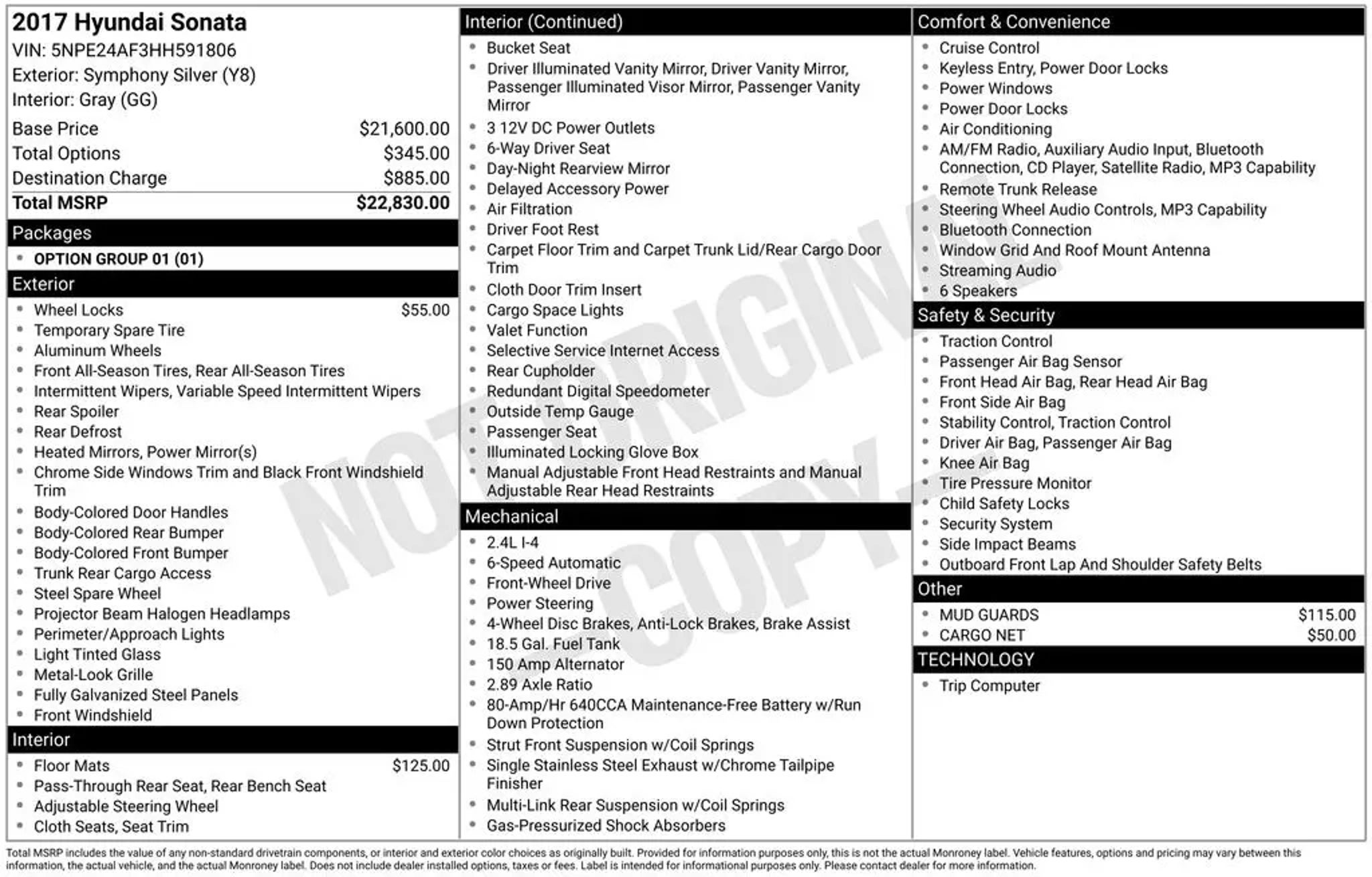 At Green Ford in Greensboro, NC, your peace of mind is everything. We know buying pre-owned is more than just selecting a vehicle"”it's placing your trust in us. That's why every used model on our lot is meticulously inspected, competitively priced, and comes with the comprehensive Green Ford Advantage. You'll enjoy our lifetime limited powertrain warranty, Two complimentary maintenance performed right here by our expert technicians. Need to drop off your vehicle? Take advantage of our complimentary pickup & delivery or Ford Mobile Service, where we'll come to you. At Green Ford, earning your confidence isn't just our goal"”it's the foundation of everything we do. Call today for details. *Local Trade*, Gray Cloth, Alloy wheels, AM/FM radio: SiriusXM, CD player, Power door mirrors, Power windows, Remote keyless entry, Speed control, Telescoping steering wheel, Tilt steering wheel. 2017 Hyundai Sonata 2017 Hyundai Sonata Base Symphony Silver Awards: * 2017 KBB.com 10 Most Comfortable Cars Under $30,000 * 2017 KBB.com 10 Best Used Cars Under $20,000 * 2017 KBB.com Best Family Sedans * 2017 KBB.com 10 Best Sedans Under $25,000 * 2017 KBB.com 10 Most Awarded Cars * 2017 KBB.com 10 Most Awarded Brands Equipped with Option Group 01, Gray Cloth, Alloy wheels, AM/FM radio: SiriusXM, CD player, Power door mirrors, Power windows, Remote keyless entry, Speed control, Telescoping steering wheel, Tilt steering wheel, 16 x 6.5J Aluminum Alloy Wheels, 4-Wheel Disc Brakes, 6 Speakers, ABS brakes, Air Conditioning, Brake assist, Bumpers: body-color, Cargo Net, Carpeted Floor Mats, Driver door bin, Driver vanity mirror, Dual front impact airbags, Dual front side impact airbags, Electronic Stability Control, Four wheel independent suspension, Front anti-roll bar, Front Bucket Seats, Front Center Armrest, Front reading lights, Heated door mirrors, Illuminated entry, Knee airbag, Low tire pressure warning, Mud Guards, Occupant sensing airbag, Outside temperature display, Overhead airbag, Overhead console, Panic alarm, Passenger door bin, Passenger vanity mirror, Power steering, Radio: AM/FM/SiriusXM/CD/MP3 Audio System, Rear anti-roll bar, Rear seat center armrest, Rear window defroster, Security system, Speed-sensing steering, Speed-Sensitive Wipers, Split folding rear seat, Spoiler, Steering wheel mounted audio controls, Tachometer, Traction control, Trip computer, Variably intermittent wipers, Wheel Locks, and YES Essentials Premium Cloth Seating Surfaces *Vehicle must be 8 model years or newer and Under 80,000 miles to qualify for the Lifetime Powertrain Warranty, also excludes Commercial Sales, European Makes, Diesels, Modified and SVT vehicles. The price displayed is an internet only price. To obtain this sale price you must print out this ad and present it to the sales professional when you arrive at the dealership. All Green Ford/Lincon internet Prices include a $1000.00 discount for financing with Lincoln Financial or Ford Credit Services. To obtain this discount your credit must qualify for Lincoln Financial or Ford Credit Services Financing.Prices also include trade discount of $1000, to obtain this discount you must trade in a 2018 or newer vehicle with less than 100,000 miles.