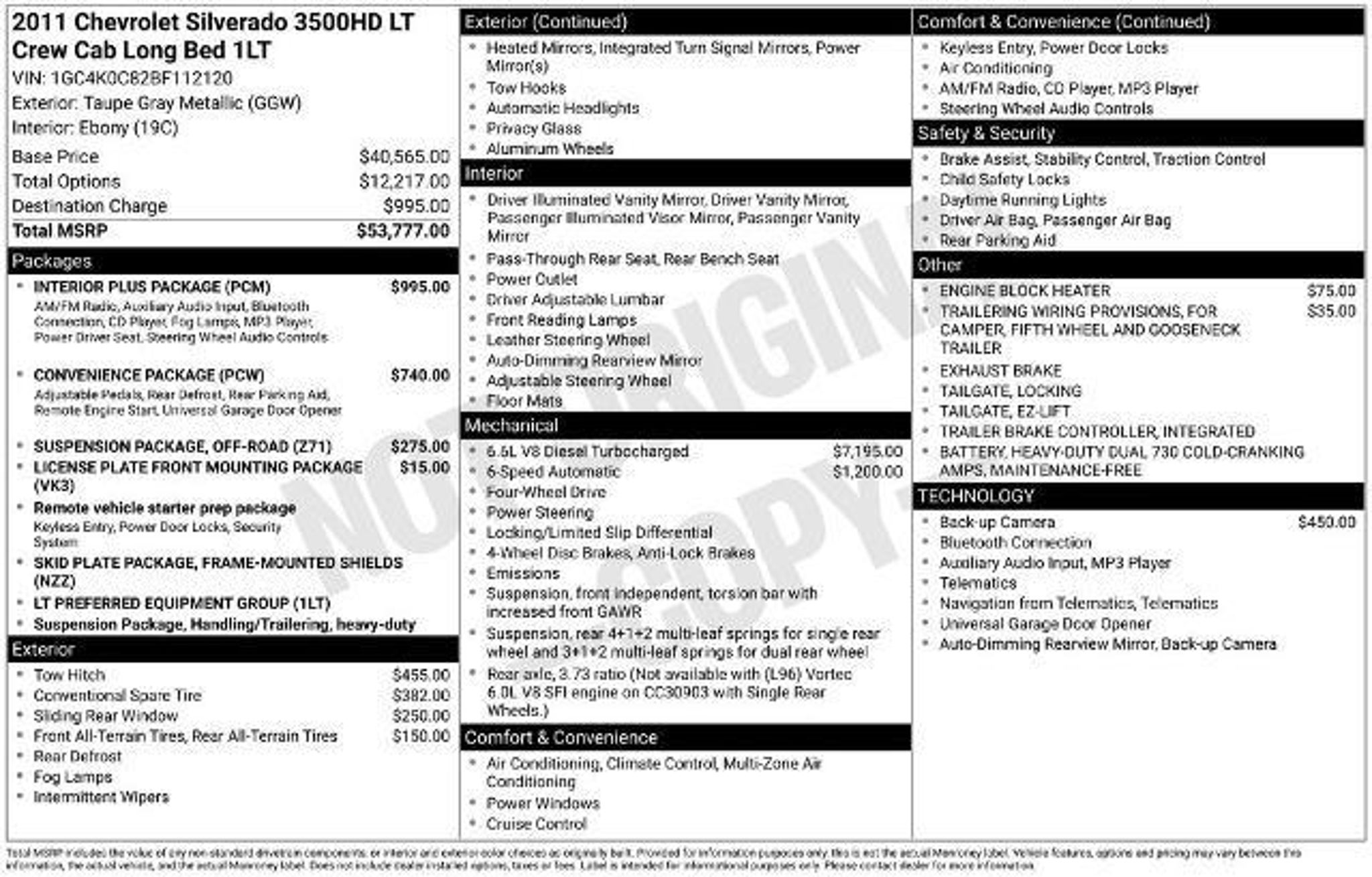 FRESH TRADE !!! This 2011 Chevrolet Silverado 3500HD LT is a true workhorse, built to handle any task you throw its way. With a fresh oil change, this heavy-duty truck is ready to take on your toughest jobs. - Fresh Oil Change - WINDOW, POWER, REAR SLIDING - ENGINE BLOCK HEATER - 6.6L V8 Diesel Turbocharged Duramax; B20-DIESEL COMPATIBLE - ALLISON 1000, ELECTRONICALLY CONTROLLED 6-Speed Automatic Transmission - INTERIOR PLUS PACKAGE - CONVENIENCE PACKAGE - SUSPENSION PACKAGE, OFF-ROAD - TRAILERING EQUIPMENT, HEAVY-DUTY - TIRE, SPARE LT265/70R18E ALL-TERRAIN This Silverado 3500HD is equipped with a powerful Duramax 6.6L V8 Turbodiesel engine, mated to a smooth-shifting Allison 1000 6-speed automatic transmission. With 765 lb-ft of torque, you'll have the muscle to tow your heaviest loads with ease. The off-road suspension package and heavy-duty trailering equipment make this truck a true workhorse, ready to handle any terrain or towing task. Inside, the Silverado 3500HD LT offers a wealth of premium features, including a rearview camera system, rear parking assist, and a convenient power sliding rear window. The interior plus package adds even more comfort and convenience with a 6-way power driver's seat, steering wheel-mounted audio controls, and a premium audio system. Whether you're hauling a trailer, navigating rough job sites, or simply enjoying a comfortable ride, this Silverado 3500HD LT is up to the task. With its impressive capabilities and well-appointed interior, this truck is the perfect blend of power and refinement. Don't miss your chance to experience the versatility and capability of this exceptional Silverado 3500HD. Visit our showroom today and let us put you behind the wheel of this impressive heavy-duty truck. Price excludes tax, title, license fee, government fees, and $449 dealer documentary service fee. While every reasonable effort is made to ensure accuracy, we are not responsible for errors or omissions. Vehicles may be sold prior to inquiry. Please contact dealer to confirm availability. Vehicles listed as 'Not in Stock' may be available within a reasonable timeframe, not to exceed one week. All financing is subject to approved credit. Check out our 5 Star Google Reviews! Drive a little save a lot.