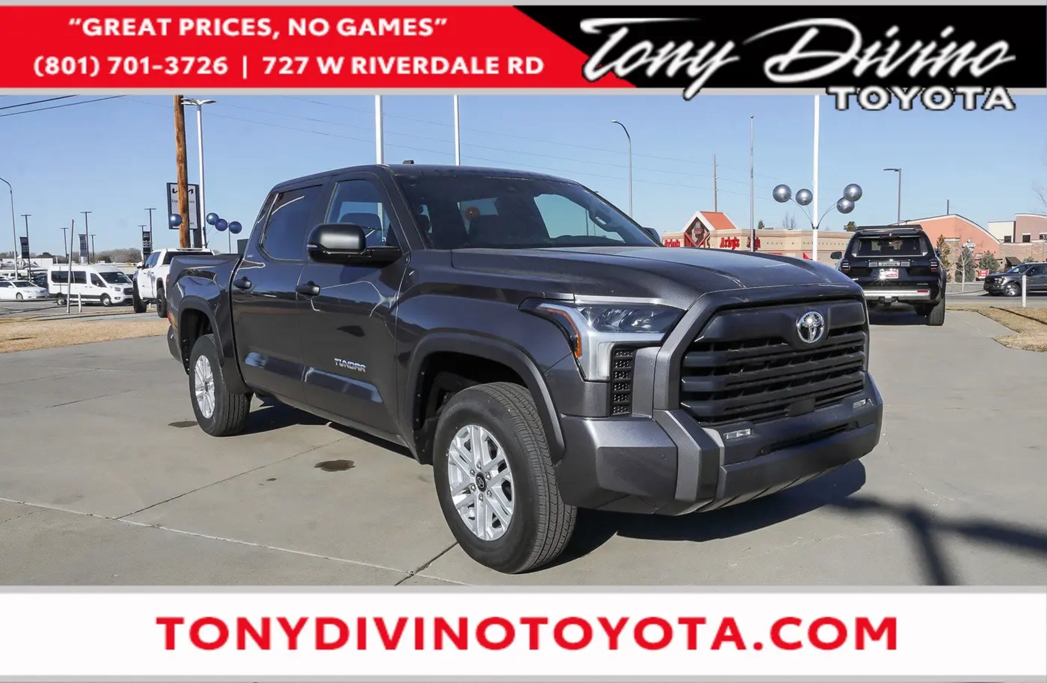 Only 200 Miles! Delivers 22 Highway MPG and 17 City MPG! This Toyota Tundra 4WD delivers a Twin Turbo Regular Unleaded V-6 3.4 L/210 engine powering this Automatic transmission. SR5 CONVENIENCE PACKAGE -inc: 122L Fuel Tank, Blind Spot Monitor w/Lane Change Assist, Parking Support Alert/Brake, HEATED POWER BLACK OUTSIDE MIRRORS -inc: LED turn signal, Blind Spot Monitor, ALL WEATHER FLOOR LINERS (TMS). This Toyota Tundra 4WD Features the Following Options Wheels w/Silver Accents, Vehicle Stability Control (VSC) Electronic Stability Control (ESC), Variable Intermittent Wipers, Urethane Gear Shifter Material, Trip Computer, Transmission: 10-Speed Electronic Controlled Auto -inc: intelligence (ECT-i), sequential shift mode, uphill/downhill shift logic and TOW/HAUL driving modes, Transmission w/Driver Selectable Mode and Oil Cooler, Trailer Wiring Harness, Tires: 265/70R18, Tire Pressure Monitor System (TPMS) Low Tire Pressure Warning. Visit Us Today For a must-own Toyota Tundra 4WD come see us at Tony Divino Toyota|777 West Riverdale Rd, Riverdale, UT 84405. Just minutes away! * Estimated Monthly Payment will depend on vehicle make and model and will be determined upon actual vehicle inspection. All payments are estimates. Tax, title, registration and documentation fee ($349) are extra.* While every reasonable effort is made to ensure the accuracy of this information, we are not responsible for any errors or omissions contained on these pages. Please verify any information in question with Tony Divino Toyota.