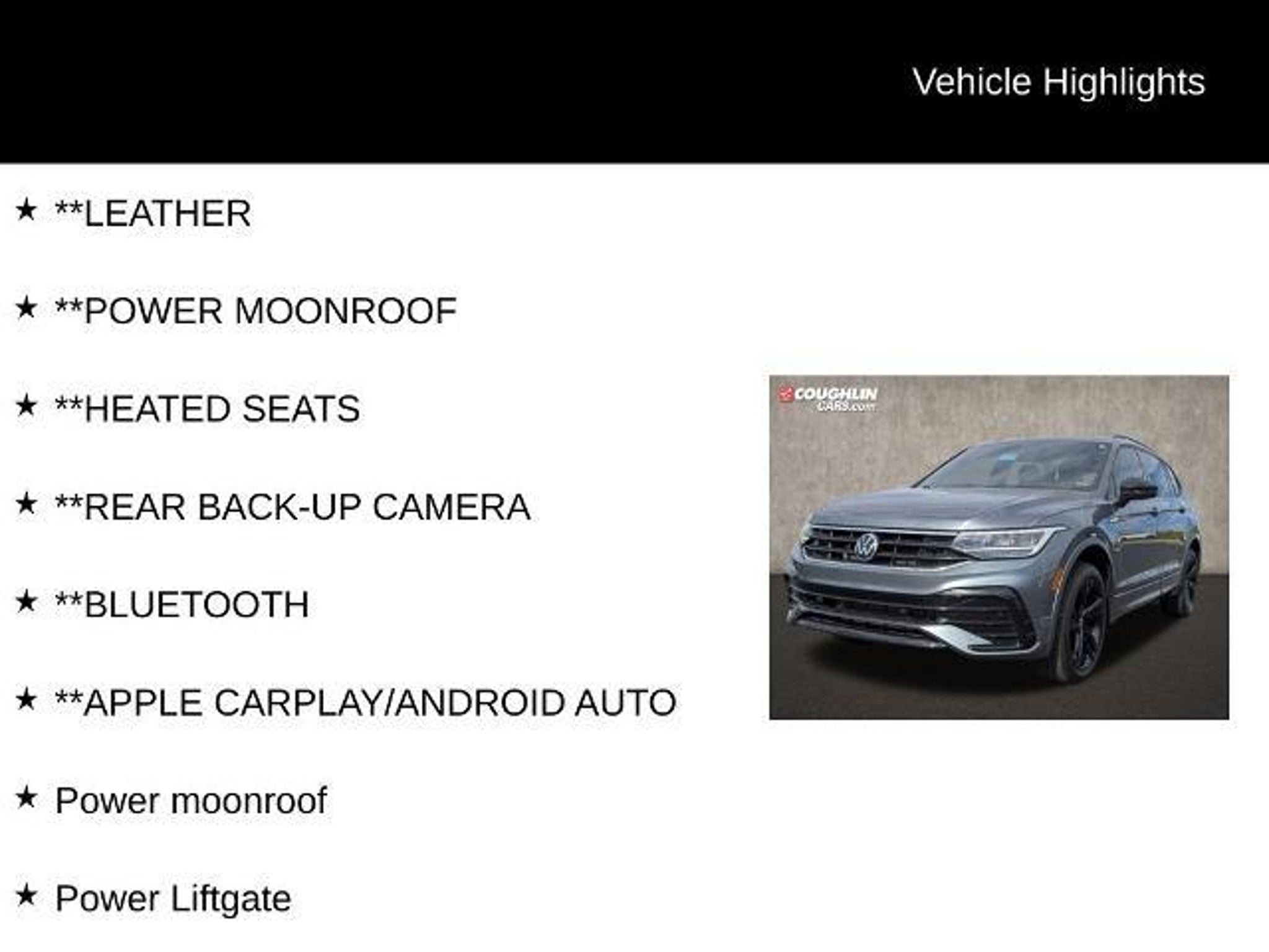 LOWEST PRICES IN COLUMBUS, MARYSVILLE, AND CENTRAL OHIO!! Please call 937-642-0015 for availability. This stunning 2023 Volkswagen Tiguan 2.0T SE R-Line Black is a true standout in its class. With its sleek Platinum Gray Metallic exterior and a wealth of premium features, this Tiguan is the perfect blend of style, performance, and convenience. Let's dive into what makes this vehicle so exceptional. - Fully Detailed - Clean History Report - Leather - Power Moonroof - Heated Seats - Rear Back-Up Camera - Bluetooth - Apple CarPlay/Android Auto Under the hood, this Tiguan is powered by a robust 2.0L TSI DOHC engine, paired with an 8-Speed Automatic with Tiptronic transmission and Volkswagen's renowned 4MOTION all-wheel-drive system. This powertrain delivers an impressive balance of power and efficiency, with an EPA-estimated 21 mpg in the city and 28 mpg on the highway. The interior of this Tiguan is equally impressive, with perforated V-Tex leatherette seating surfaces, a power liftgate, and a panoramic power moonroof that floods the cabin with natural light. The heated front seats and dual-zone automatic climate control ensure your comfort, while the Composition Media infotainment system with Apple CarPlay and Android Auto integration keeps you connected and entertained. Safety is also a top priority, with features like the Rear View Camera, Forward Collision Warning, and Blind Spot Monitor providing added peace of mind. The Tiguan's sophisticated 4-Wheel Independent Suspension and Speed-Sensing Steering further enhance the driving experience, delivering a smooth and responsive ride. Whether you're commuting to work, embarking on a road trip, or navigating the daily tasks of life, this 2023 Volkswagen Tiguan 2.0T SE R-Line Black is the perfect companion. With its impressive blend of style, technology, and capability, it's sure to exceed your expectations. Free Car Fax available. Pricing excludes tax, title fee ($35), documentary fee ($387), Thanks for visiting www.coughlincars.com.