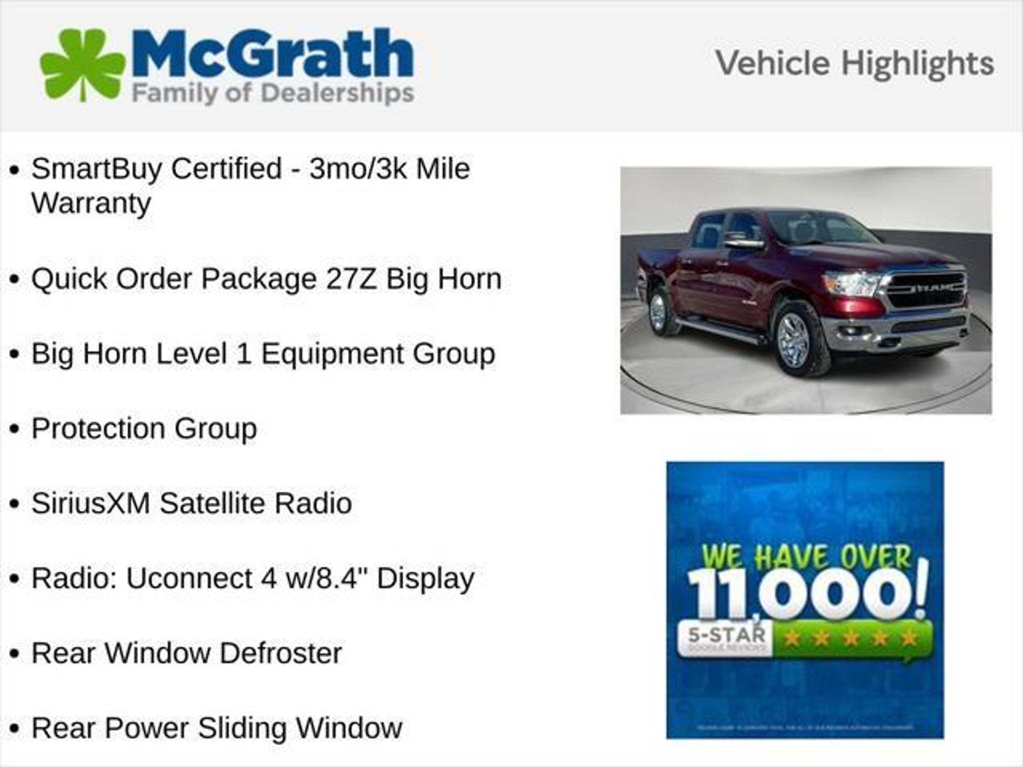 Details > 2020 RAM 1500 4X4 Big Horn 4DR Crew Cab 5.6 FT. SB Pickup For Sale in Dubuque, IA Private Party Sellers Click here to place your ad now! You auta tell them you saw the ad in AutaBuy when you call or email. 1/30 2/30 3/30 4/30 5/30 6/30 7/30 8/30 9/30 10/30 11/30 12/30 13/30 14/30 15/30 16/30 17/30 18/30 19/30 20/30 21/30 22/30 23/30 24/30 25/30 26/30 27/30 28/30 29/30 30/30 View 30 Photos View All Add to My Garage Parked in Your Garage! Mcgrath Hyundai of Dubuque Contact Seller: I would like to: Make Offer Check Availability Ask A Question Request More Photos Check Financing Options Send a copy of this message to me Add this listing to my garage Send to Mobile Mileage 74,650 Exterior Color Delmonico Red Pearlcoat Interior Color Diesel Gray/Black Doors 4 Engine 5.7L V8 Transmission 8 Speed Auto Stock # N14236 VIN 1C6SRFFT4LN236636 Estimated Monthly Payment $539 mo Apply Now J.J. Best Banc & Co. 2020 RAM 1500 4X4 Big Horn 4DR Crew Cab 5.6 FT. SB Pickup Description: Mcgrath Hyundai Of Cedar Rapids · Mileage: 74,650 · Color: Delmonico Red Pearlcoat Price: $30,995. Mileage 74,650 Exterior Color Delmonico Red Pearlcoat Interior Color Diesel Gray/Black Doors 4 Engine 5.7L V8 Transmission 8 Speed Auto Stock # N14236 VIN 1C6SRFFT4LN236636 Estimated Monthly Payment $539 mo Apply Now J.J. Best Banc & Co. Add to My Garage Parked in Your Garage! Message Seller Mcgrath Hyundai of Dubuque Contact Seller: I would like to: Make Offer Check Availability Ask A Question Request More Photos Check Financing Options Send a copy of this message to me Add this listing to my garage Offered for sale by Mcgrath Hyundai of Dubuque DUBUQUE, IA Price: $30,995. Offered for sale by Mcgrath Hyundai of Dubuque DUBUQUE, IA [entire inventory] Ask Auta Intelligence When was this model first introduced? How many of these were produced? What trim levels were available for this model? How far is this from me? What factory options were available on this model? What colors did these come in? How many 1500s were produced in Red? What transmission options did these offer? Where is this located? Can you show me more pickups/trucks for a similar price? What engine options did these come with? Tell me more about this model How easy are parts to find for this model? What does this VIN number tell me? What size tires does this run from the factory? What kind of mileage do these get? What's the typical towing capacity in this configuration? Do you have a similar car to sell? List It Now! Questions about this car? Ask Auta Intelligence for production numbers, available options, etc. · Subscribe to AutaBuy! · Send a Gift Subscription Notice to a Friend