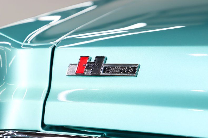 INTERIOR: Inside the door jambs are as slick as the exterior. The weatherstrips and sill plates were also replaced. The Turquoise Morrokide interior adds to this car's unique appeal, that's a color you really don't see often. We were told the upholstery is original! I do know that the door panels and armrests have been replaced and everything else is in remarkable overall condition. The seats don't have any rips or tears. The gauge bezel has really nice wood trim, all the gauges are in wonderful shape, and very easy to read too. It has a working clock, original heater controls and radio. The dash has been beautifully repainted the correct way with a satin finish on the top for glare reduction and a glossy finish on the bottom for more appeal. The kick panels are in excellent condition and the turquoise carpet looks fresh. The deluxe steering wheel looks to be a brand new reproduction. The center console was nicely refurbished and the Hurst 4-speed shifter puts the driver in command of the power.
