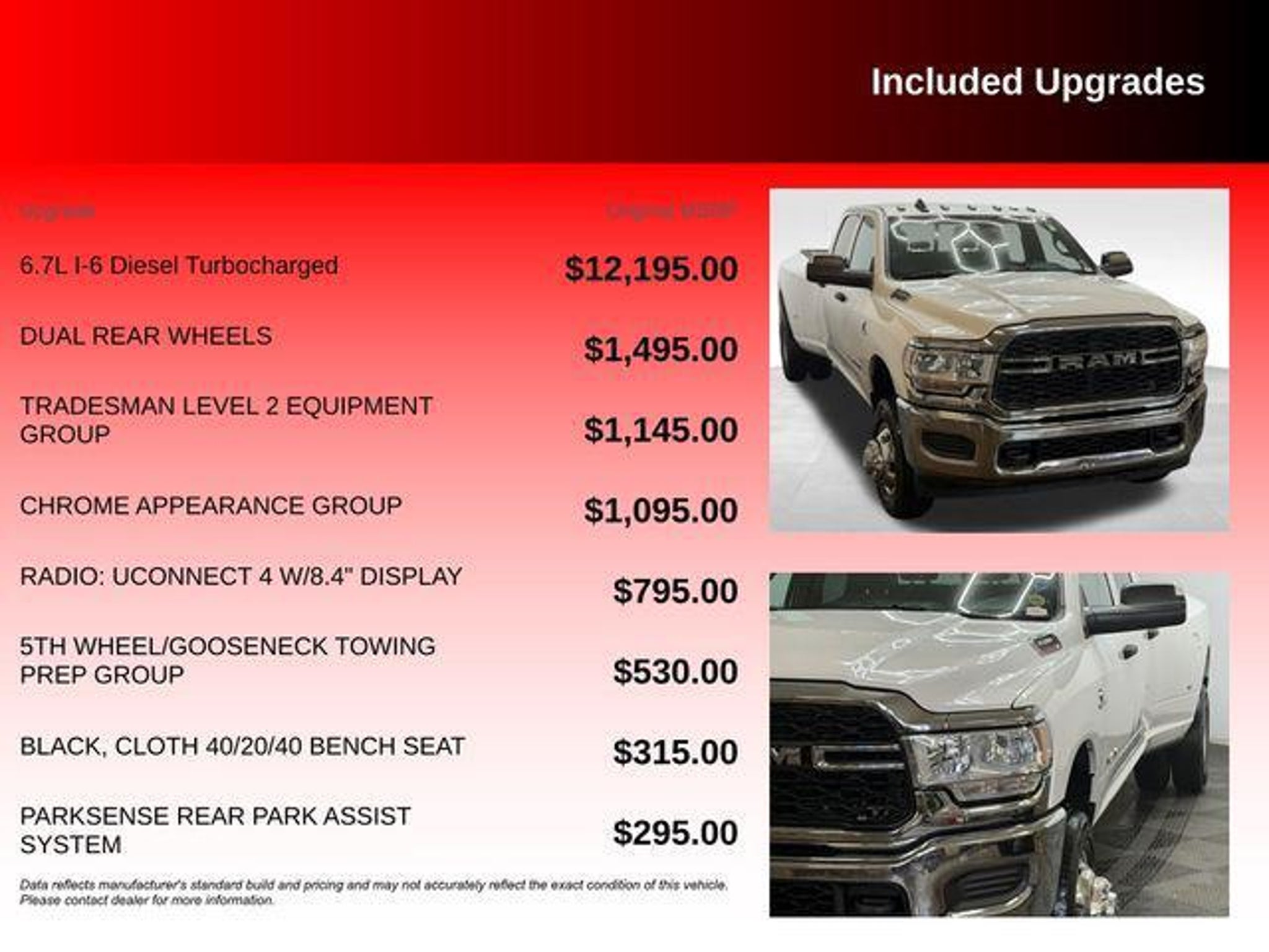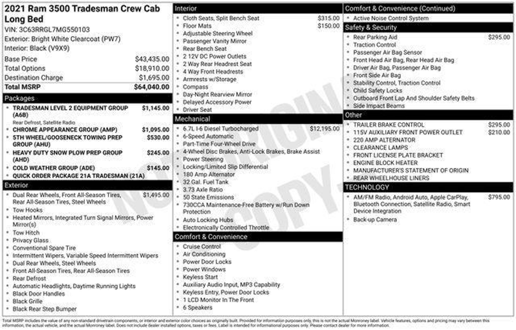 2021 Bright White Clearcoat 4D Crew Cab Ram 3500 Tradesman 6.7L I6 4WD 2 Way Rear Headrest Seat, 220 Amp Alternator, 4 Way Front Headrests, 40/20/40 Split Bench Seat, Bright Front Bumper, Bright Rear Bumper, Carpet Floor Covering, Chrome Appearance Group, Chrome Grille Surround, Cloth 40/20/40 Bench Seat, Cold Weather Group, Engine Block Heater, For More Info, Call|Front Armrest w/Cupholders, Heavy Duty Snow Plow Prep Group, Manual Adjust 4-Way Driver Seat, Manual Adjust 4-Way Front Passenger Seat, Matte Black Mesh w/Chrome Grille, MOPAR Winter Front Grille Cover, Quick Order Package 21A Tradesman, Rear Folding Seat, Rear Power Sliding Window, Rear Window Defroster, SiriusXM Radio Service, SiriusXM Satellite Radio, Tradesman Level 2 Equipment Group. Priced below KBB Fair Purchase Price! Clean CARFAX. CARFAX One-Owner. Odometer is 8523 miles below market average!